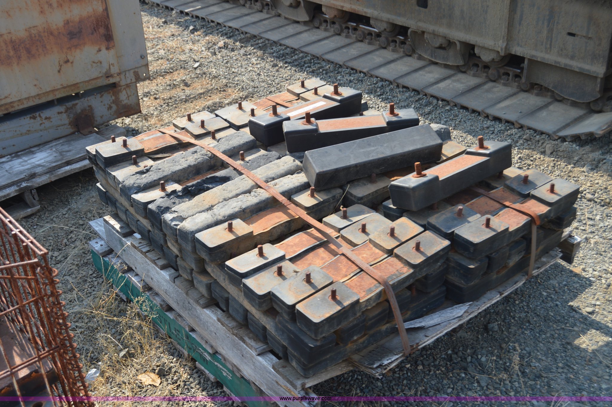 Purple Wave is selling a used Industrial Tires or Tracks in Washington. This item is a Approximately 80 rubber track pads for excavator with the following: 10" bolt spacing, 3" x 17 3/4"