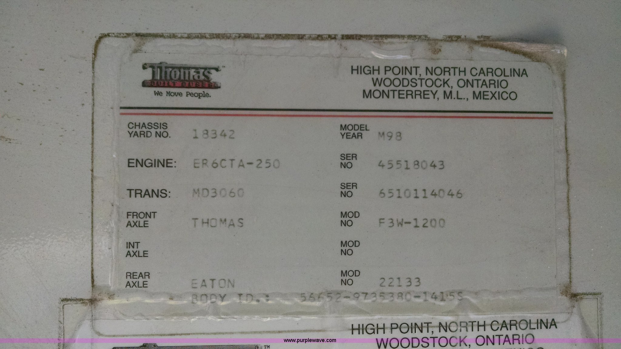 Take a look at this used 1998 Thomas Built school bus being sold on October 29th, 2014 in the SOLD! October 29 Vehicles and Equipment Auction made by Thomas Built. Take a look at all of the item information below or take a look at similar auctions for Transit Vehicles.