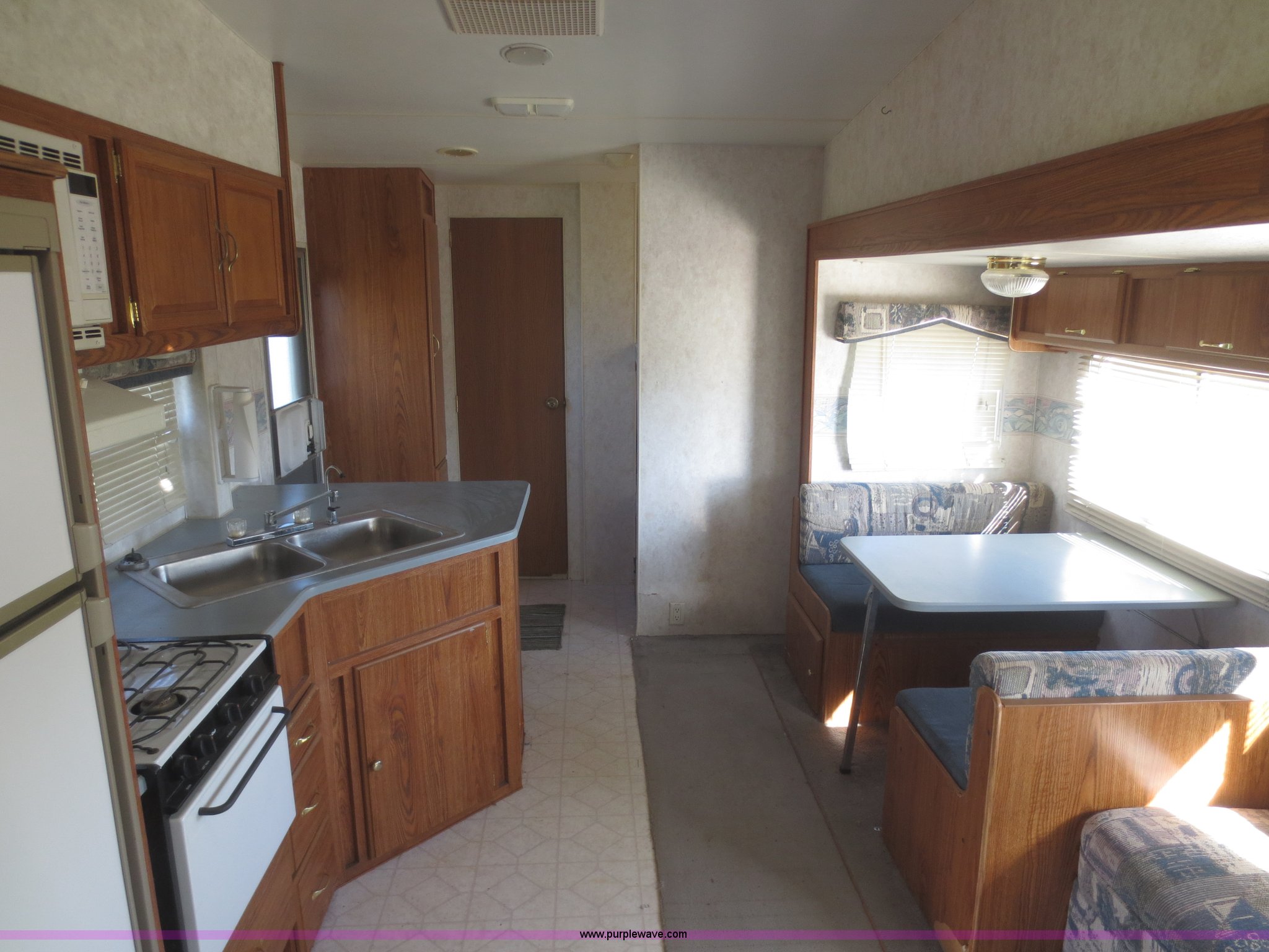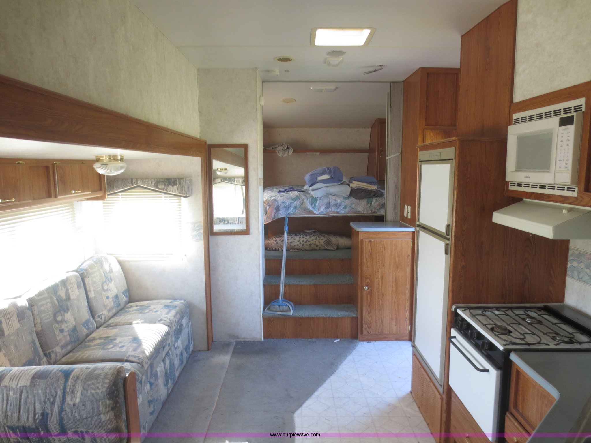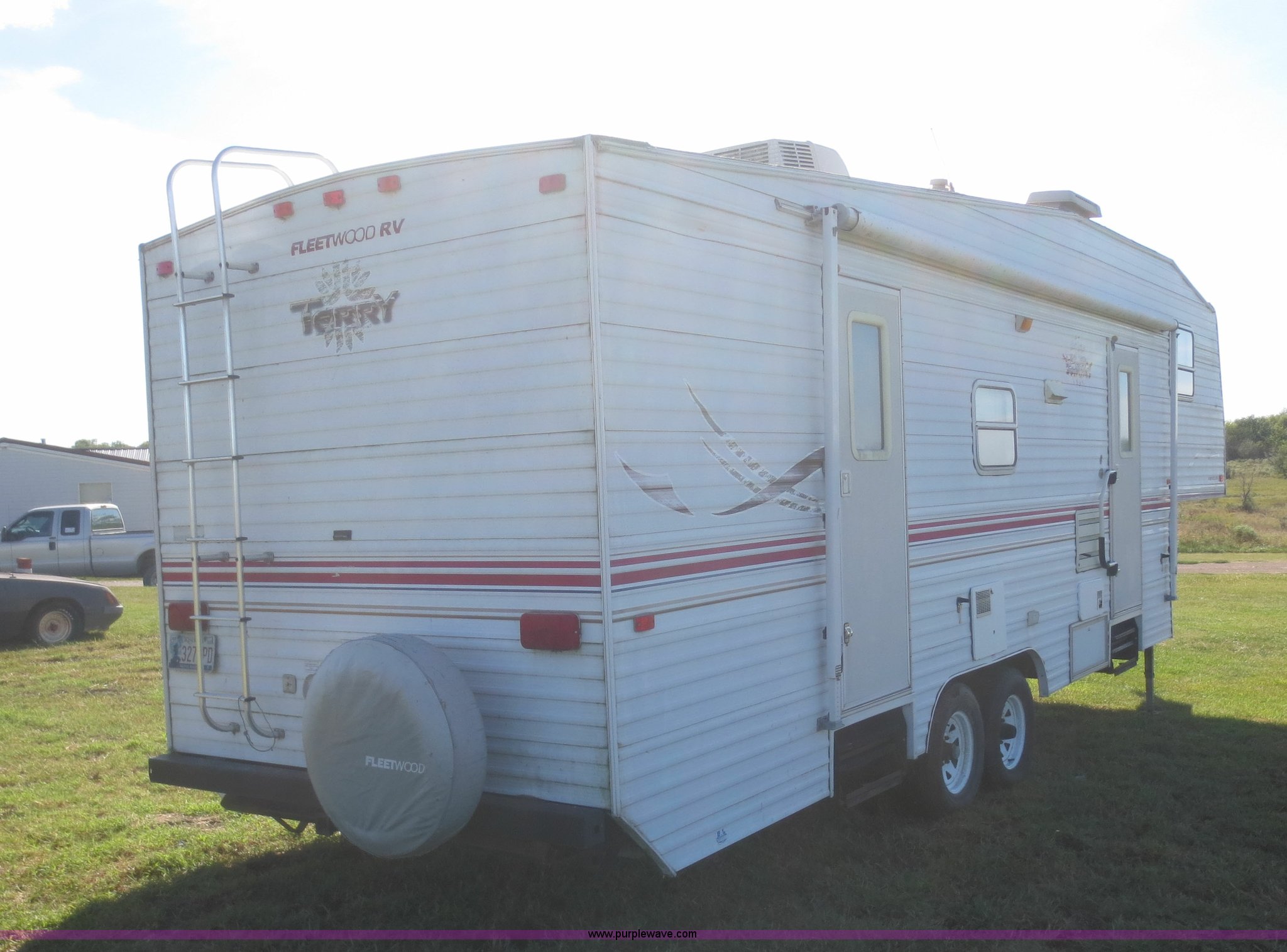 Purple Wave is selling a used RV in Oklahoma. This item is a 2000 Fleetwood 2855 Terry RV with the following: 28'L, 30 amp, AC, Central heat, AM/FM/cassette, (2) 30 lbs propane tanks, Dura Glide 13' slide-out, Dual entry doors, 18' awning, Sofa sleeper, Booth turns into bed, Seven passenger sleeping capacity, Three burner stove, Samsung microwave, Rear bunk beds