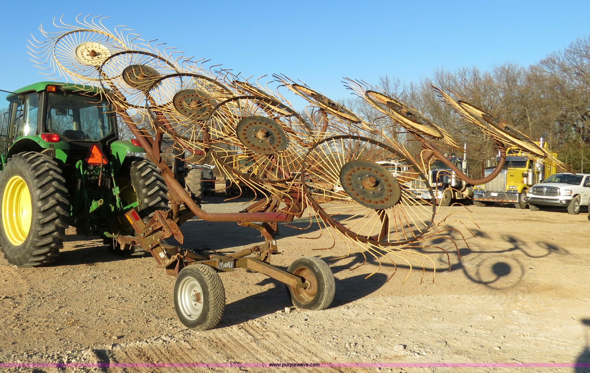 Purple Wave is selling a used Hay Rake in Oklahoma. This item is a M&W ER10 wheel rake with the following: (10) wheels, Hydraulic raise and lower, Pin hitch, 15" tires, Serial 101064