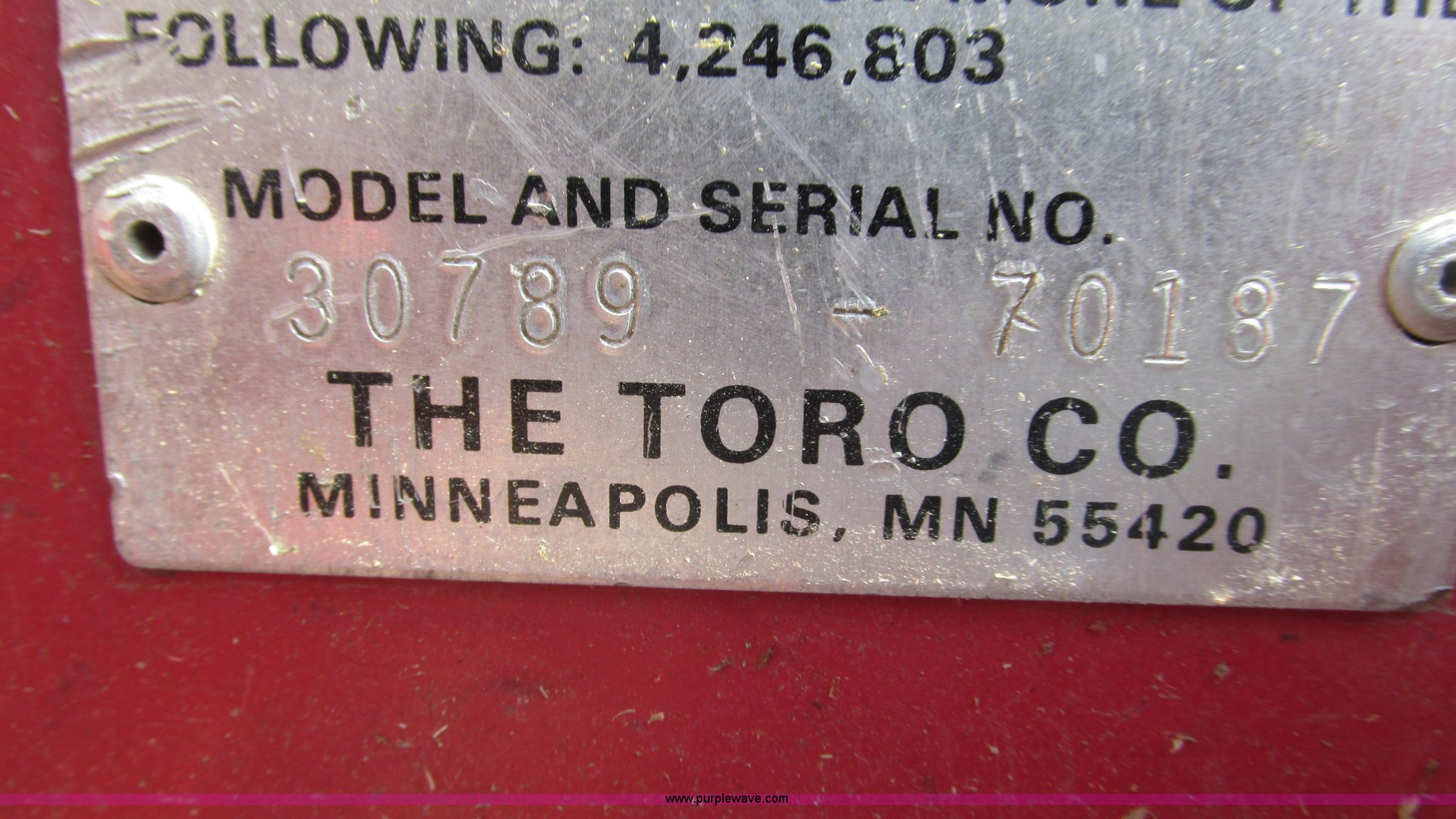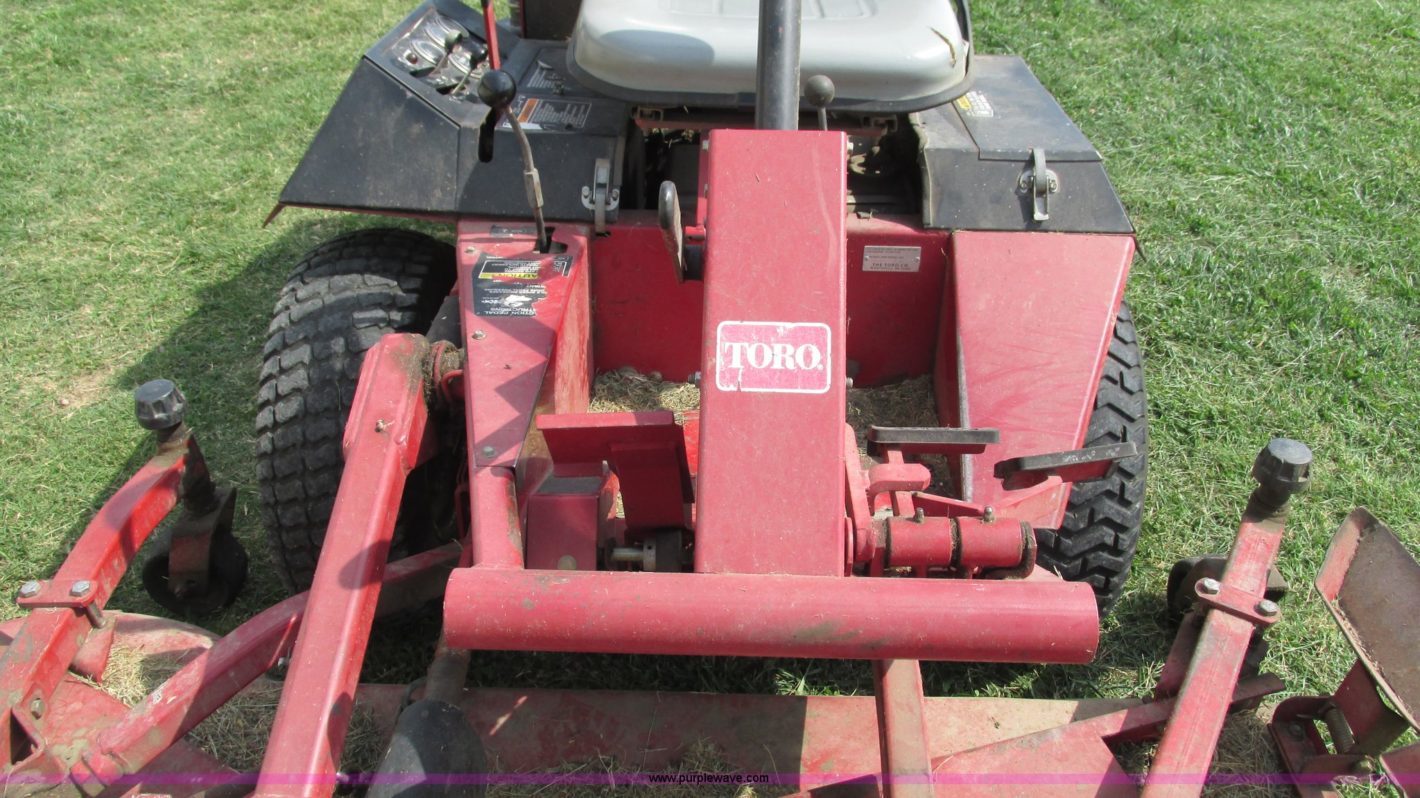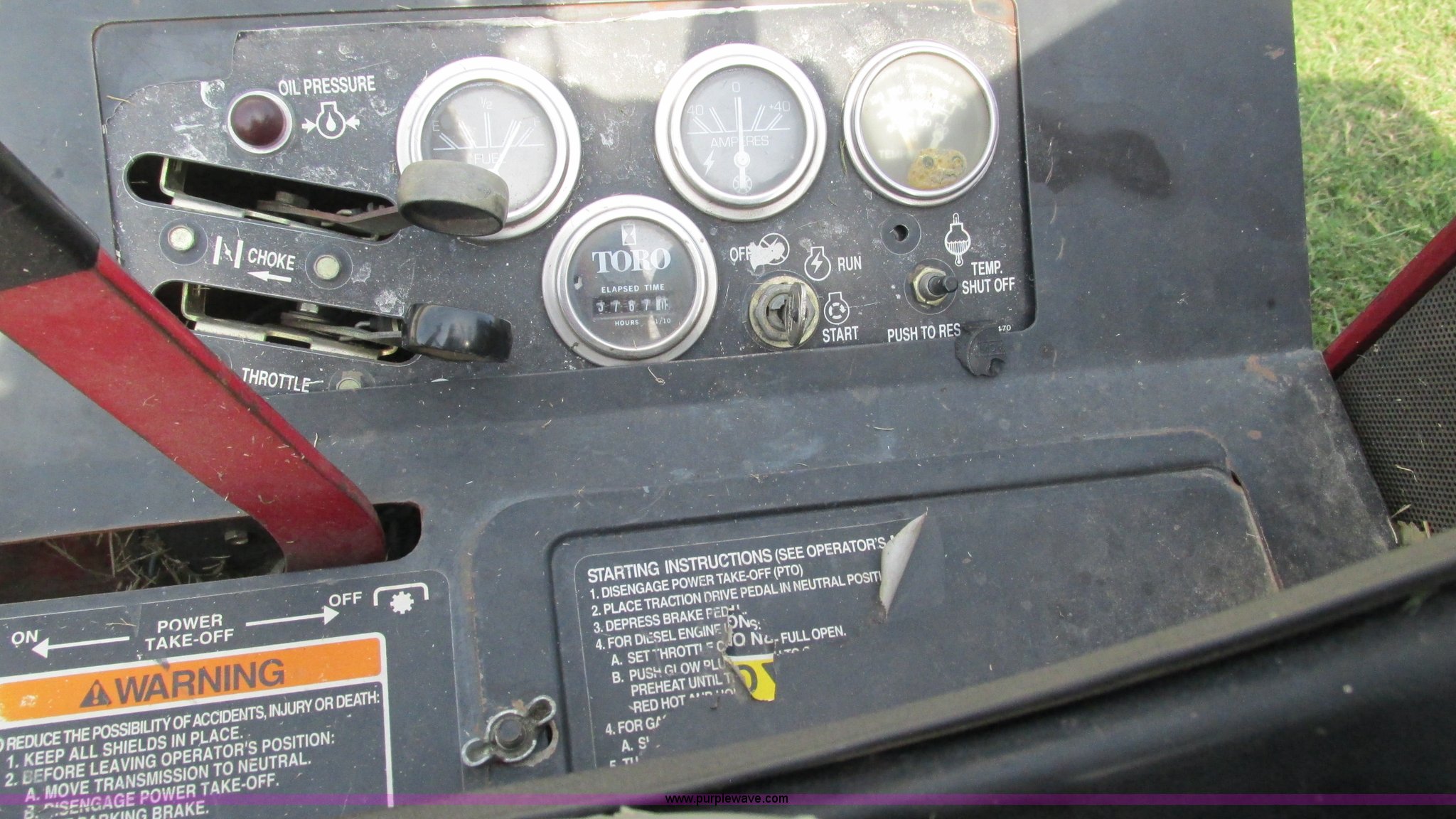 Purple Wave is selling a used Commercial Turf Mower in Missouri. This item is a Toro Groundmaster 345 riding lawn mower with the following: 3,767 hours on meter, Hours may vary, still in use, 72" cut, Ford three cylinder water cooled diesel engine, Model VSG4111-6003-A, 16x6.50 front tires, 23-8.5 rear tires, Seat torn, Serial 3078-70187