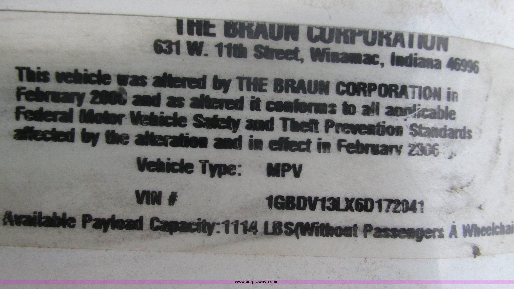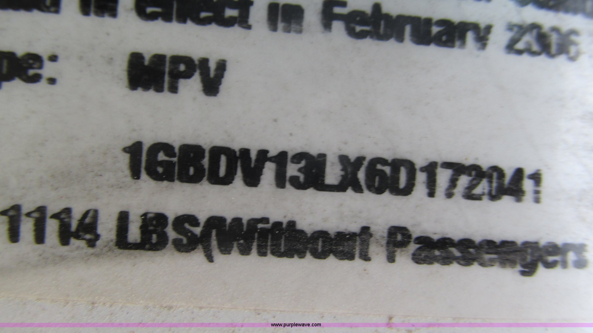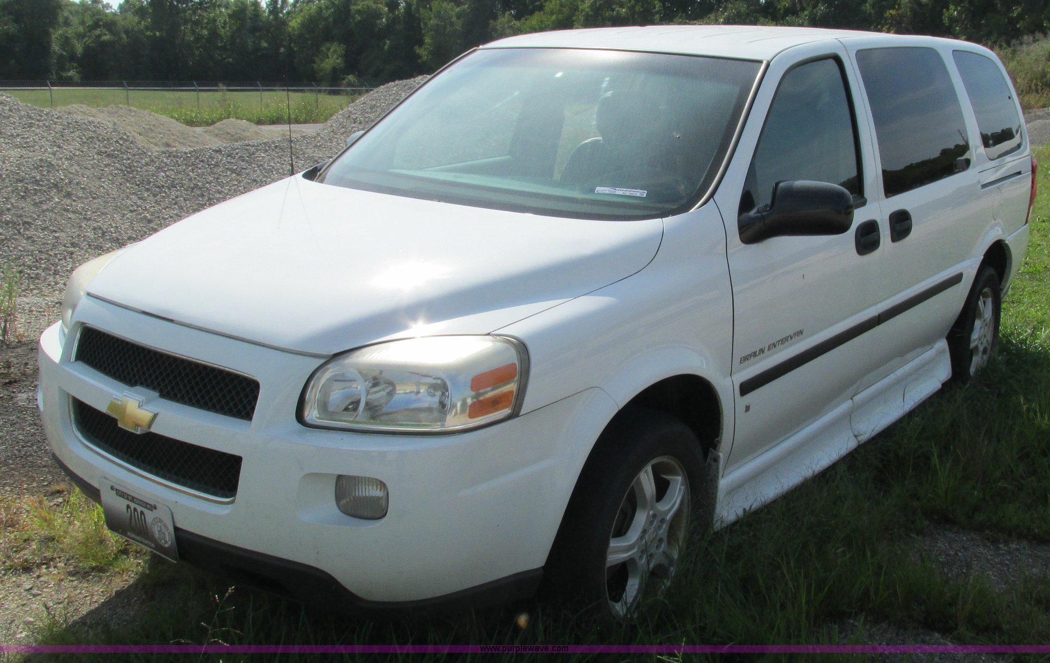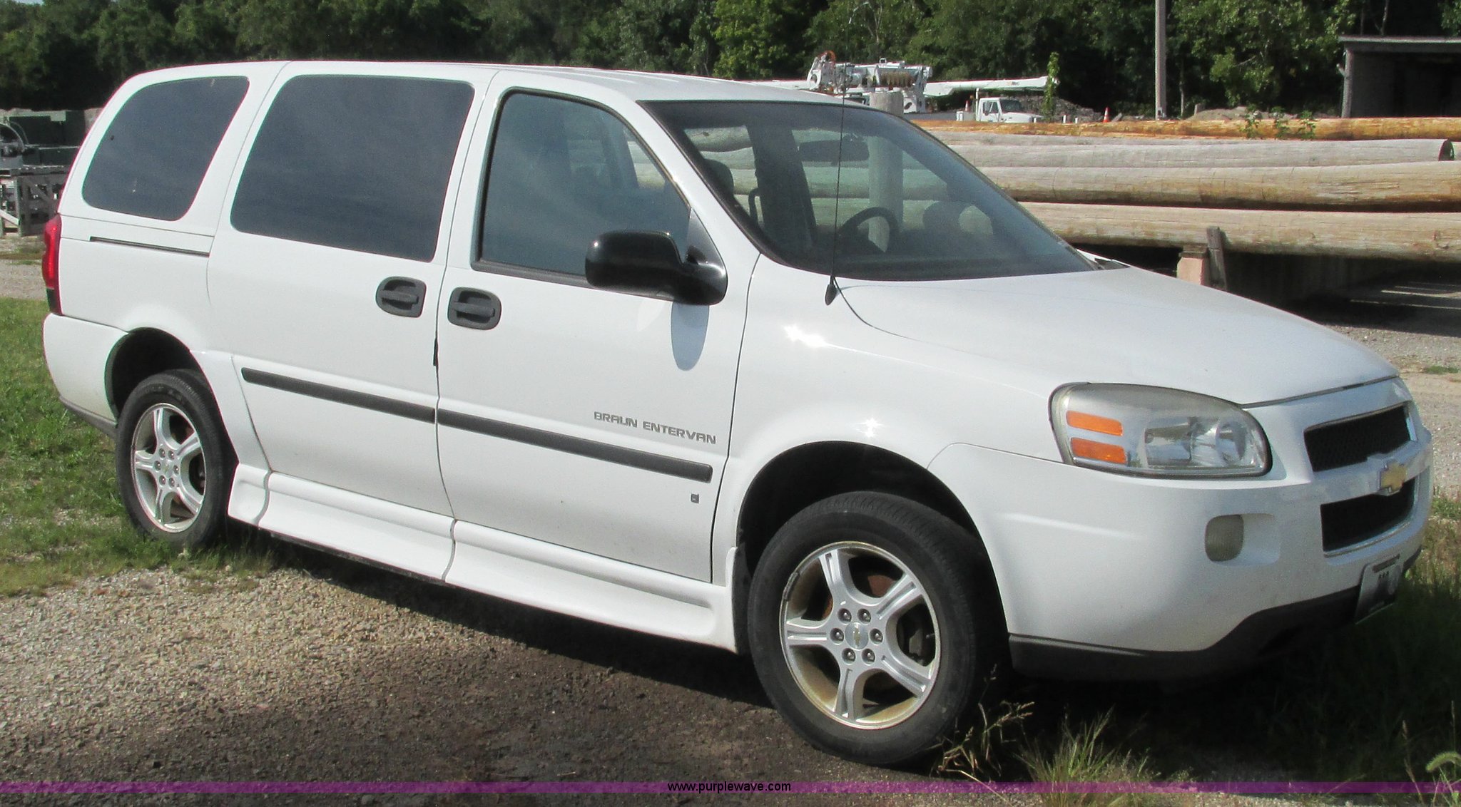 Purple Wave is selling a used Passenger Vehicle in Missouri. This item is a 2006 Chevrolet Uplander cargo van with the following: 103,513 miles on odometer, 3.5L V6 OHV 16V gas engine, Automatic transmission, AC and heat, Tilt, AM/FM/CD, Power windows, locks, and mirrors, Vinyl interior, Floor tracks for wheelchair securement, Lowered floor, P225/60R17 tires, Interior/exterior cosmetic damage, Seat torn, Frame broken at rear passenger tire, No ramp, Needs to be towed or hauled