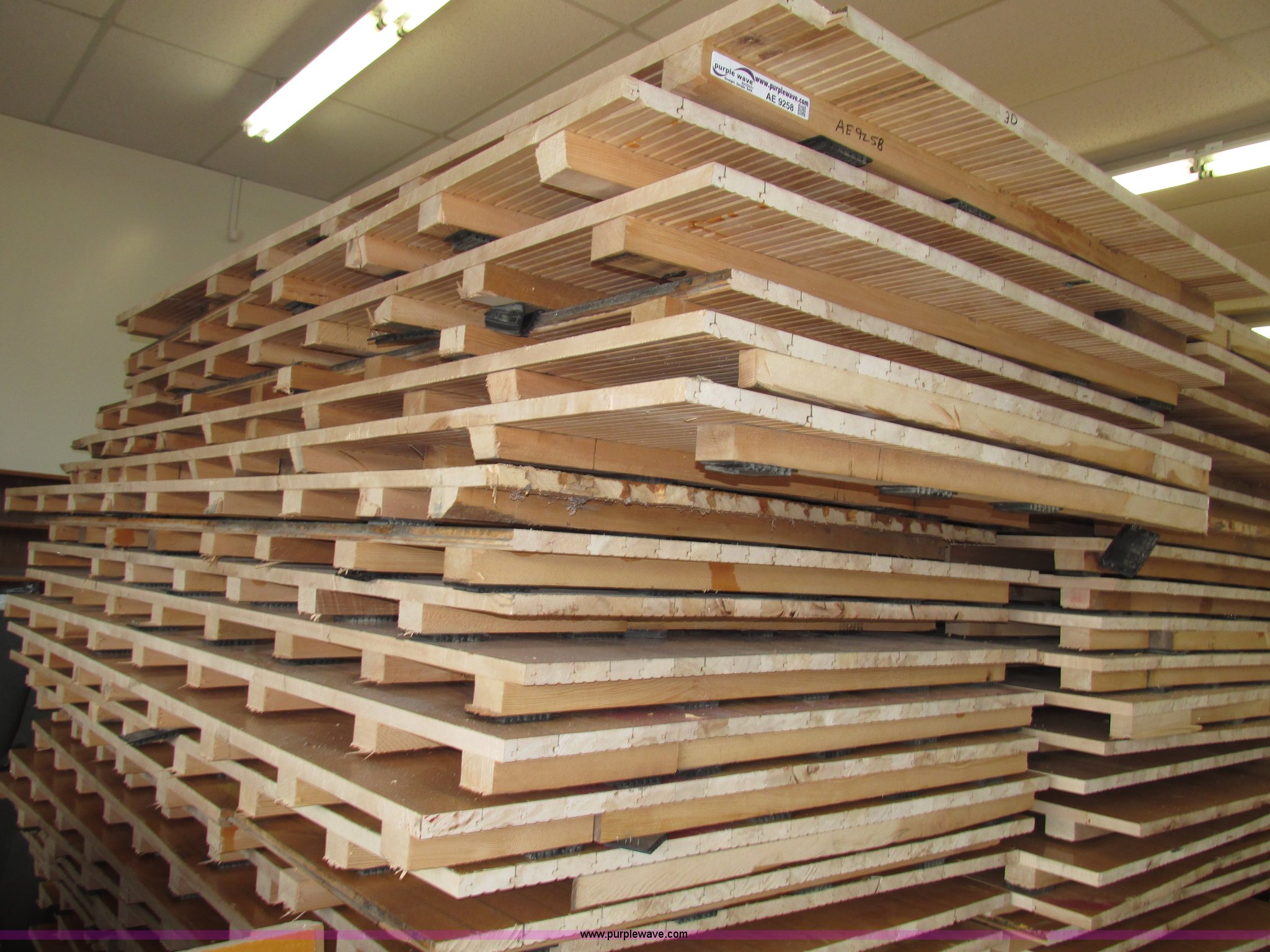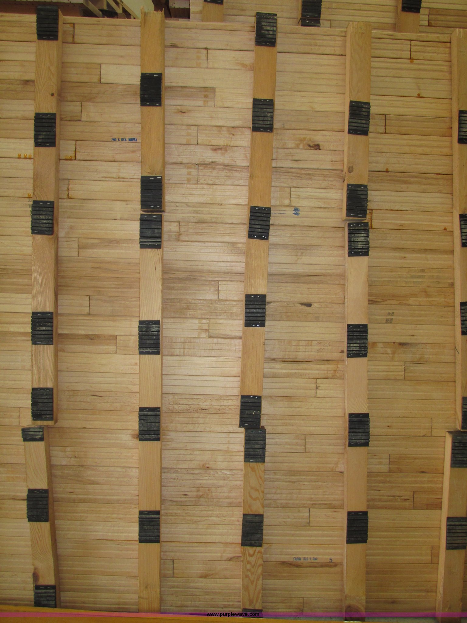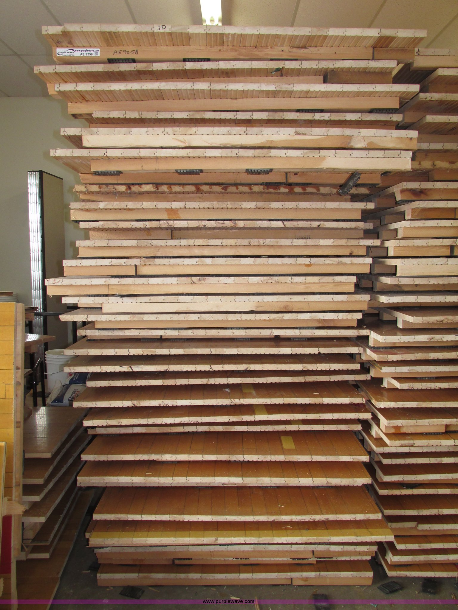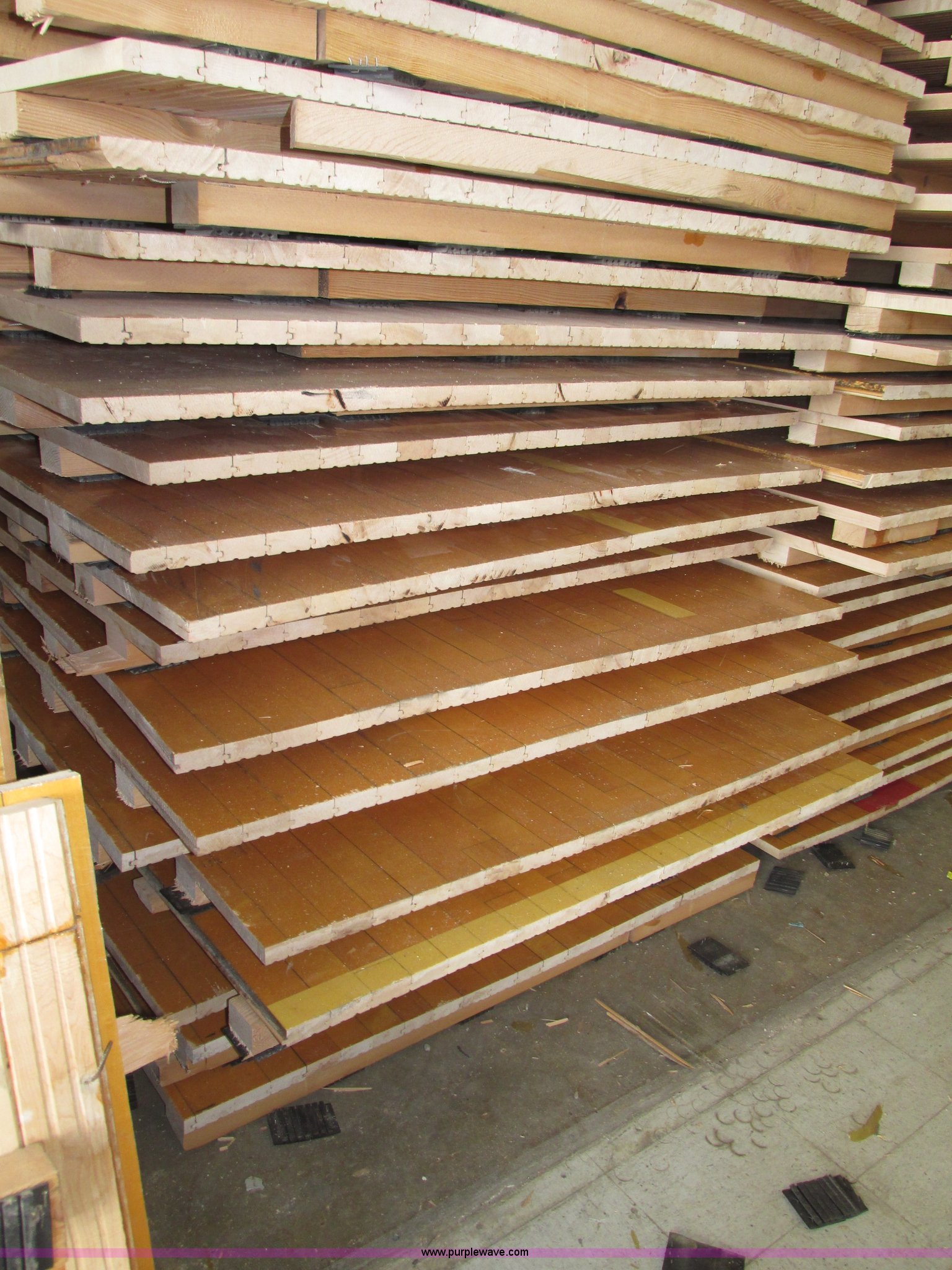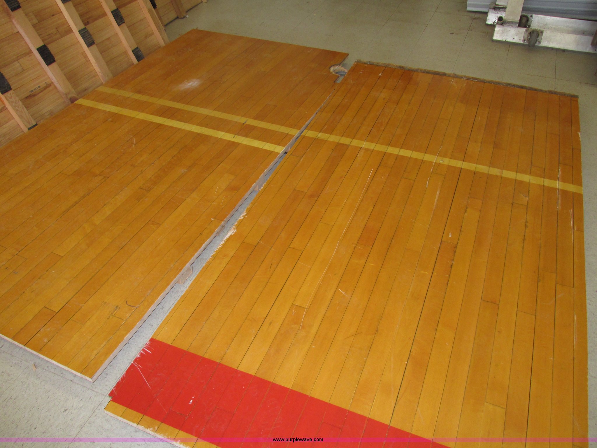 Purple Wave is selling a used Sporting Goods in Nebraska. This item is a (30) gym floor sections with the following: Approx. 4 x 8, Size may vary, 1 5/8" x 2 5/8" reinforcement, 2.5" x 2" rubber pads
