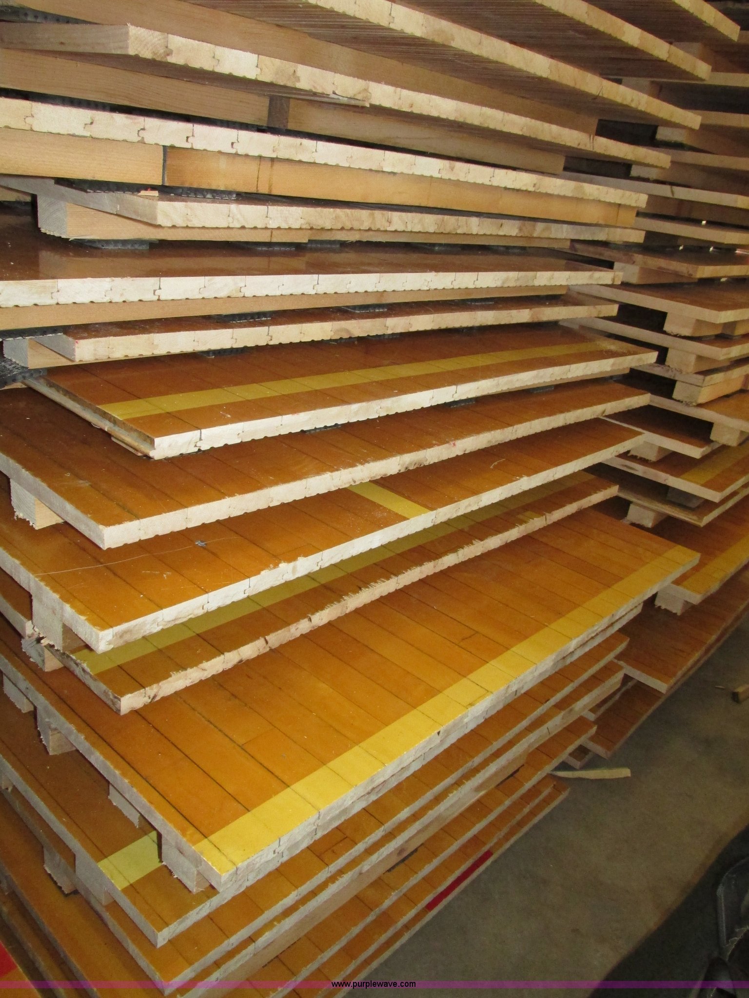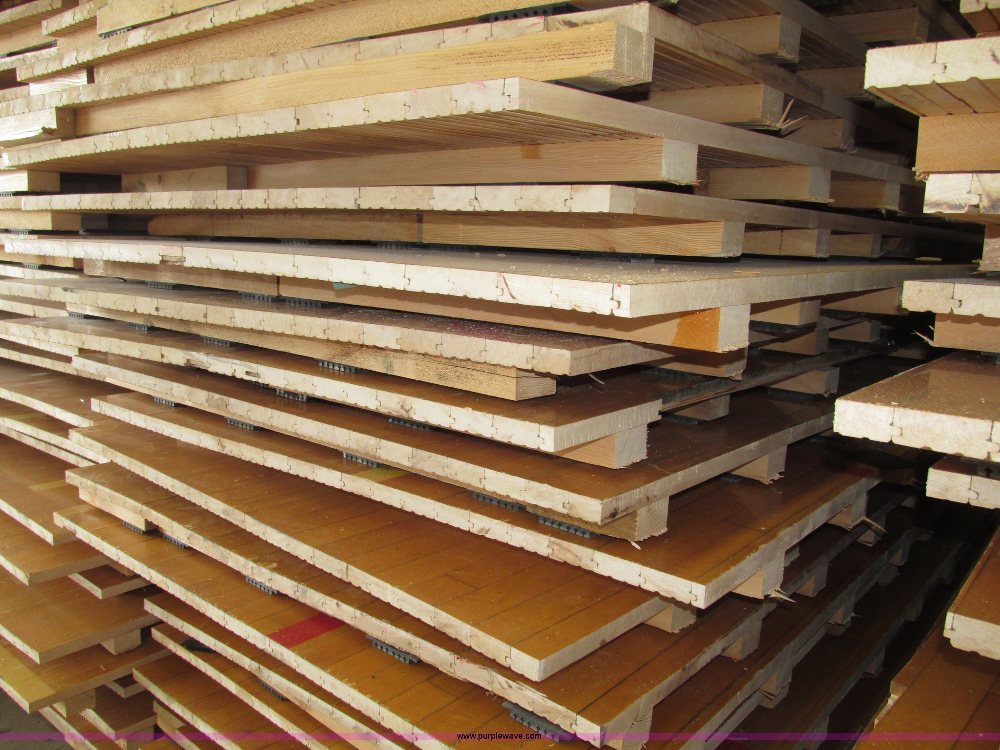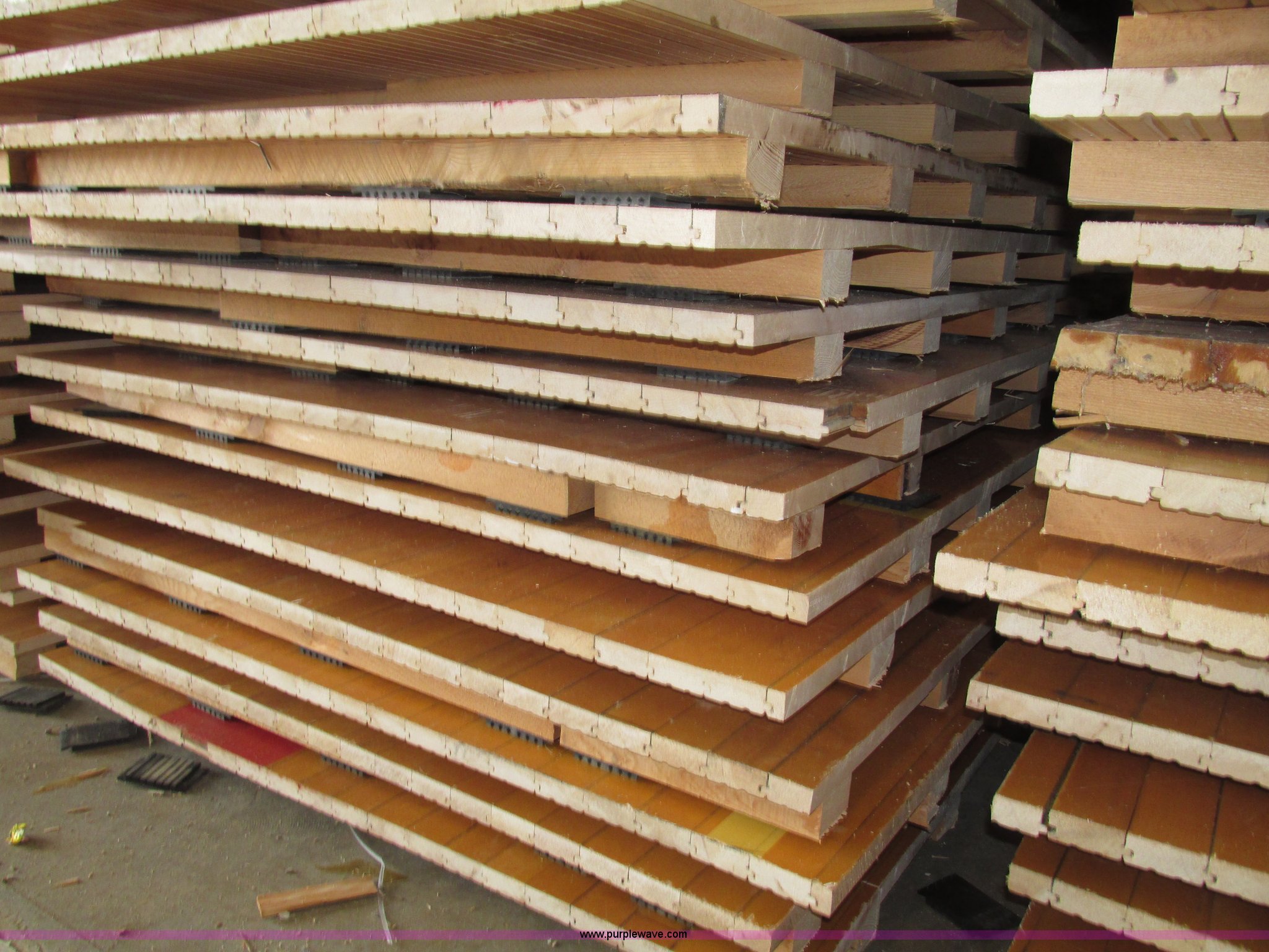 Purple Wave is selling a used Sporting Goods in Nebraska. This item is a (30) gym floor sections with the following: Approx. 4 x 8, Size may vary, 1 5/8" x 2 5/8" reinforcement, 2.5" x 2" rubber pads