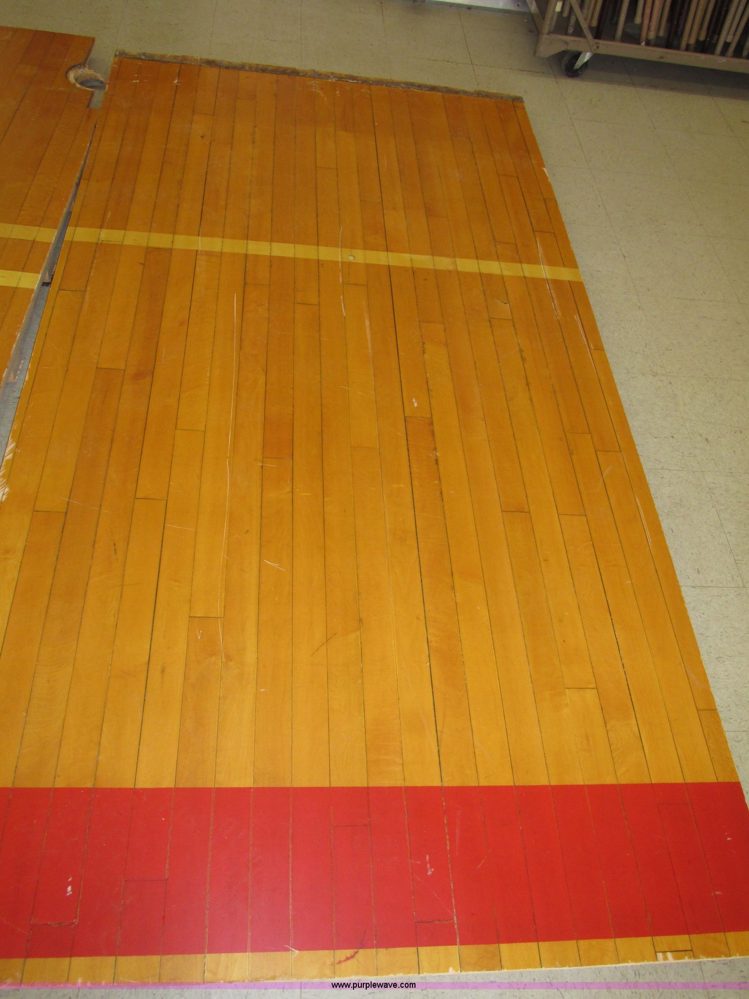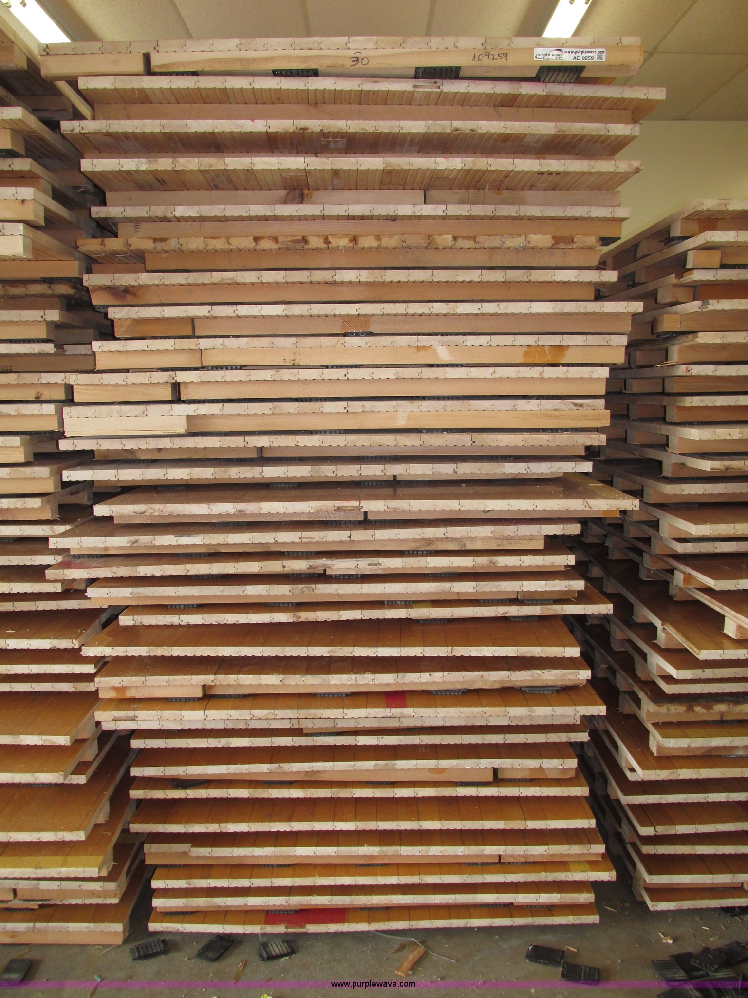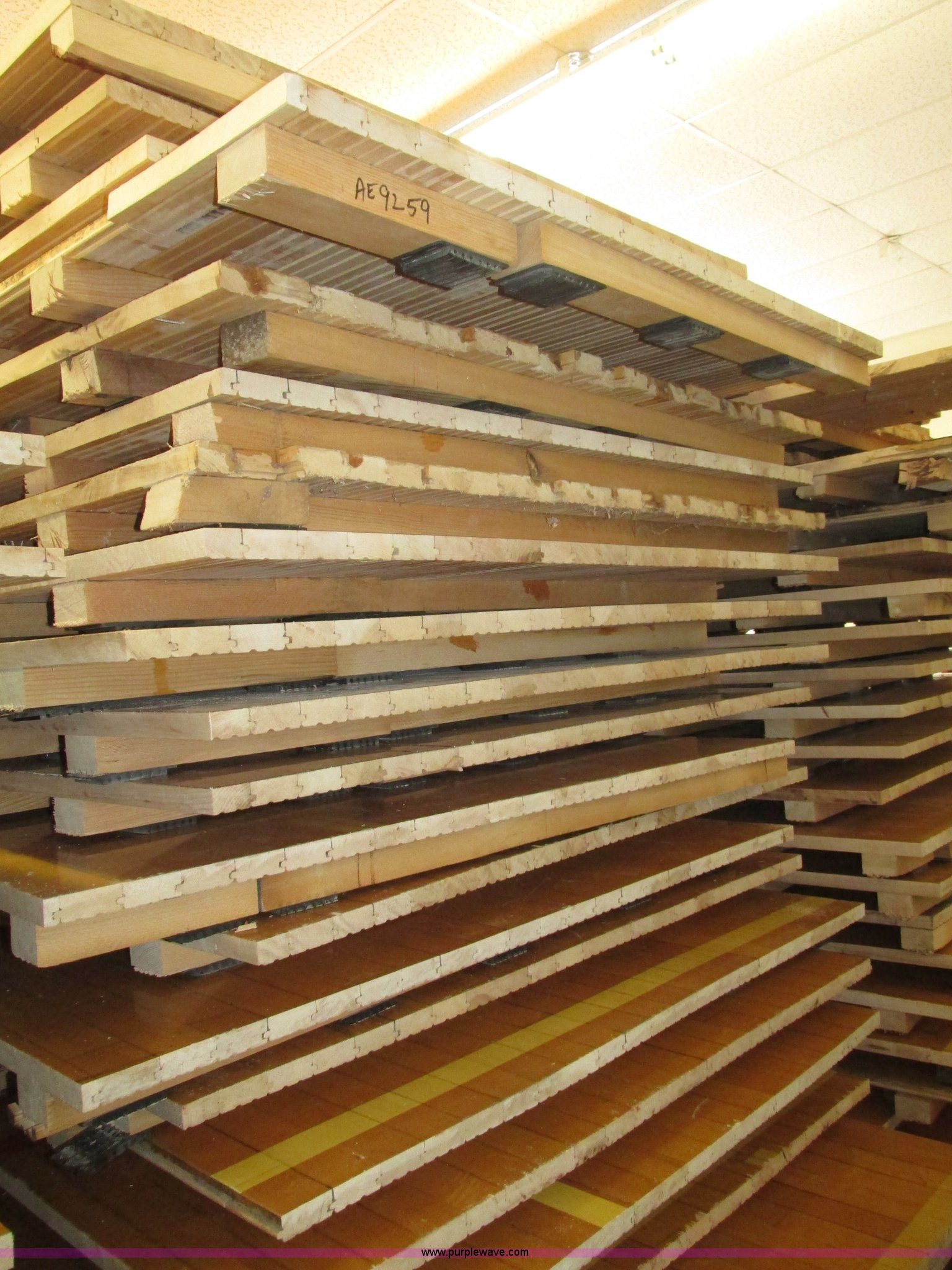 Purple Wave is selling a used Sporting Goods in Nebraska. This item is a (30) gym floor sections with the following: Approx. 4 x 8, Size may vary, 1 5/8" x 2 5/8" reinforcement, 2.5" x 2" rubber pads