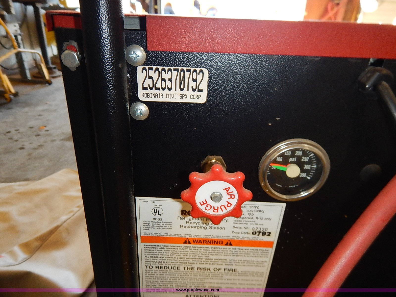 Purple Wave is selling a used Tools in Kansas. This item is a Robinair refrigerant recovery recycling recharging system with the following: Tank not included, Cover included, Unknown operating condition, Serial 2526370792
