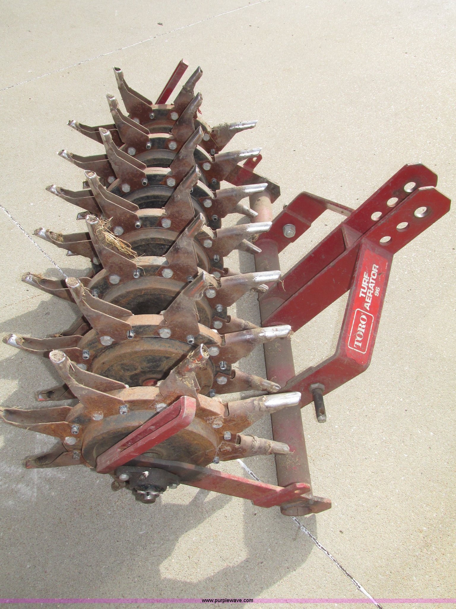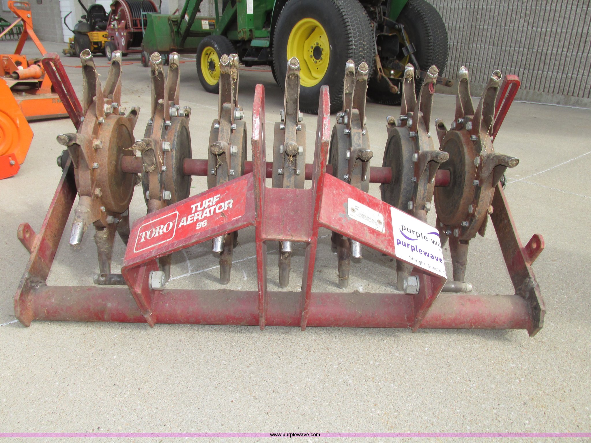 Toro 96 turf aerator. Three point, Plugger style, 42"W 6" plugger spacing, 23" diameter plugger wheels Eight spoke, Greaseable pillow block bearing Bearings replaced in 2013, Last used in 2013, Serial 960296. Auburn Public Schools. 1713 J St. Auburn, NE 68305