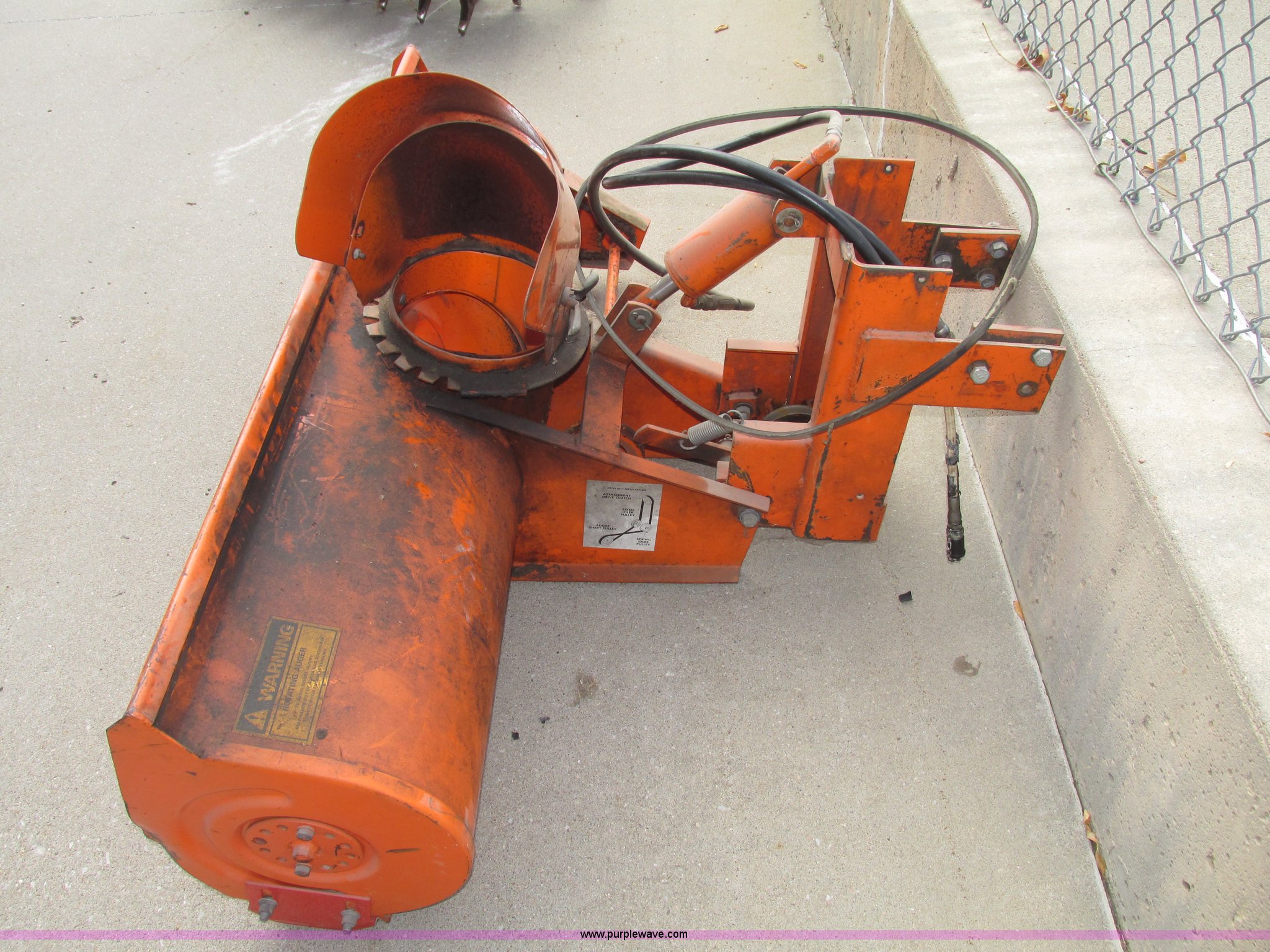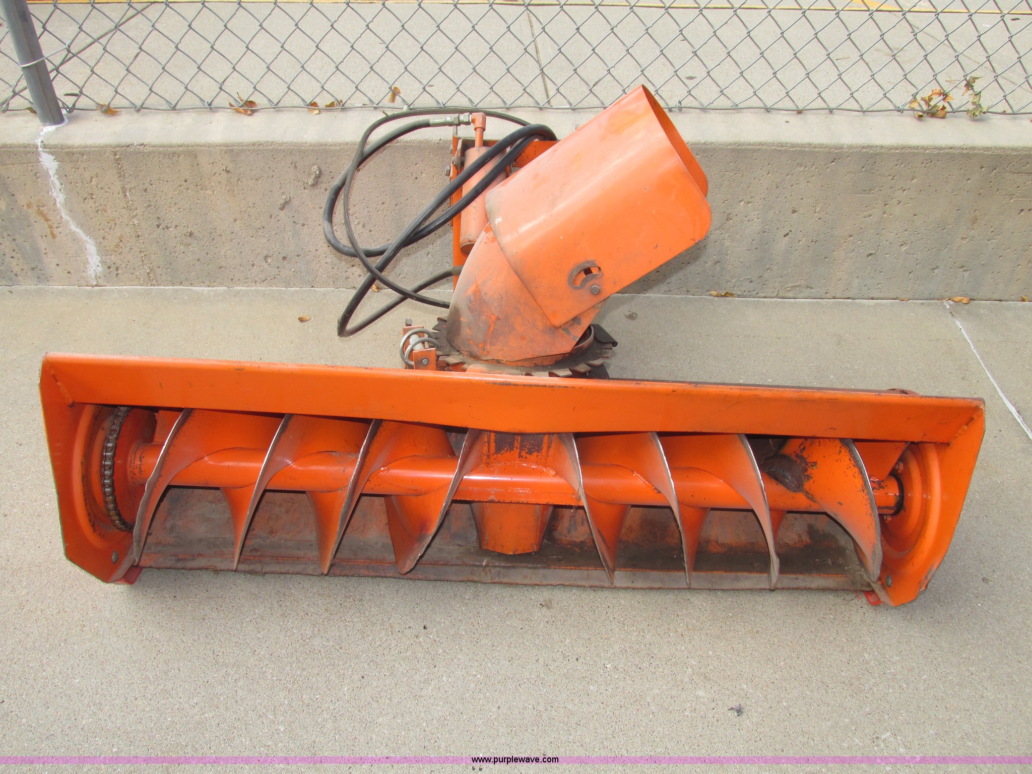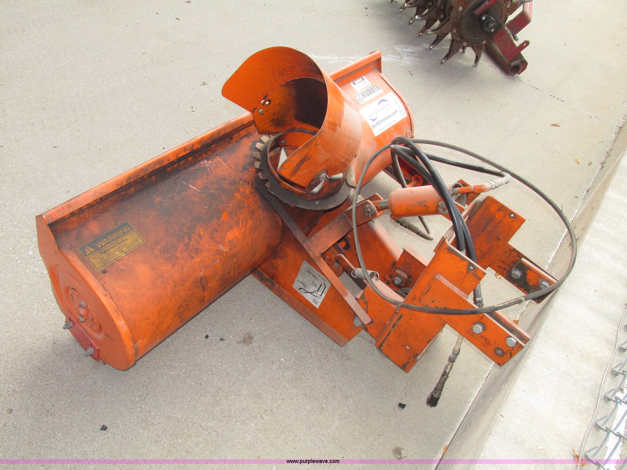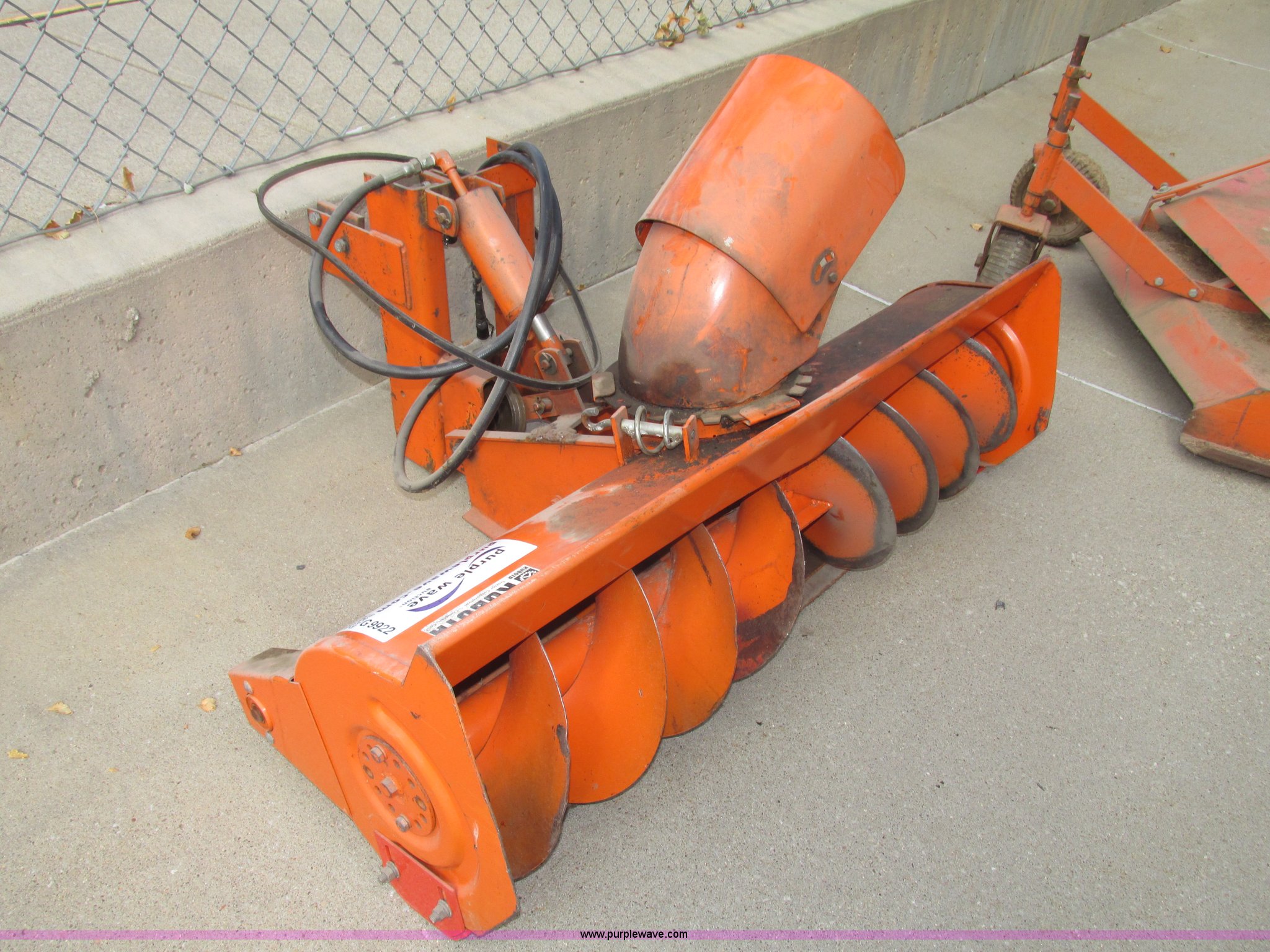 Purple Wave is selling a used Commercial Turf Mower in Nebraska. This item is a Kubota B748B snow blower with the following: Front mount, Hydraulic lift, Single stage 12" auger, Manual chute adjustment, 7.5" I.D. throat, Belt and chain driven, Used belt included, (2) hydraulic hoses, Safe Way male fittings, Electric clutch not included, Last used on Kubota B7100 tractor, Last used in 2000, Serial 12043
