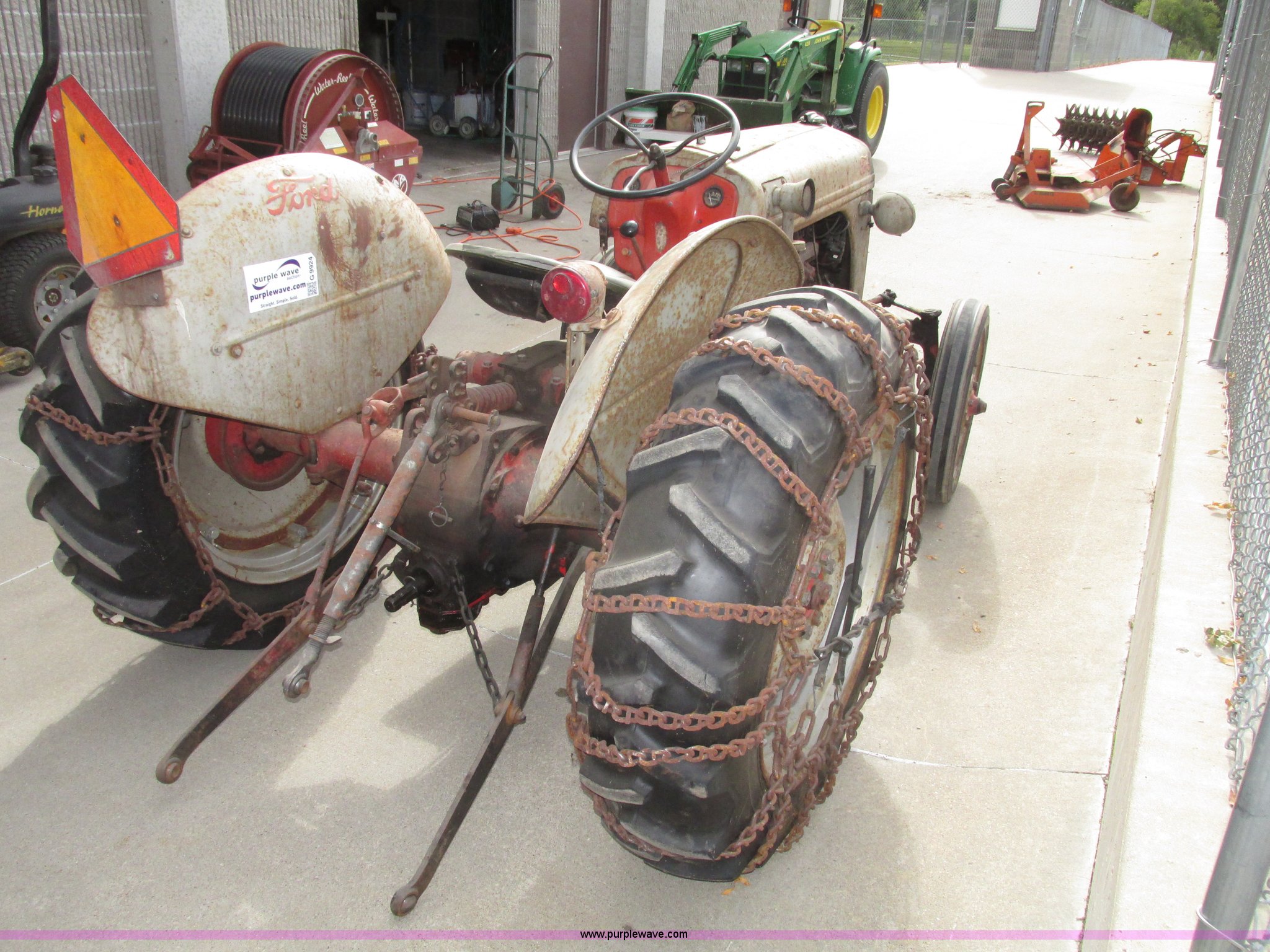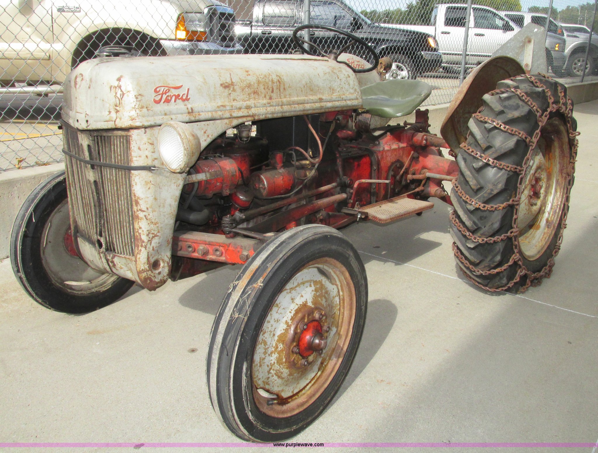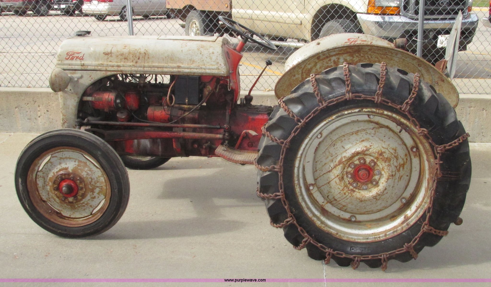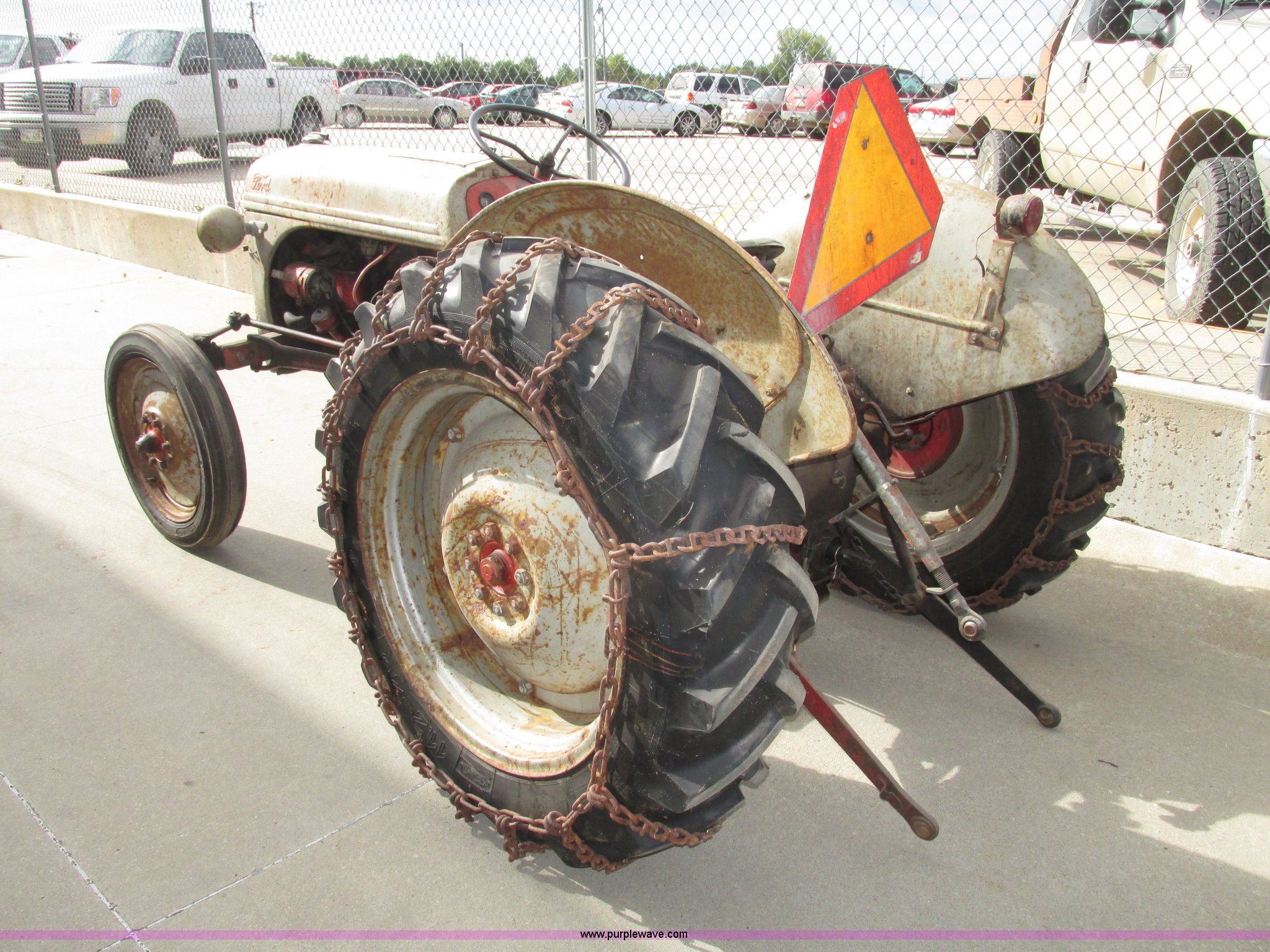 Purple Wave is selling a used Tractor in Nebraska. This item is a 1950 Ford 8N tractor with the following: 6,415 hours on meter, Ford 2.0L four cylinder gas engine, 23 HP, Constant Mesh manual transmission, 4F-1R gears, Spring suspension seat, Mechanical steering, Foot activated starter, Three point, Front work lights, SMV emblem, Type I, 540 PTO, 70" wheelbase, 4.00-19F-2 front tires, 11.2-28 rear tires, Rear tire chains, Antifreeze leaks into block, needs repaired, Needs to be jump started, Tire sidewalls cracked, Vinyl seat cushion tearing, Last used in 2012, Serial 8127596