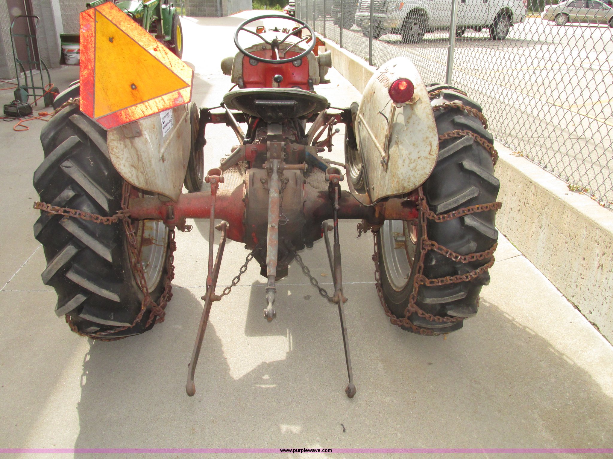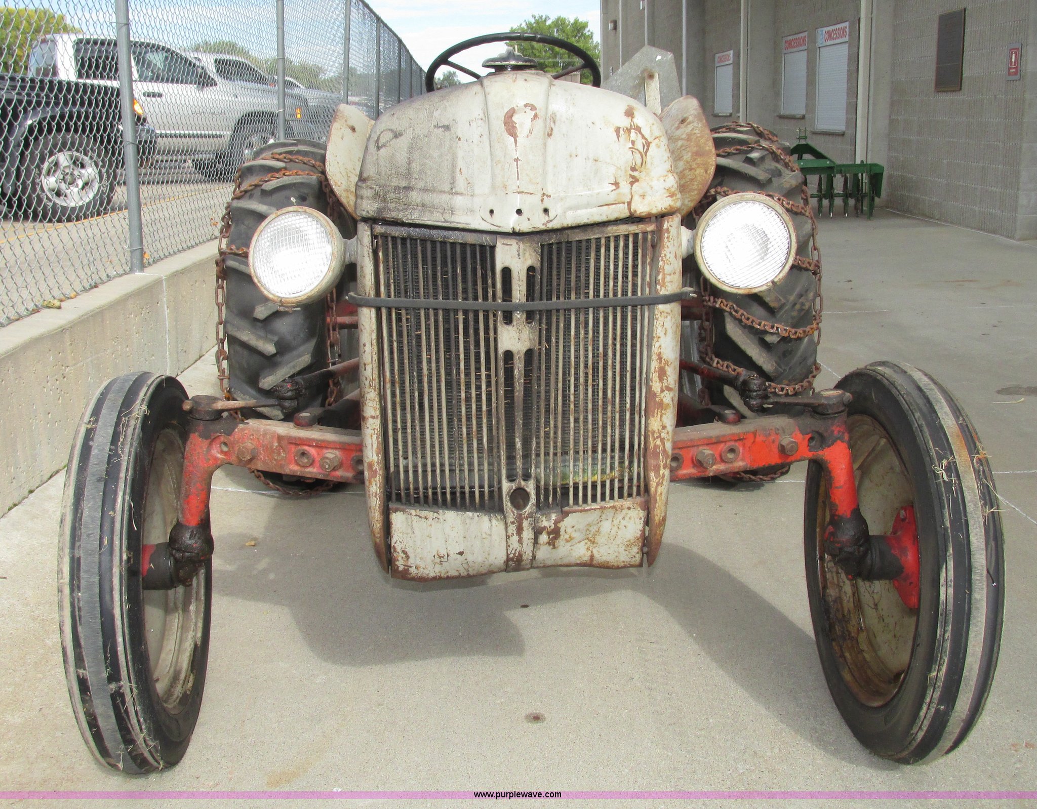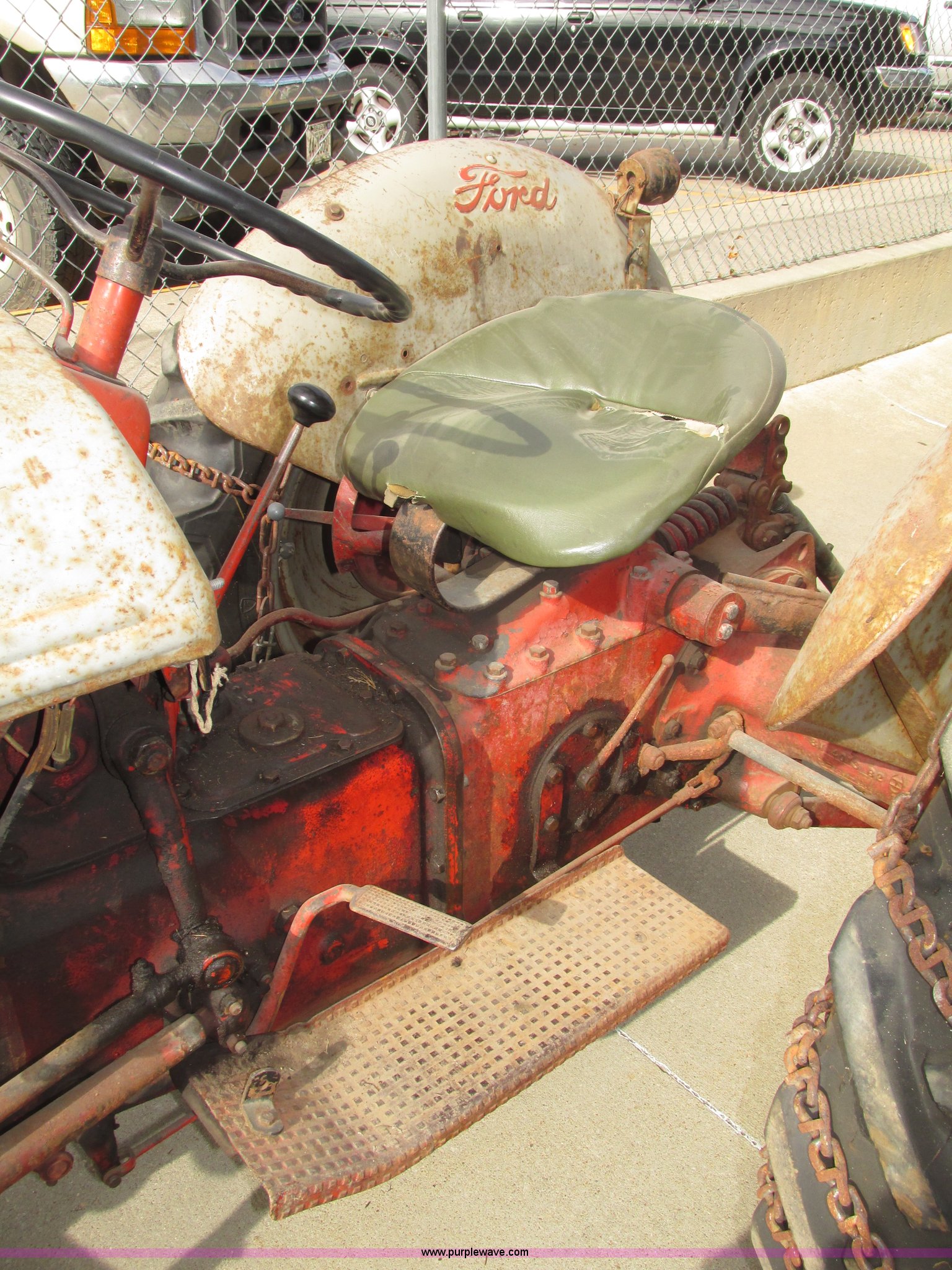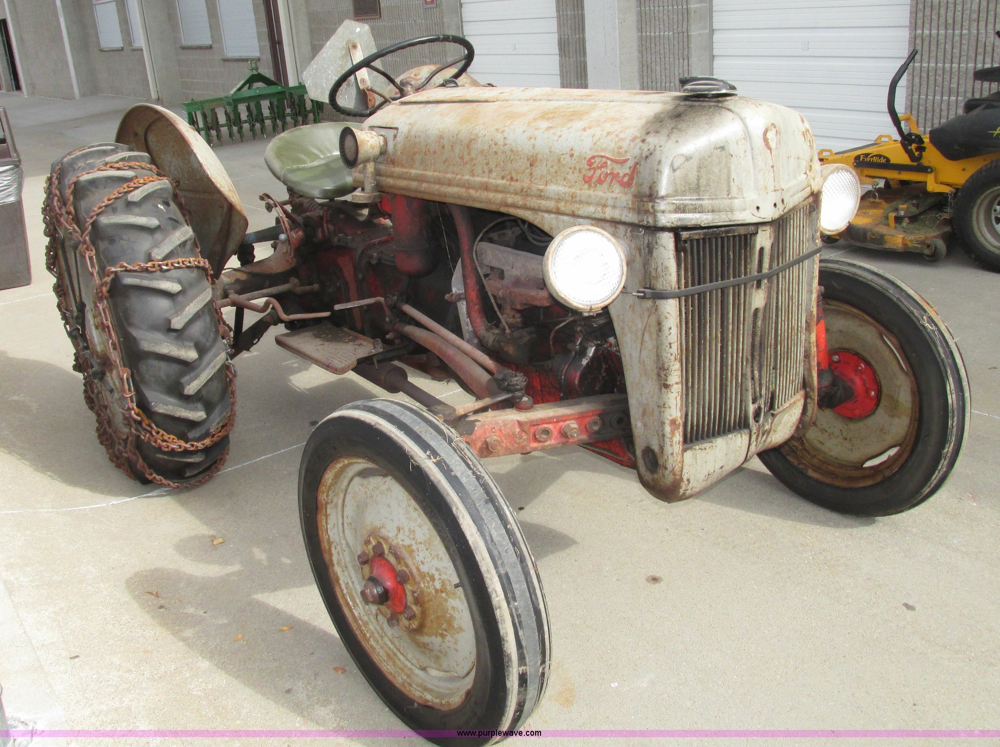 Purple Wave is selling a used Tractor in Nebraska. This item is a 1950 Ford 8N tractor with the following: 6,415 hours on meter, Ford 2.0L four cylinder gas engine, 23 HP, Constant Mesh manual transmission, 4F-1R gears, Spring suspension seat, Mechanical steering, Foot activated starter, Three point, Front work lights, SMV emblem, Type I, 540 PTO, 70" wheelbase, 4.00-19F-2 front tires, 11.2-28 rear tires, Rear tire chains, Antifreeze leaks into block, needs repaired, Needs to be jump started, Tire sidewalls cracked, Vinyl seat cushion tearing, Last used in 2012, Serial 8127596
