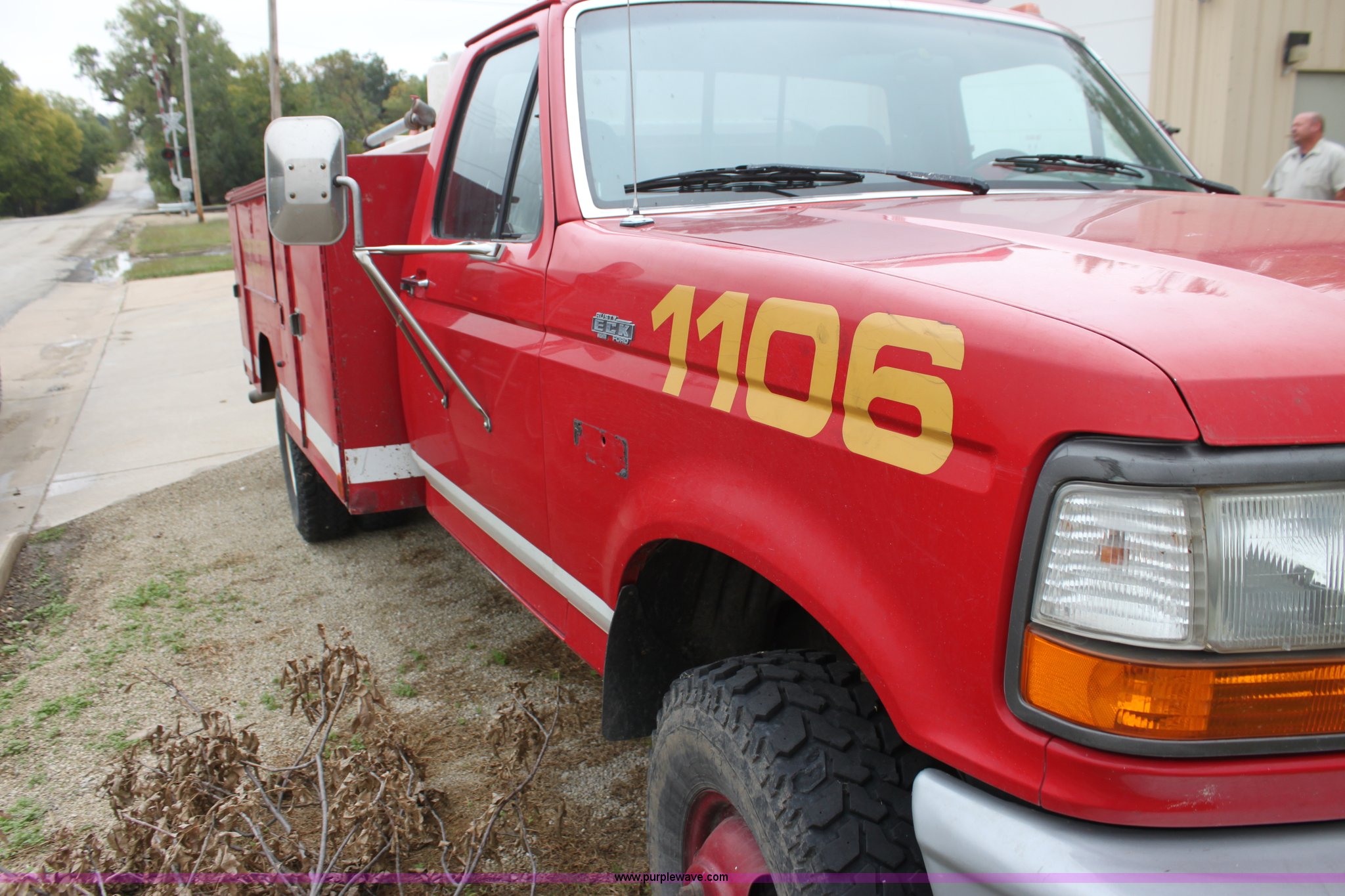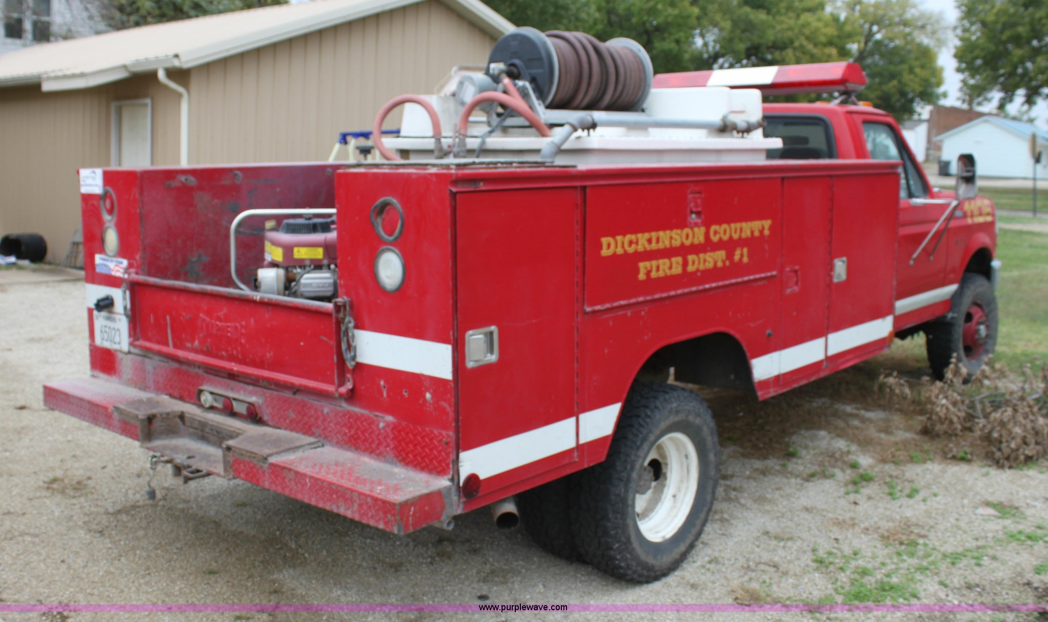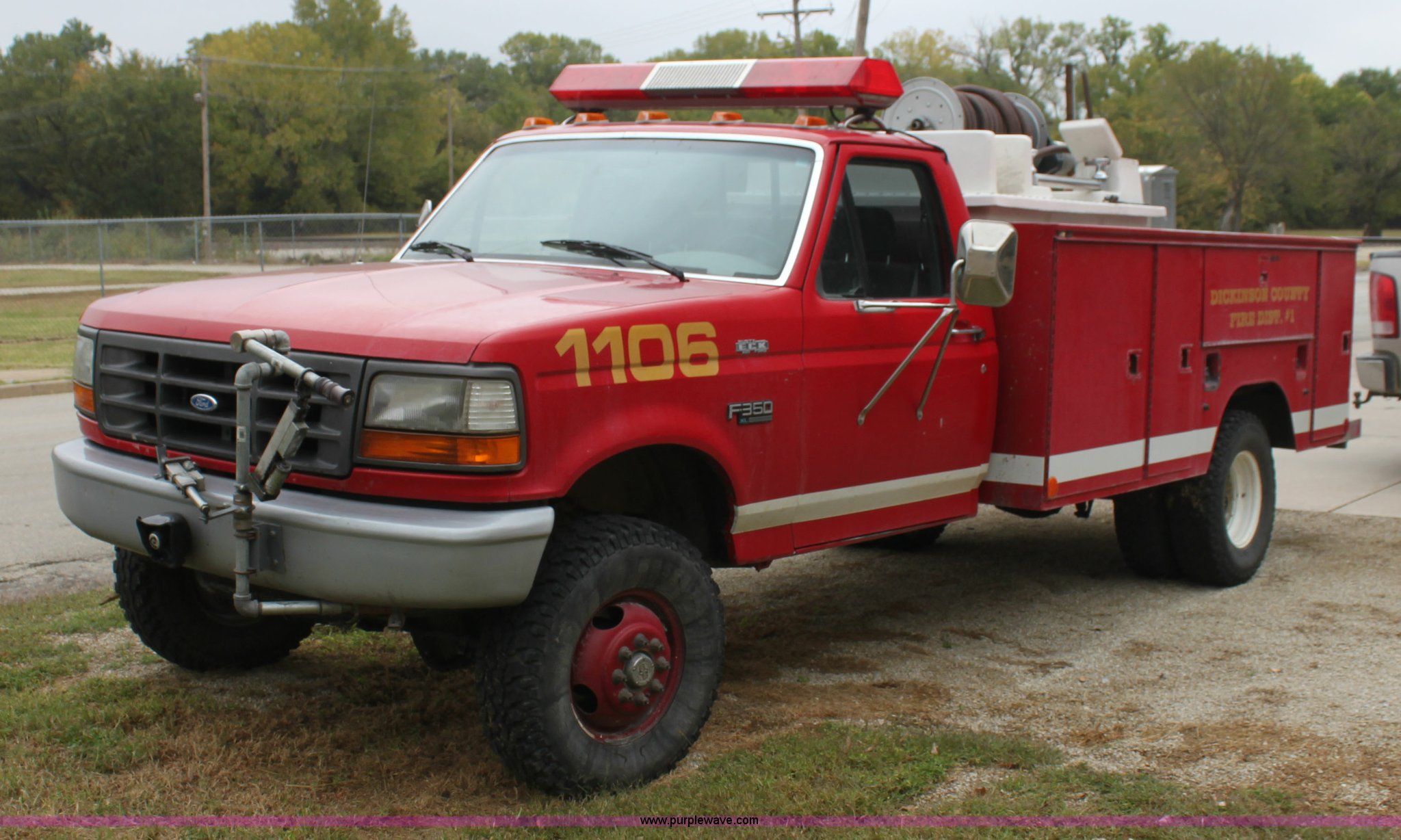 1994 Ford F350 utility truck. 134,824 miles on odometer, 7.3L V8 OHV 16V diesel engine, Automatic transmission, Four wheel drive, Heat, AM/FM, Manual windows and locks, Knapheide 11' utility bed, PTO, 235/85R16 tires, Interior/exterior cosmetic damage, Hail damage, Front nozzle, skid unit, lights, and sirens not included. 1FDKF38M8RNB04313. Dickinson County Fire Dist. #1. Enterprise, KS 67441