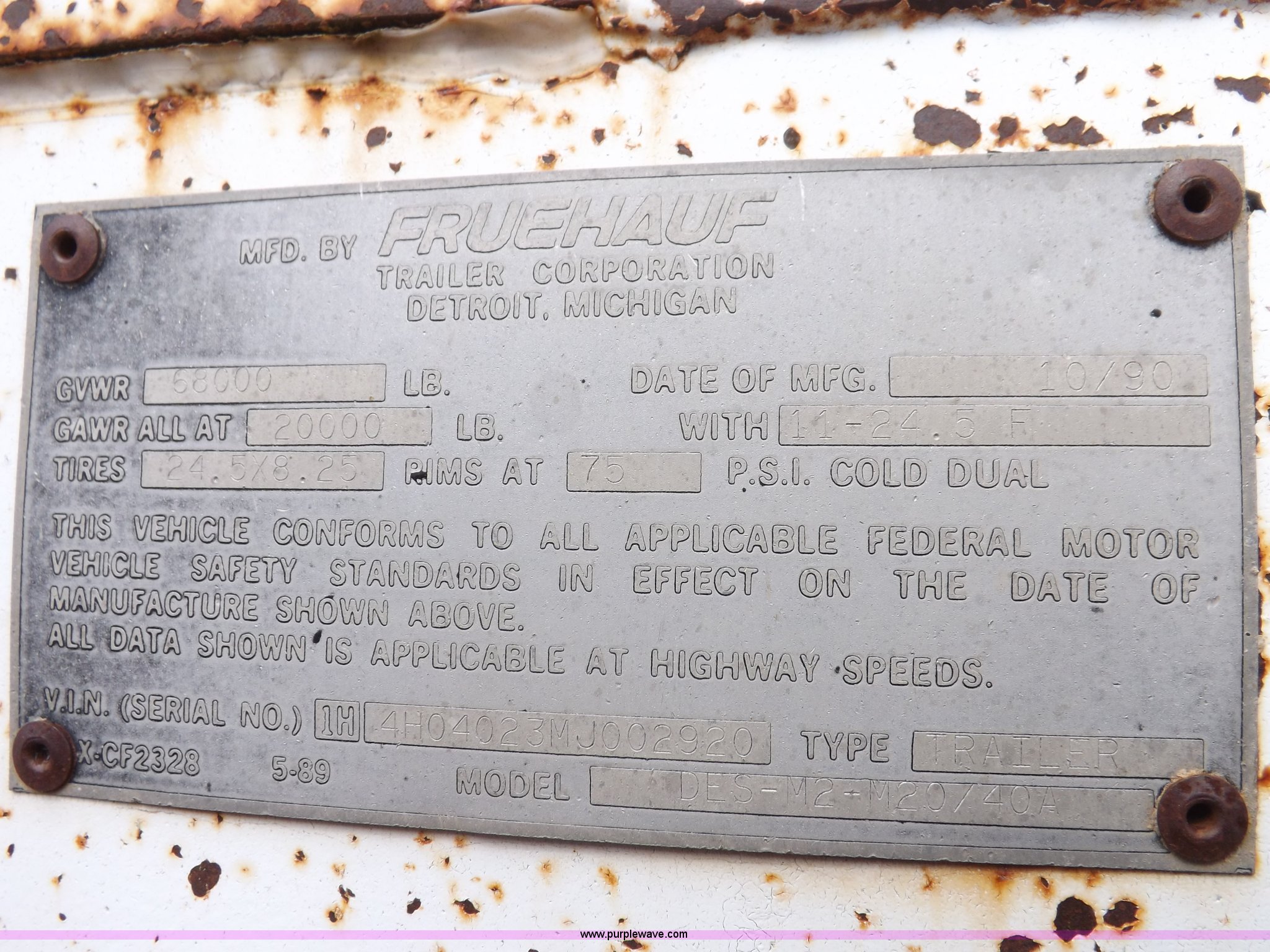 Purple Wave is selling a used Bottom Dump Trailer in Kansas. This item is a 1991 Fruehauf belly dump trailer with the following: Model DES-M2-M20740A, 40'L x 8.5'W x 9'H, Air operation, Left side control valve, Tarp, Slide-in post landing gear, Spring suspension, Air brakes, 295/75R22.5 tires, GVWR 68,000 lbs, Fender damage, Paint damage
