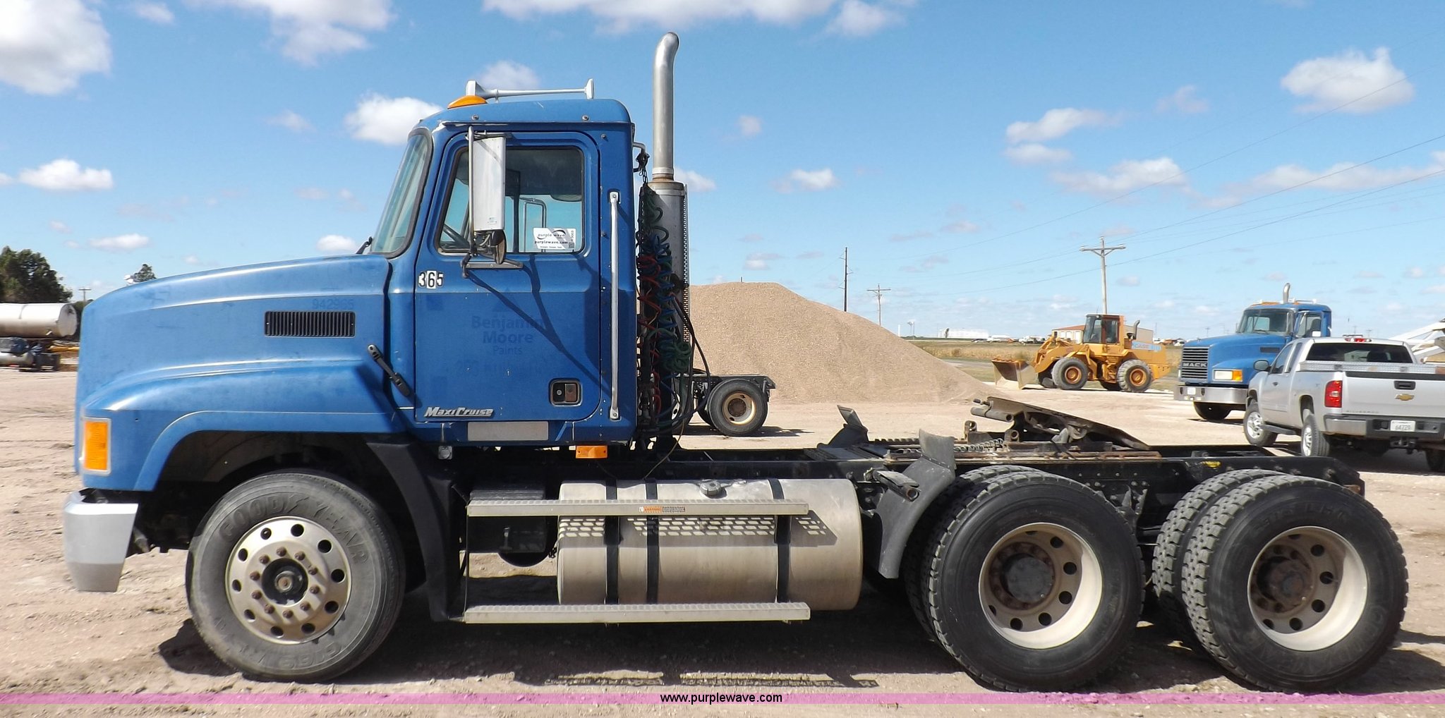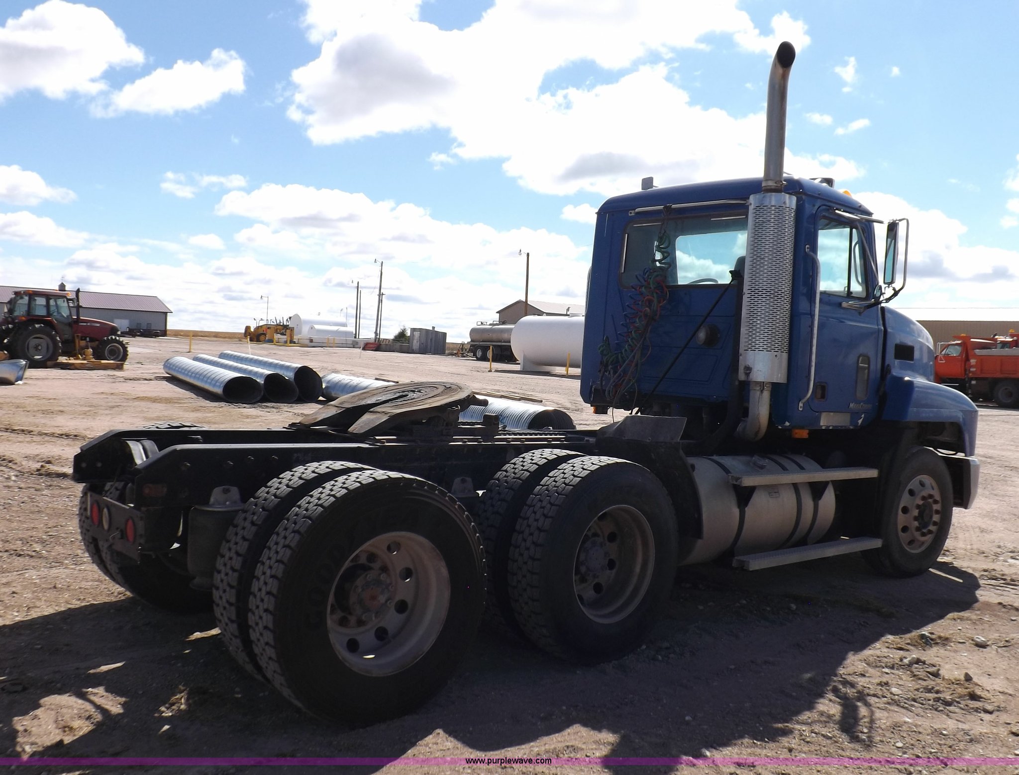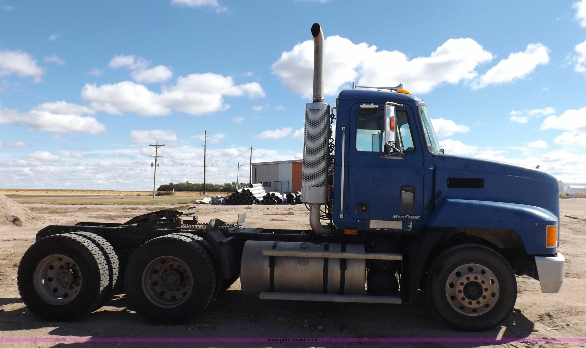 Purple Wave is selling a used Truck Tractor in Kansas. This item is a 2001 Mack CH613 semi truck with the following: 291,584 miles on odometer, Mack E7 12.0L L6 diesel engine, 355/380 HP, Eaton Fuller 10 speed manual transmission, Twin screw, AC and heat, Cruise, AM/FM/cassette, Passenger daylight door, Air suspension seat, Power and heated mirrors, Air ride cab, Block heater, Air slide fifth wheel, Dual 110 gallon fuel tanks, Single rear exhaust brakes, Poly quarter fenders, Air suspension, Air brakes, Brake controller, Jake brake, Aluminum wheels, 160" wheelbase, 295/75R22.5 tires, GVWR 48,000 lbs, FAWR 12,000 lbs, IAWR 18,000 lbs, RAWR 18,000 lbs, Interior/exterior cosmetic damage, Chipped windshield, Unit# 365