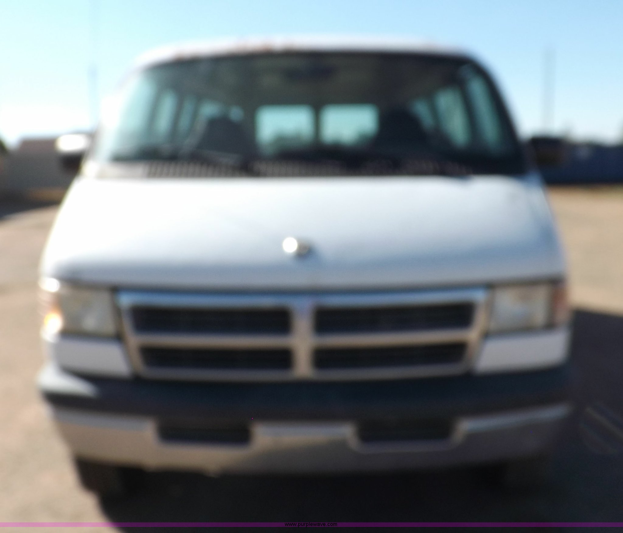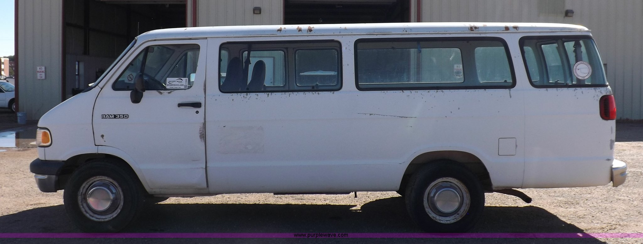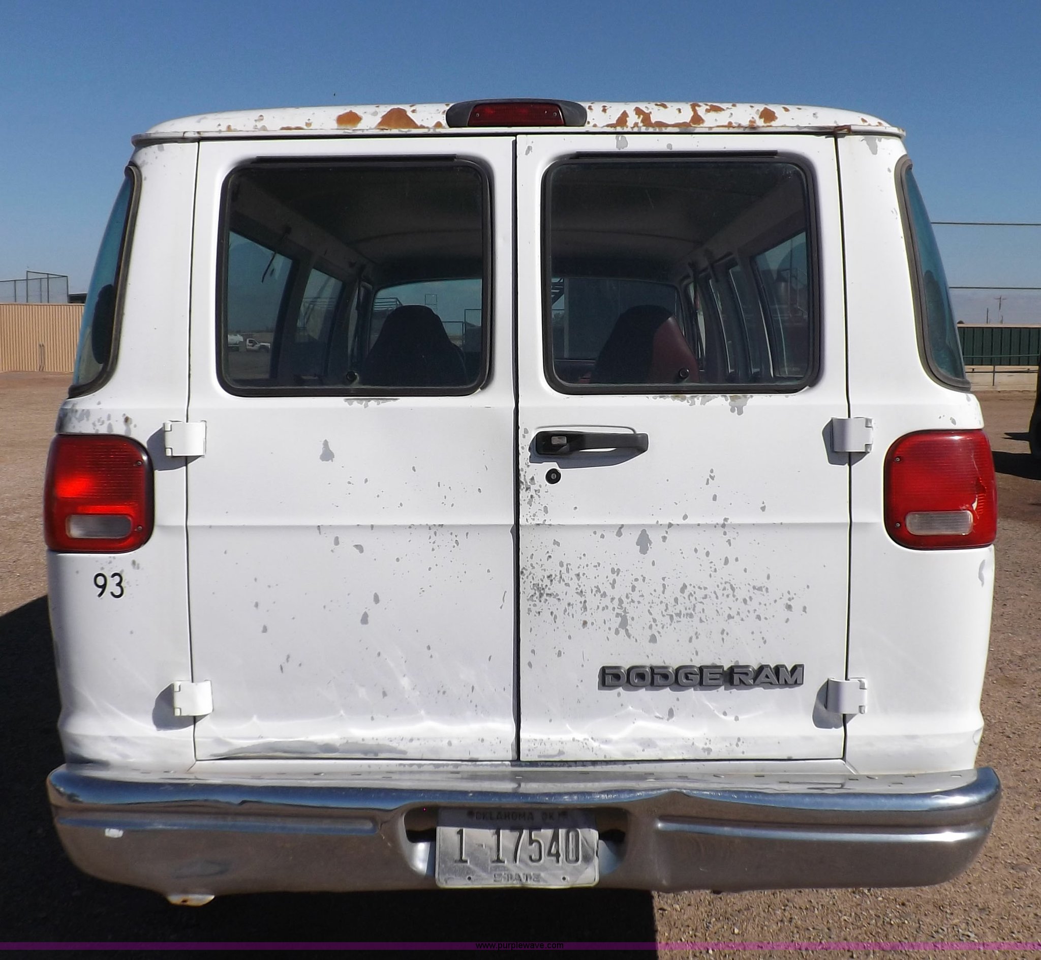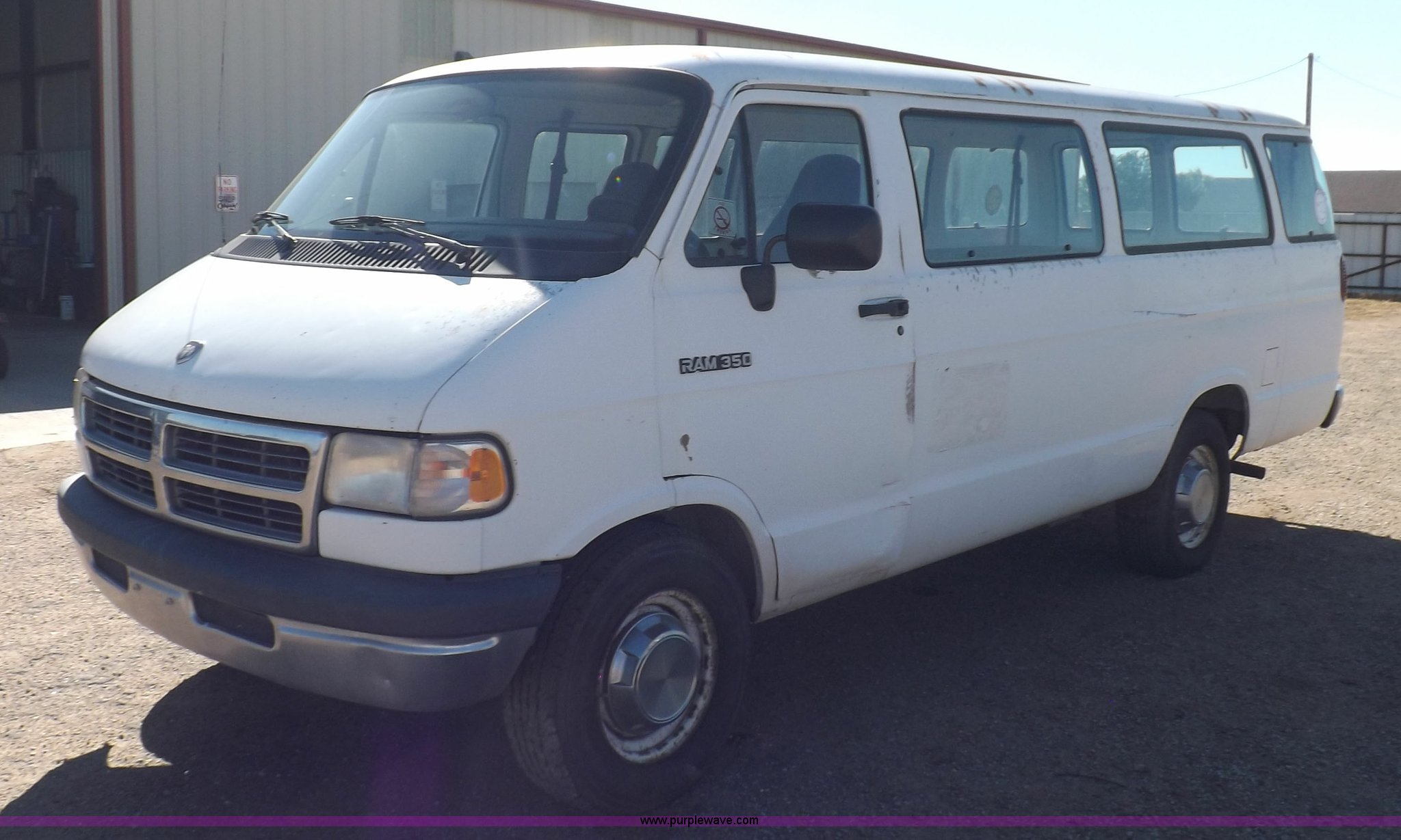 Purple Wave is selling a used 3/4 or 1 Ton Pickup or Van in Oklahoma. This item is a 1994 Dodge Ram B350 van with the following: 214,205 actual miles, 5.9L V8 OHV 16V gas engine, Automatic transmission, AC and heat, Tilt, Cruise, AM/FM, Manual windows and locks, Vinyl interior, 126" wheelbase, 225/75R16 tires, Interior/exterior cosmetic damage, Ignition switch operational, but needs replaced, Driver seat torn, Hail damage, Paint damage, Driver door hinges broken, Passenger seating removed, Unit# 93