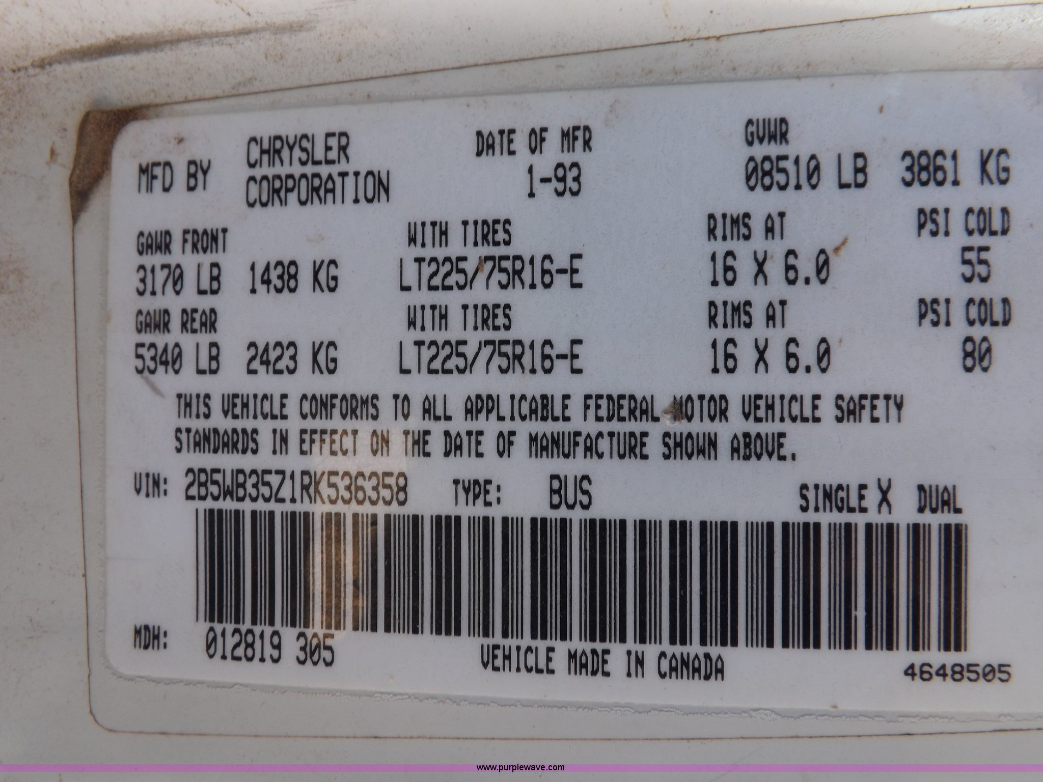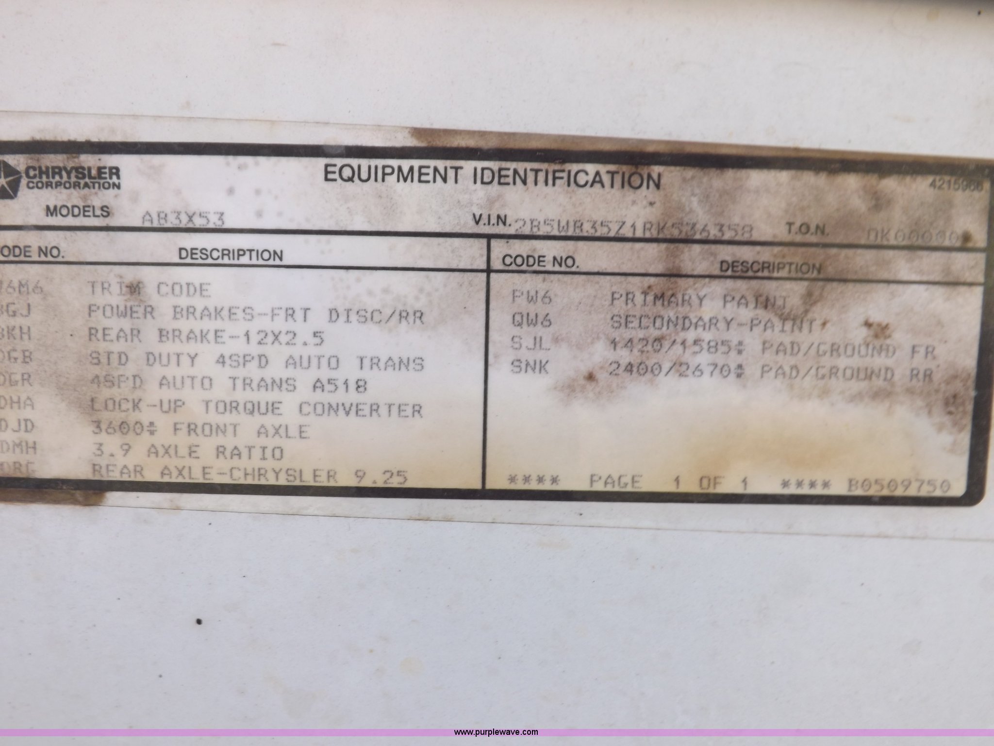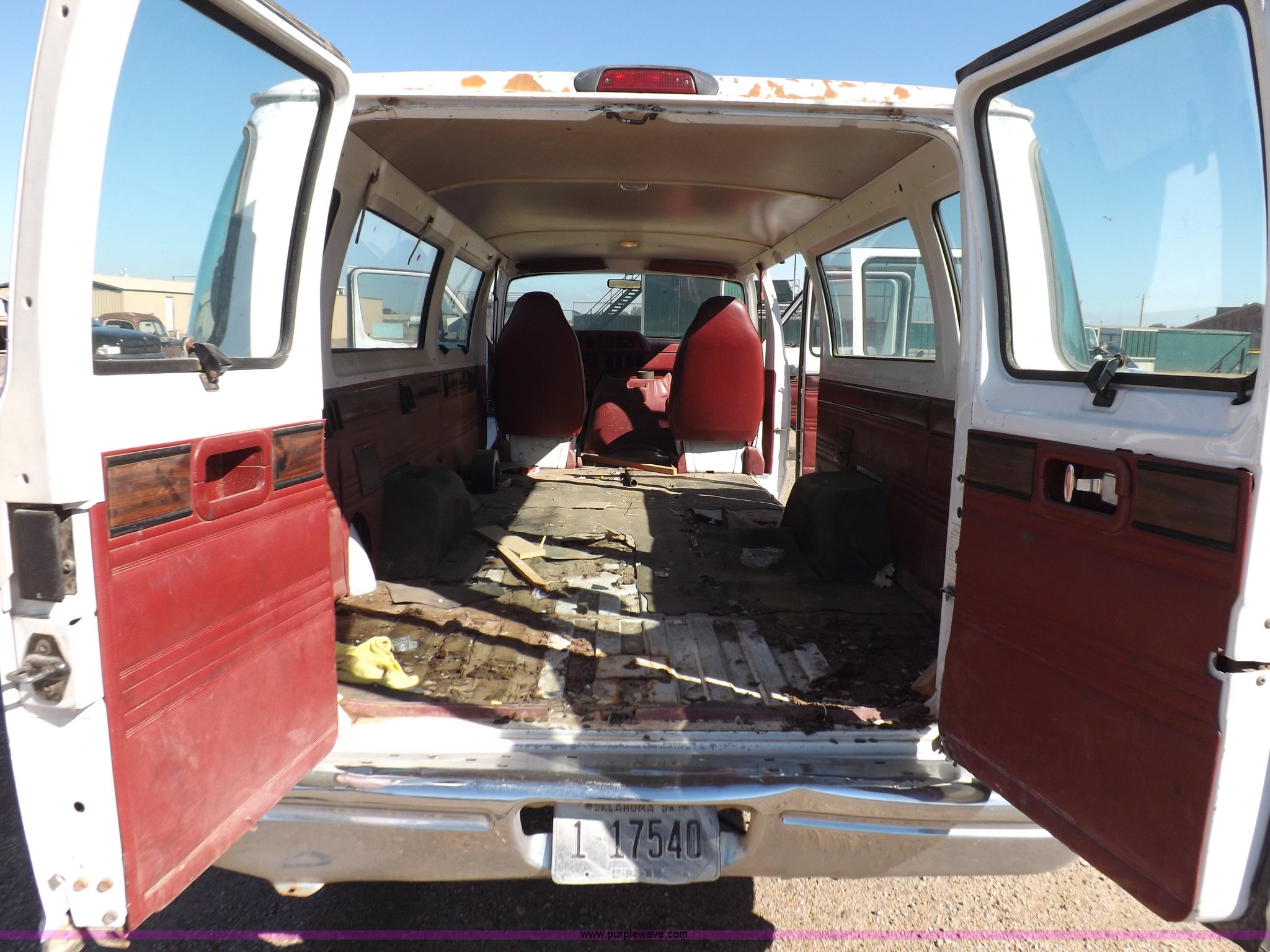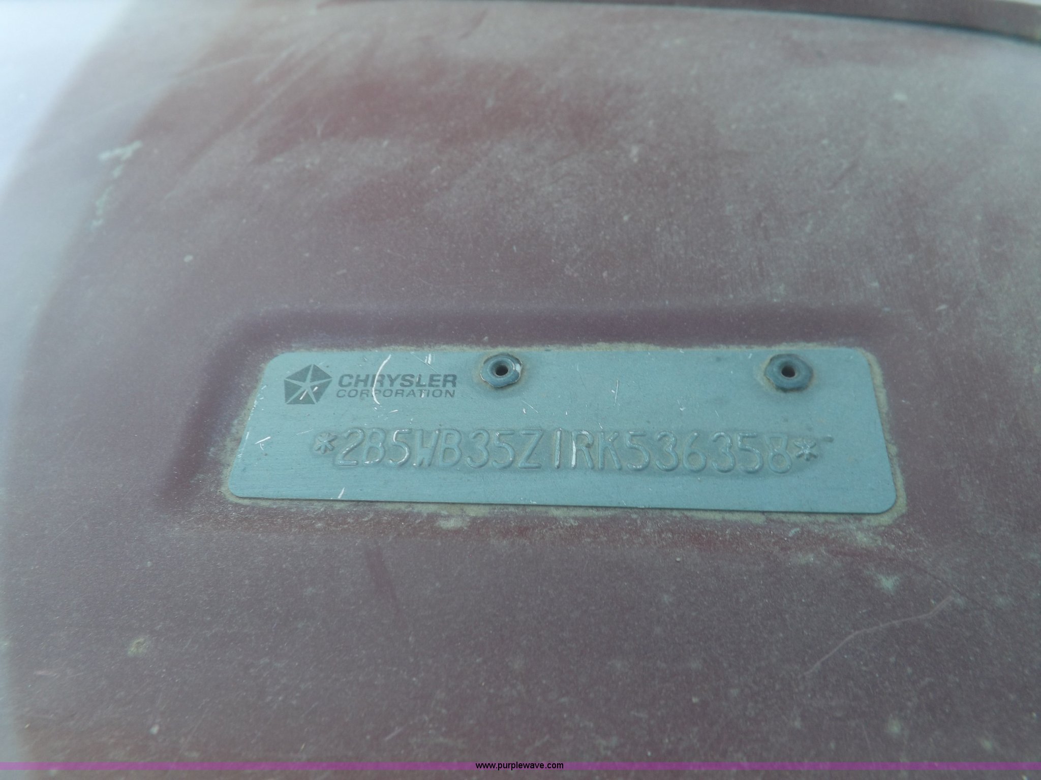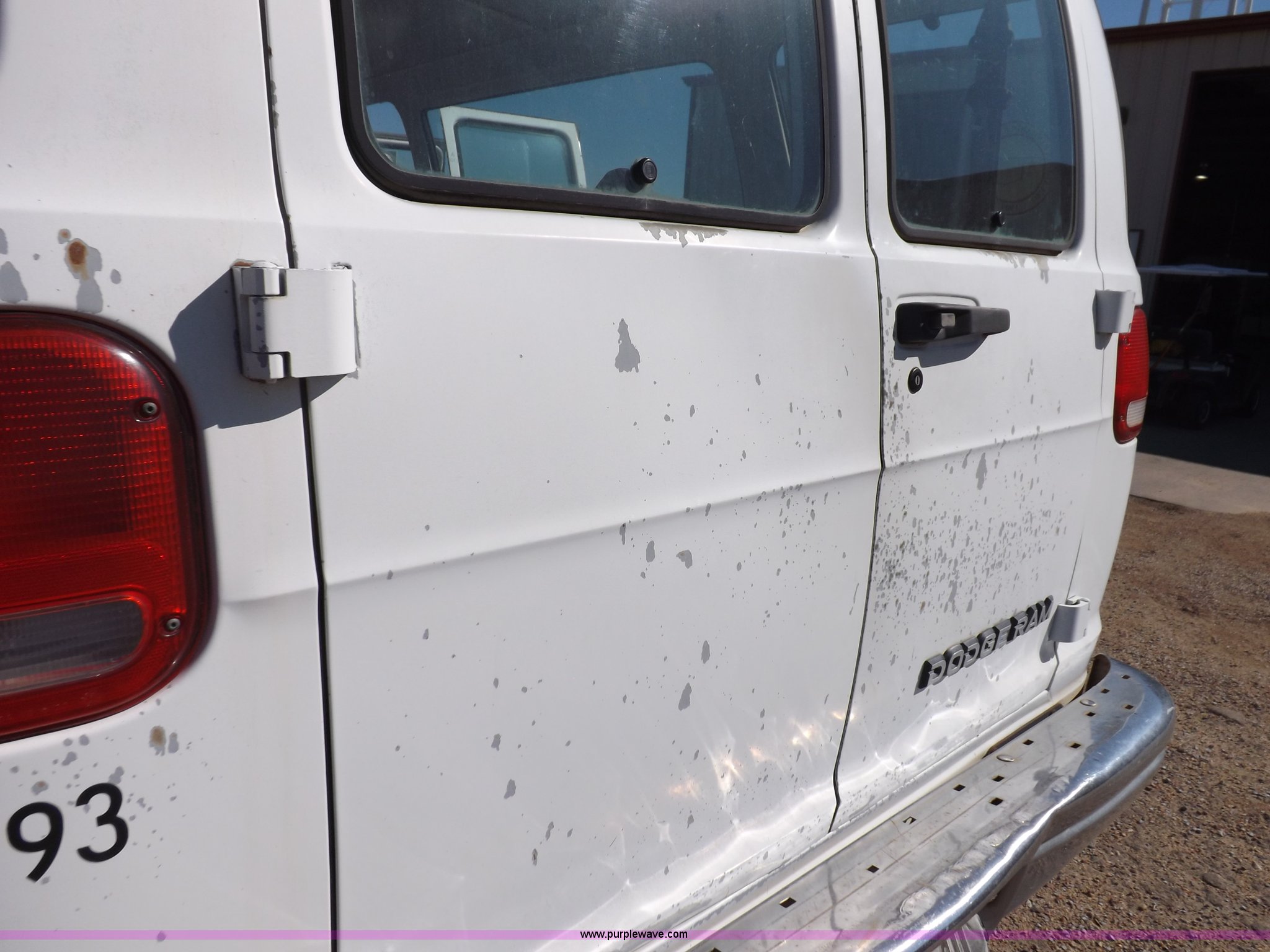 Purple Wave is selling a used 3/4 or 1 Ton Pickup or Van in Oklahoma. This item is a 1994 Dodge Ram B350 van with the following: 214,205 actual miles, 5.9L V8 OHV 16V gas engine, Automatic transmission, AC and heat, Tilt, Cruise, AM/FM, Manual windows and locks, Vinyl interior, 126" wheelbase, 225/75R16 tires, Interior/exterior cosmetic damage, Ignition switch operational, but needs replaced, Driver seat torn, Hail damage, Paint damage, Driver door hinges broken, Passenger seating removed, Unit# 93