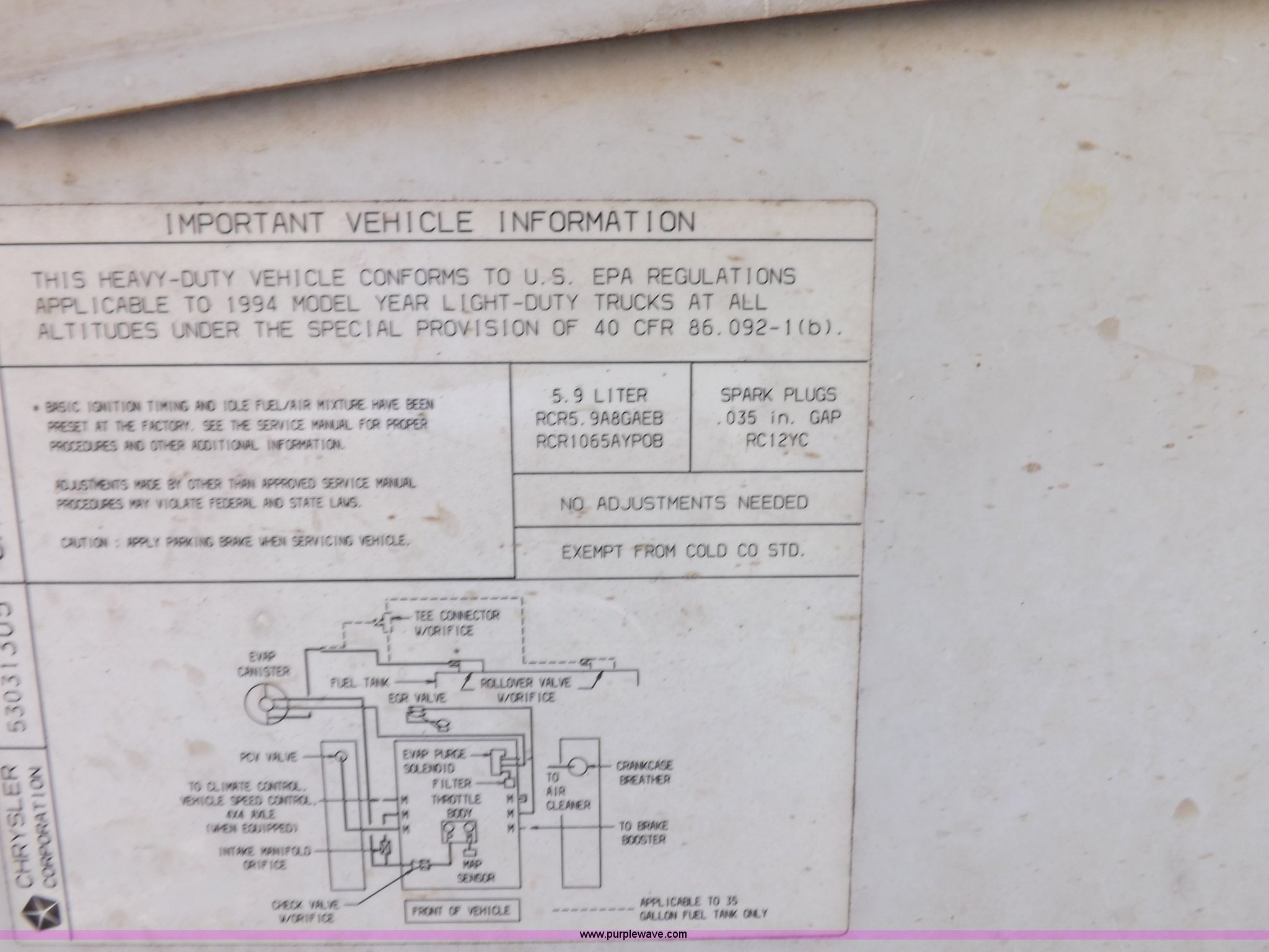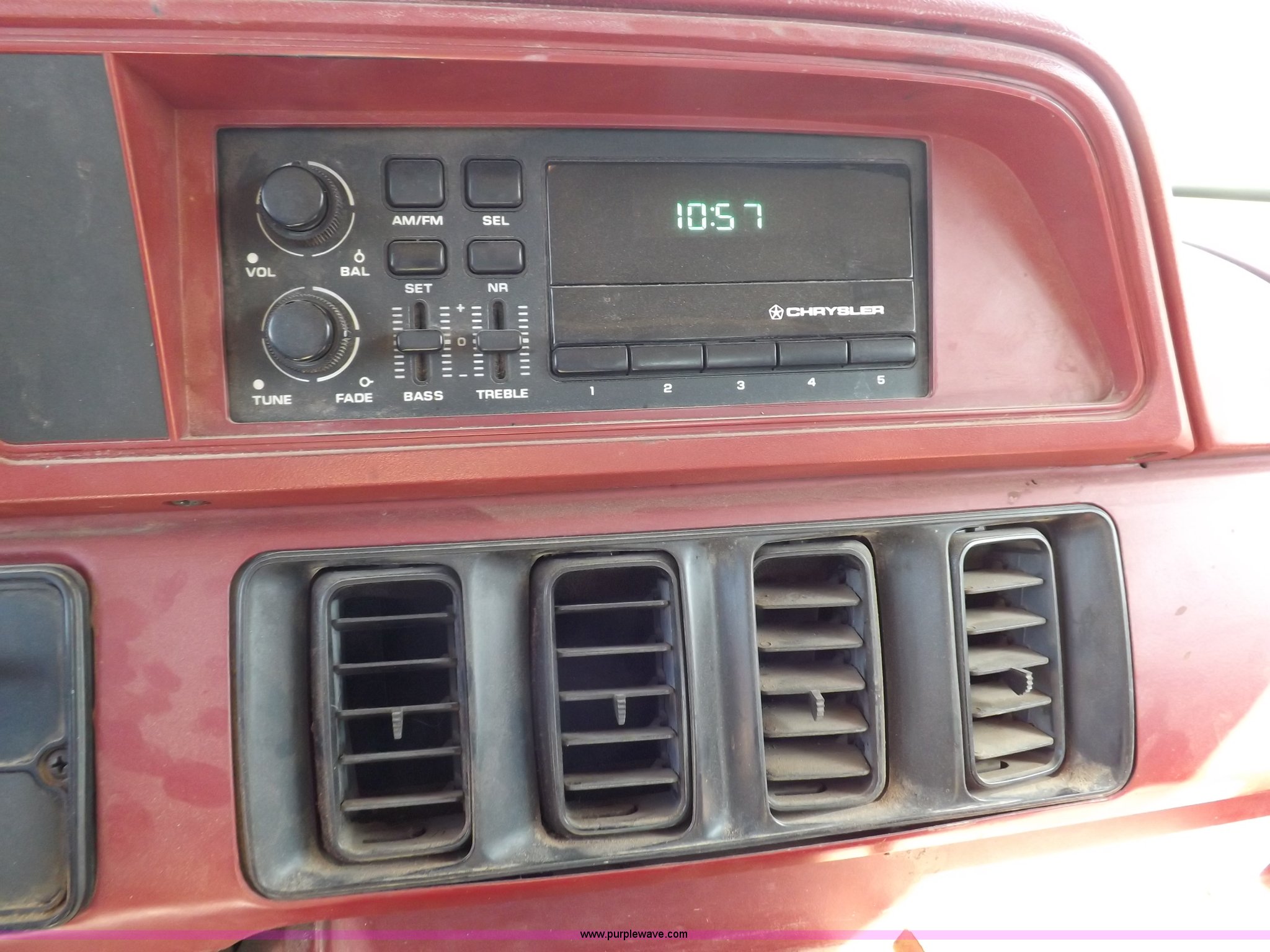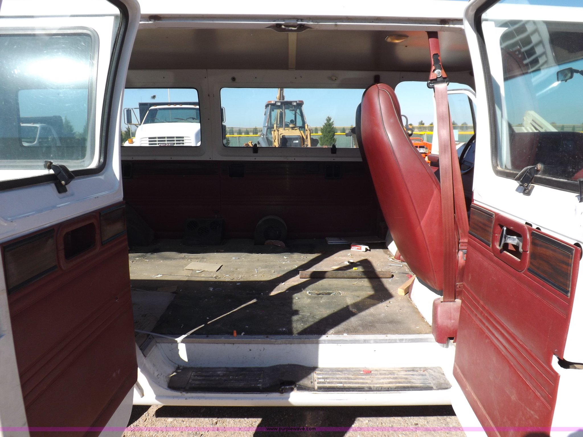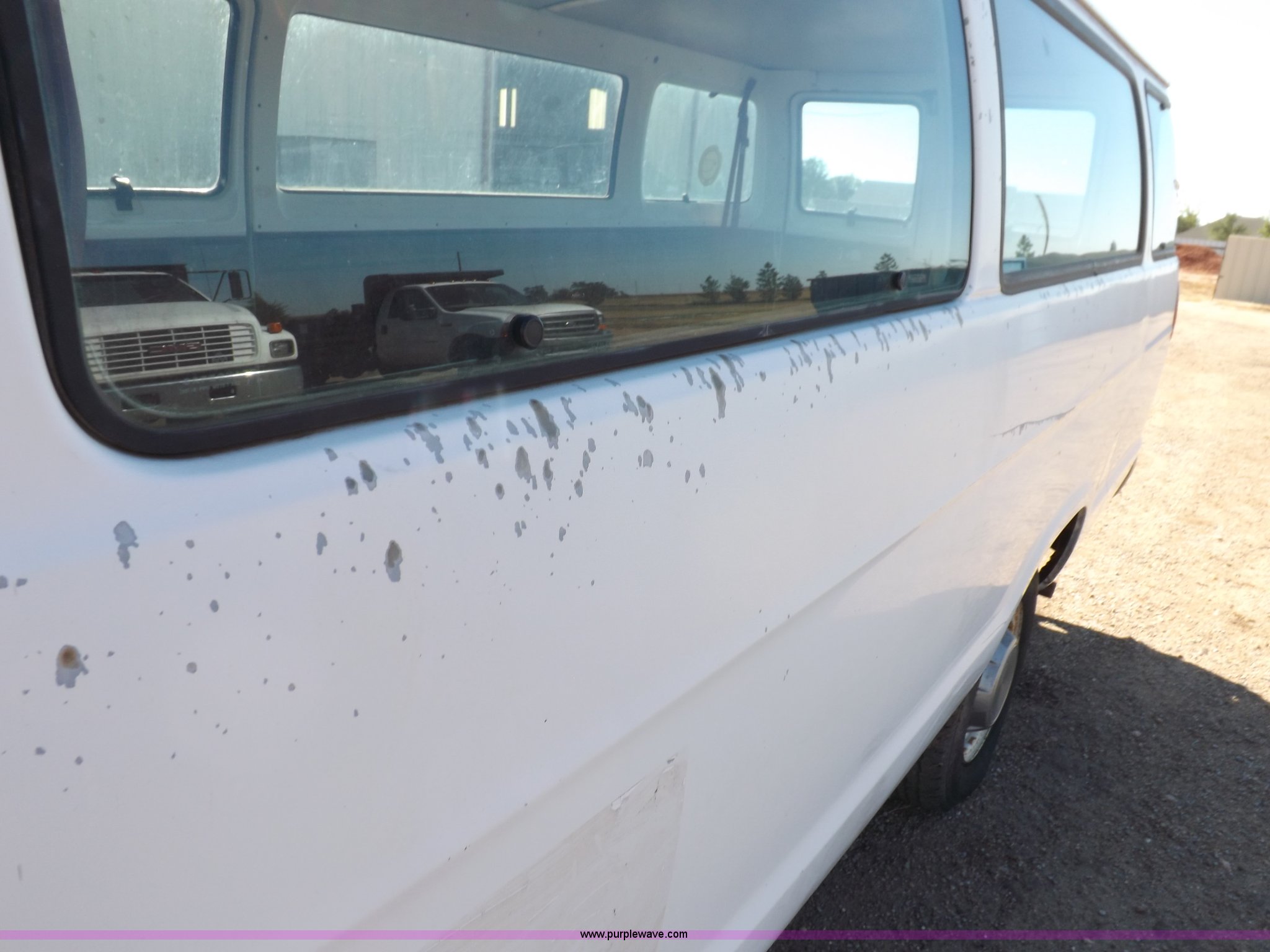 Purple Wave is selling a used 3/4 or 1 Ton Pickup or Van in Oklahoma. This item is a 1994 Dodge Ram B350 van with the following: 214,205 actual miles, 5.9L V8 OHV 16V gas engine, Automatic transmission, AC and heat, Tilt, Cruise, AM/FM, Manual windows and locks, Vinyl interior, 126" wheelbase, 225/75R16 tires, Interior/exterior cosmetic damage, Ignition switch operational, but needs replaced, Driver seat torn, Hail damage, Paint damage, Driver door hinges broken, Passenger seating removed, Unit# 93