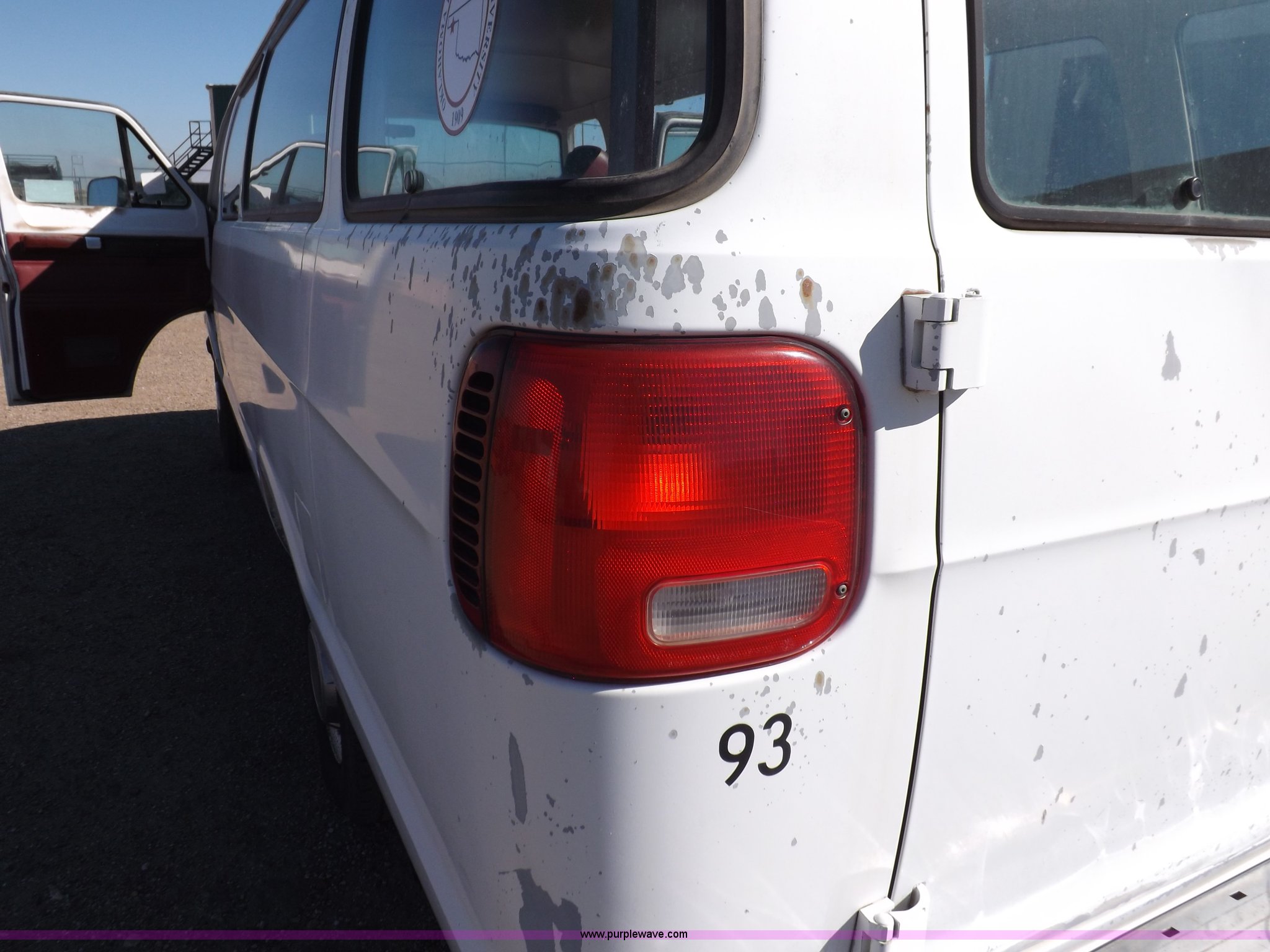 1994 Dodge Ram B350 van. 214,205 actual miles, 5.9L V8 OHV 16V gas engine, Automatic transmission, AC and heat, Tilt, Cruise, AM/FM, Manual windows and locks, Vinyl interior, 126" wheelbase, 225/75R16 tires, Interior/exterior cosmetic damage, Ignition switch operational, but needs replaced, Driver seat torn, Hail damage, Paint damage, Driver door hinges broken, Passenger seating removed, Unit# 93. 2B5WB35Z1RK536358. Oklahoma Panhandle State University. 323 W Eagle Blvd. Goodwell, OK 73939