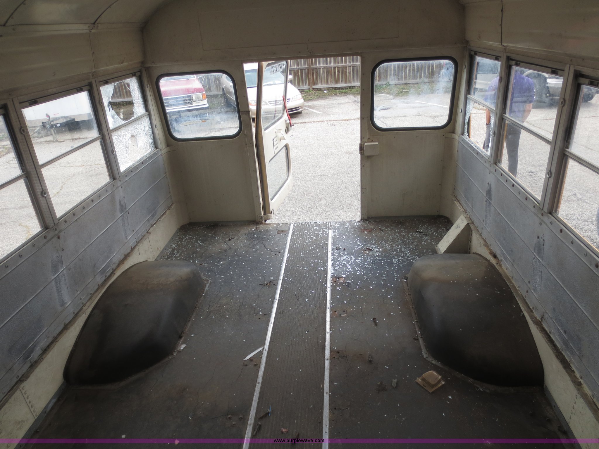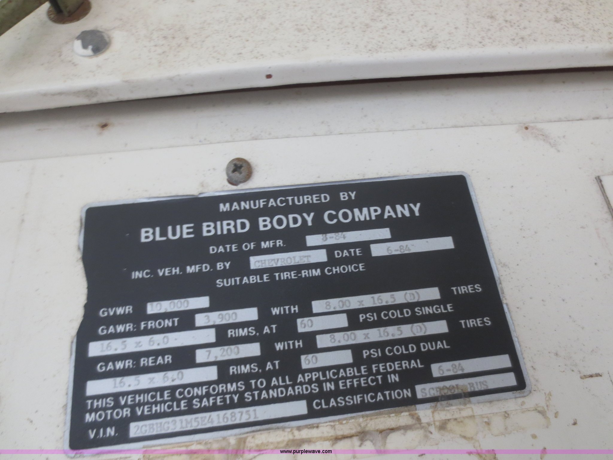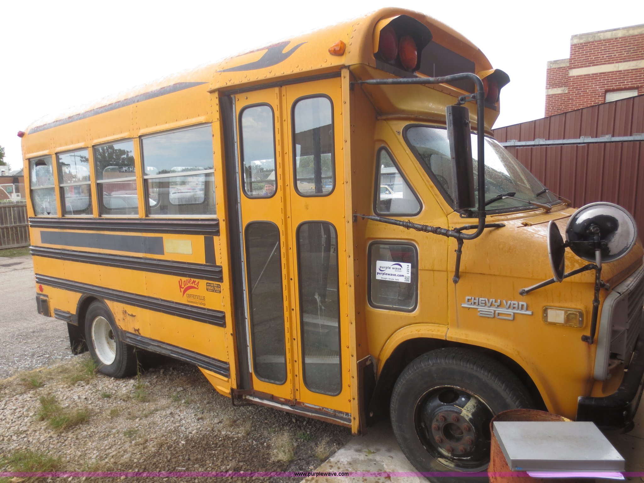 Purple Wave is selling a used Bus in Kansas. This item is a 1984 Chevrolet G30 school bus with the following: 39,715 miles on odometer, 5.7L V8 OHV 16V gas engine, Automatic transmission, Manual windows and locks, 21 passenger capacity, 8.75R16.5LT front tires, Tires need replaced, LT215/85R16 tires, GVW 10,000 lbs, No rear seats, Broken glass, Cracked windshield