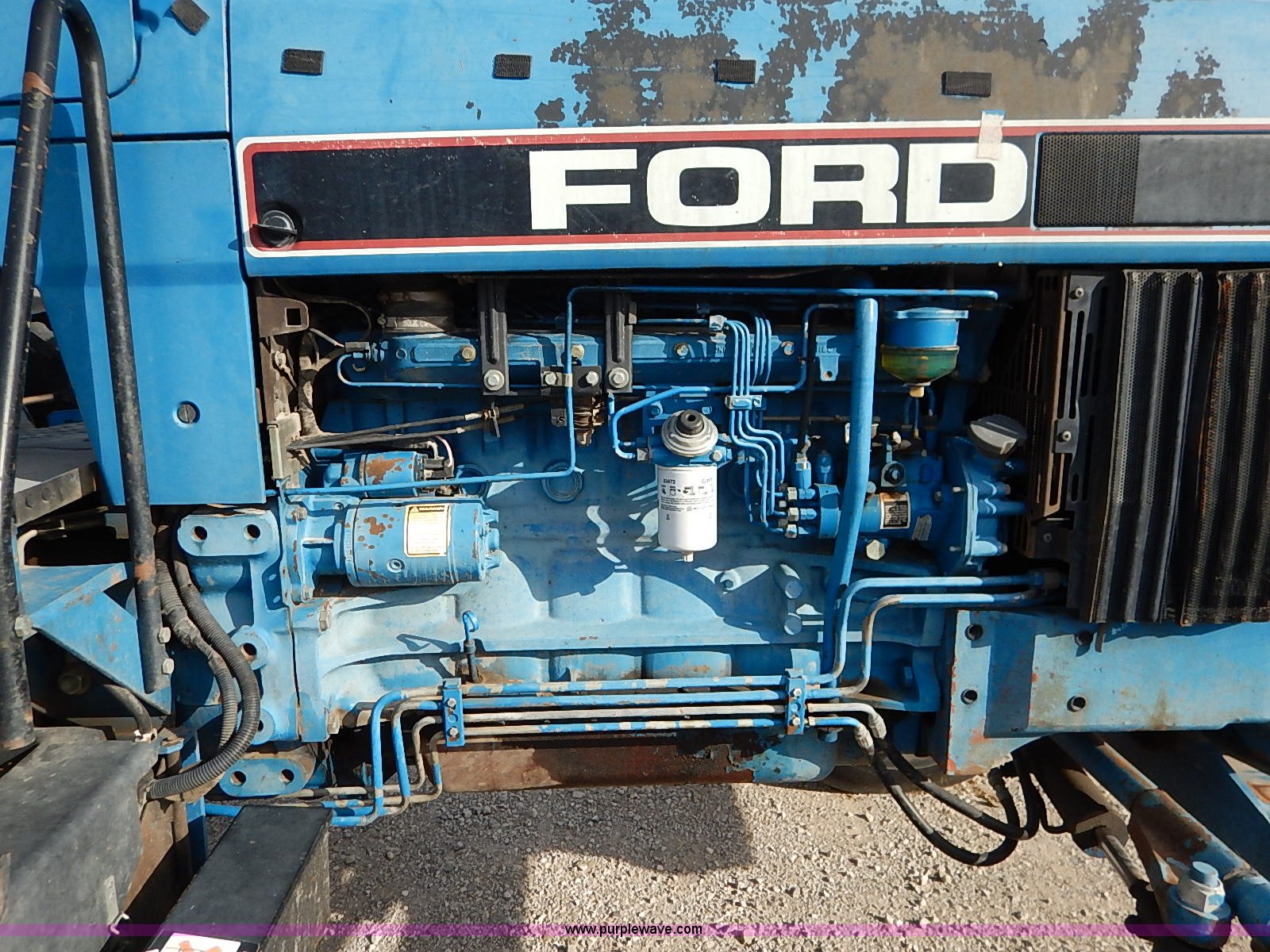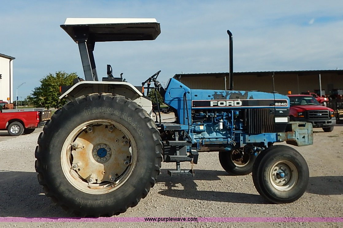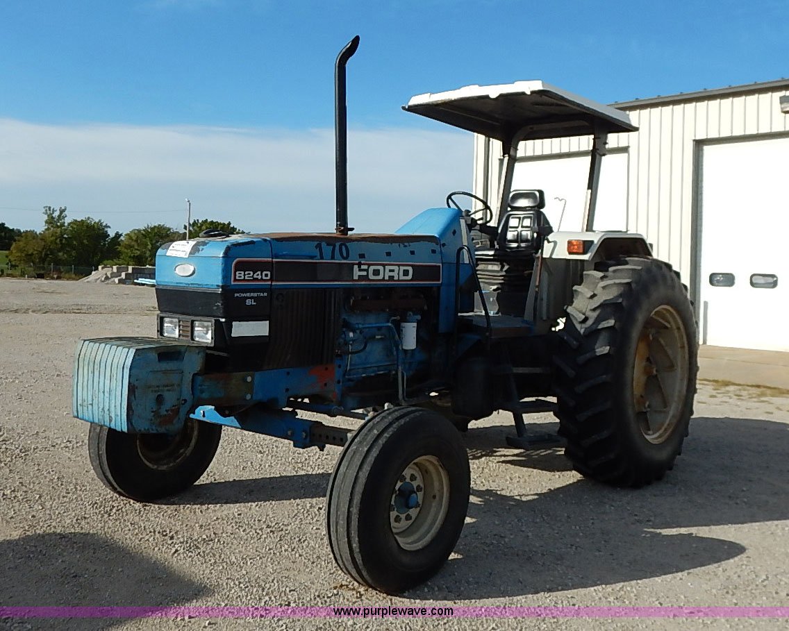 Purple Wave is selling a used Tractor in Kansas. This item is a Ford 8240 Powerstar SL tractor with the following: Approx. 5,928 hours, Ford six cylinder diesel engine, Serial 4419384A08, 12F-4R gears, Canopy, Vinyl seat, Work lights, Three point, Draw bar, 540/1000 PTO, Reversible clip PTO, (3) rear hydraulic remotes, (10) suitcase weights, 10.00-16 front tires, 18.4R38 rear tires, Serial BD67362