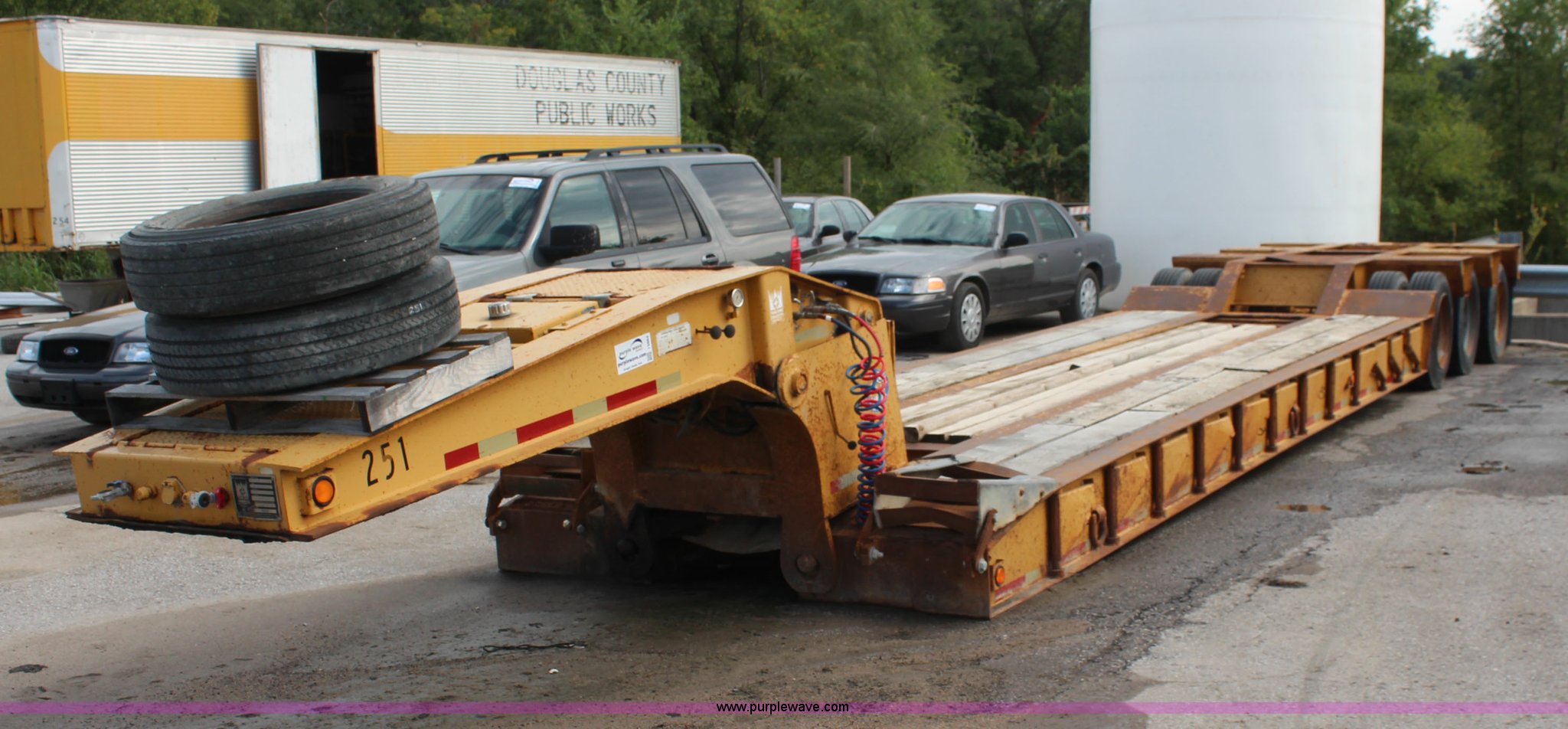 1986 Trail King 50 ton detachable lowboy trailer. Model 1552-4600, 22'L x 8'W deck, 12" deck extensions, 13'L over axles, D-ring tie downs, Kohler 8 HP gas engine Electric start, 255/70R22.5 tires, GVWR 117,500 lbs, GAWR 18,160 lbs, Axle bearings need replaced. Title distribution may be delayed up to 14 days from verification of funds. 1TKH04631GM077659. Douglas County Public Works. 711 E 23rd St. Lawrence, KS 66046