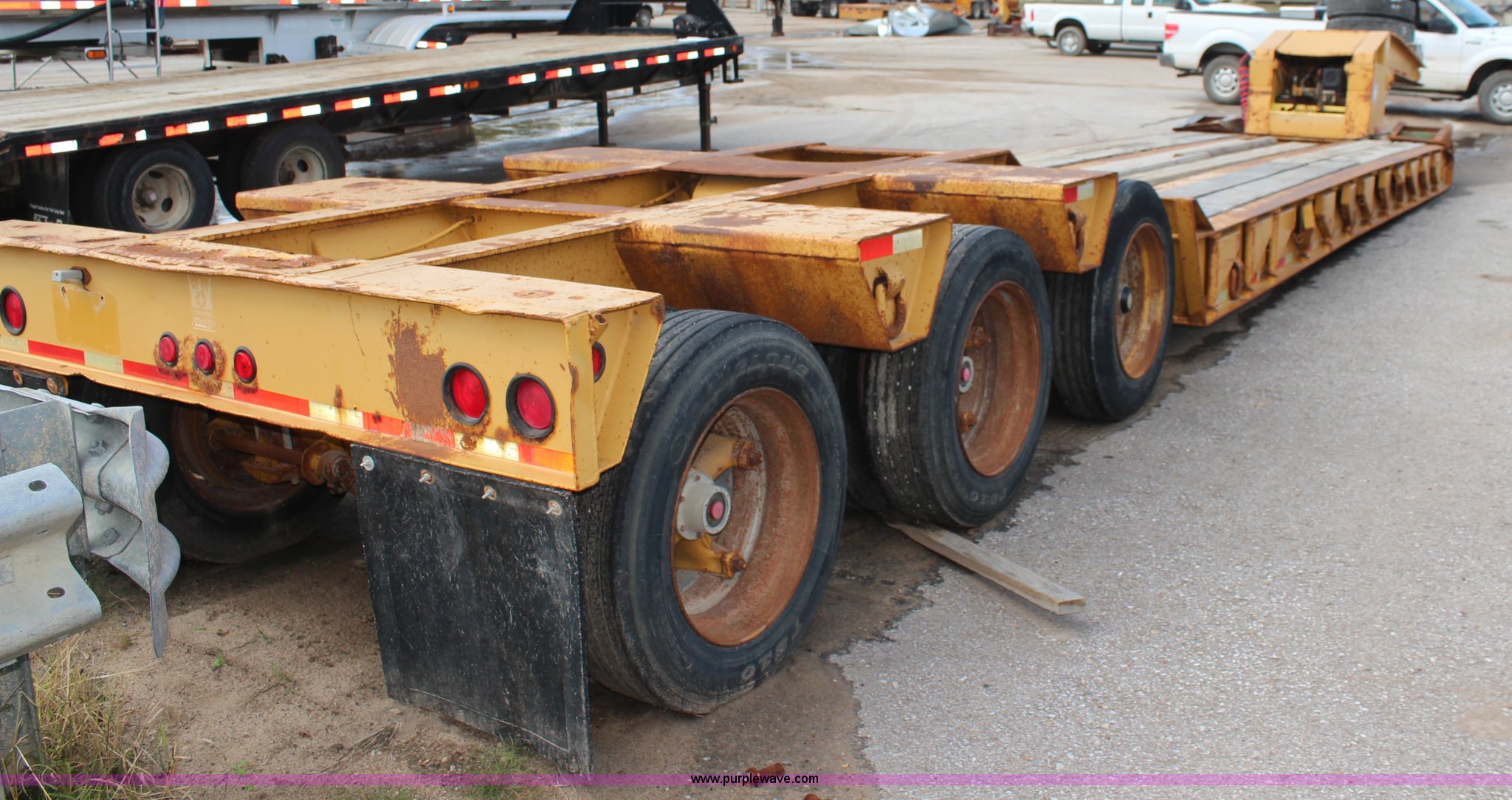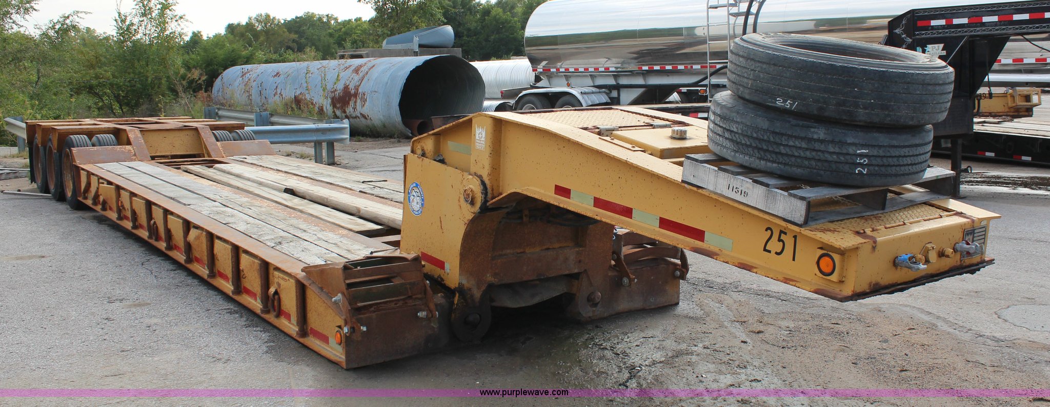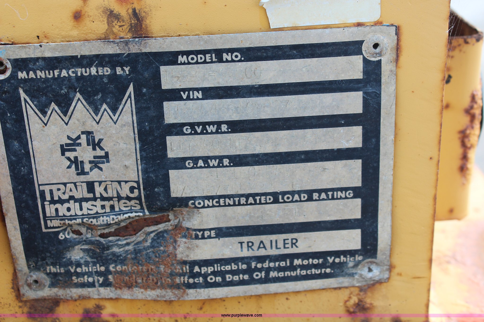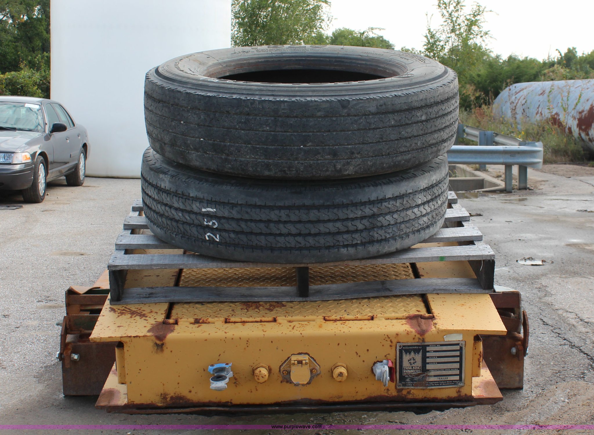 Purple Wave is selling a used Equip. Trailer in Kansas. This item is a 1986 Trail King 50 ton detachable lowboy trailer with the following: Model 1552-4600, 22'L x 8'W deck, 12" deck extensions, 13'L over axles, D-ring tie downs, Kohler 8 HP gas engine, Electric start, 255/70R22.5 tires, GVWR 117,500 lbs, GAWR 18,160 lbs, Axle bearings need replaced