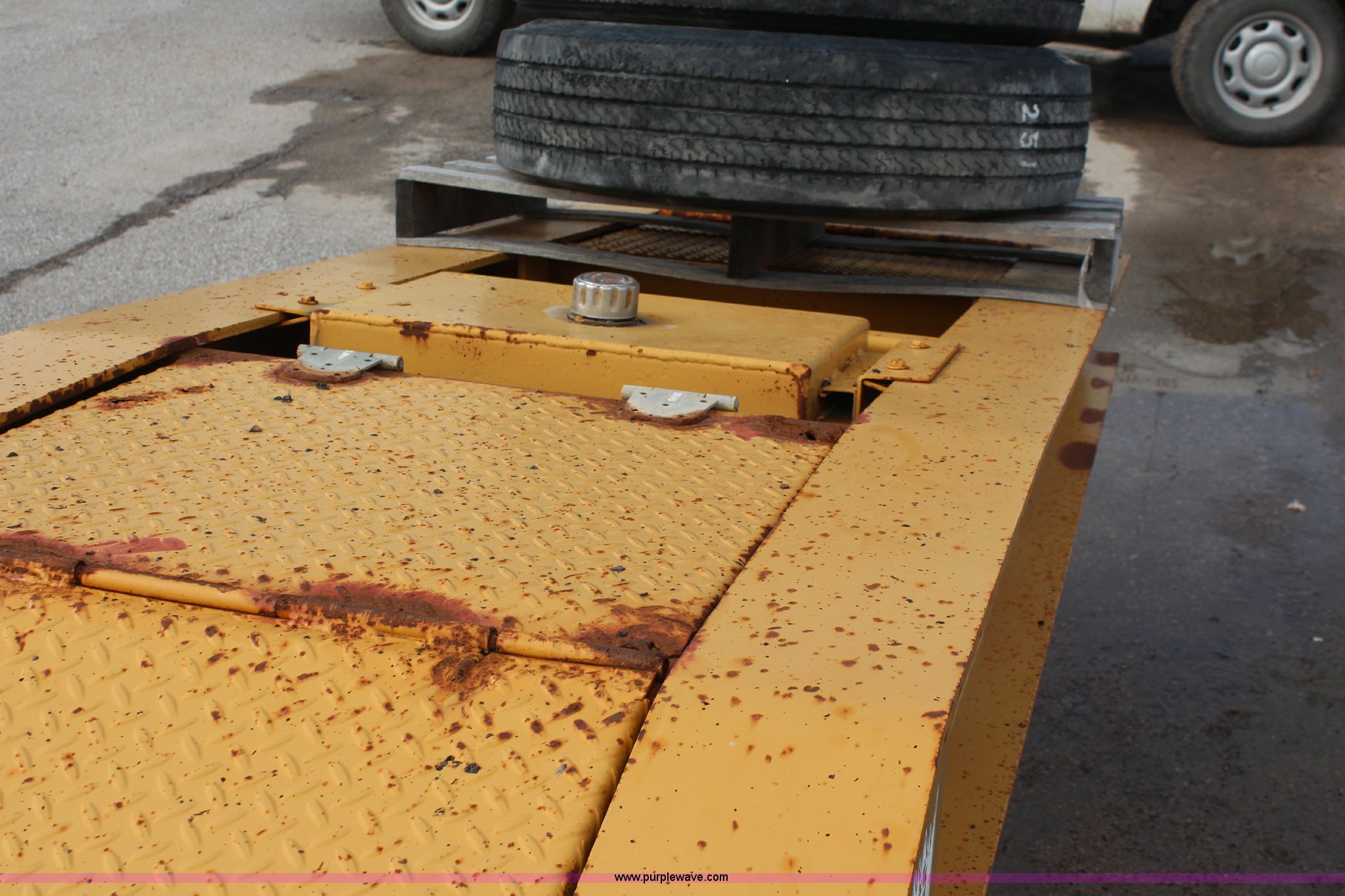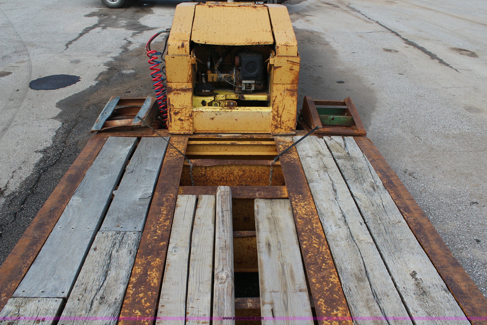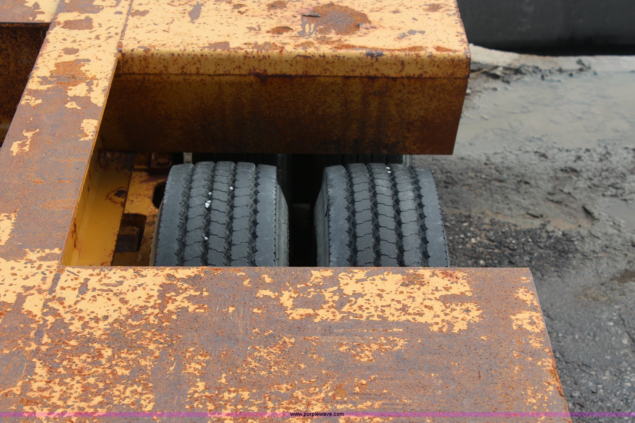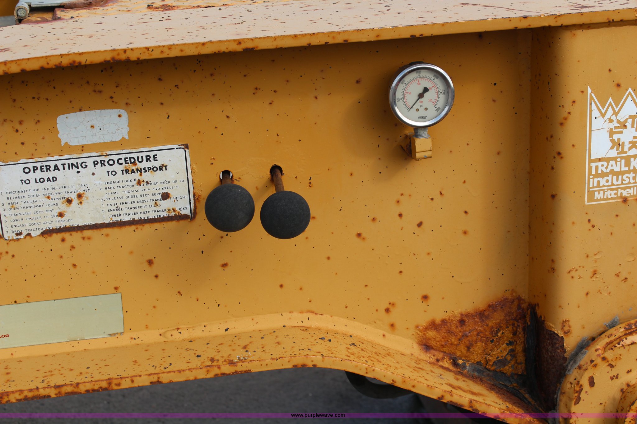 Purple Wave is selling a used Equip. Trailer in Kansas. This item is a 1986 Trail King 50 ton detachable lowboy trailer with the following: Model 1552-4600, 22'L x 8'W deck, 12" deck extensions, 13'L over axles, D-ring tie downs, Kohler 8 HP gas engine, Electric start, 255/70R22.5 tires, GVWR 117,500 lbs, GAWR 18,160 lbs, Axle bearings need replaced