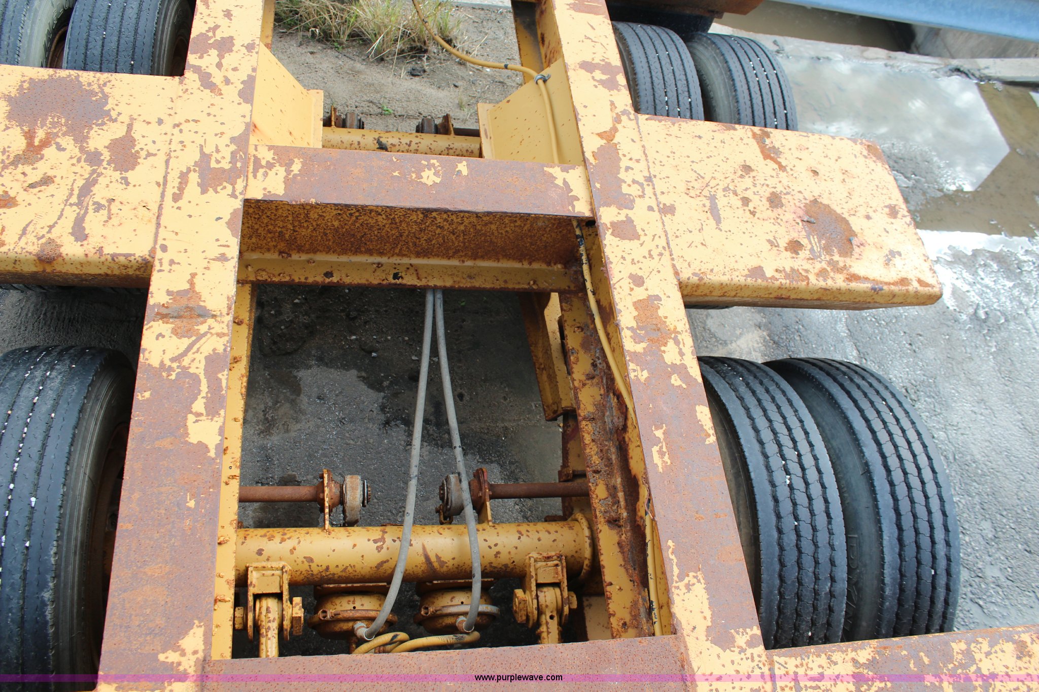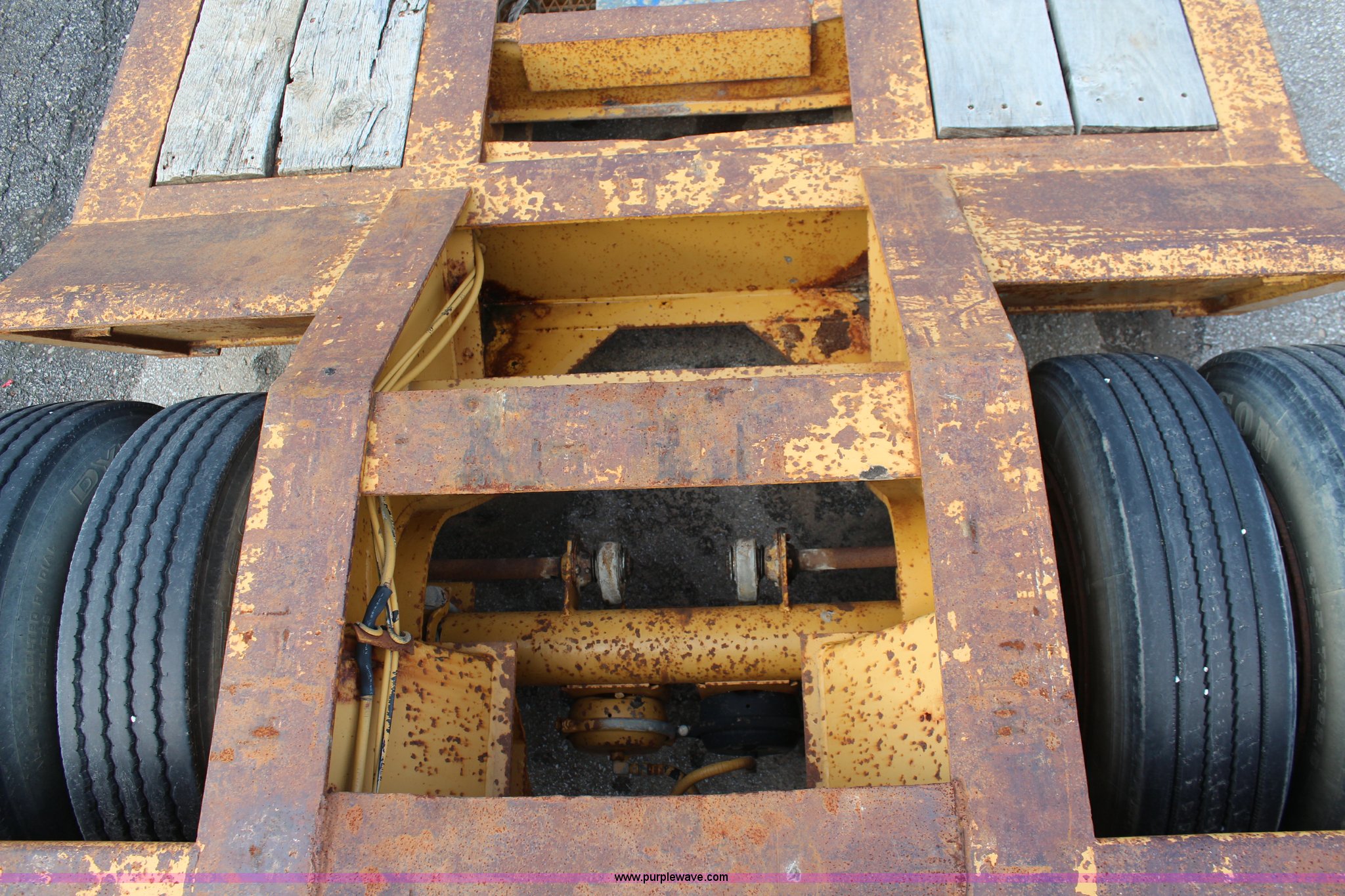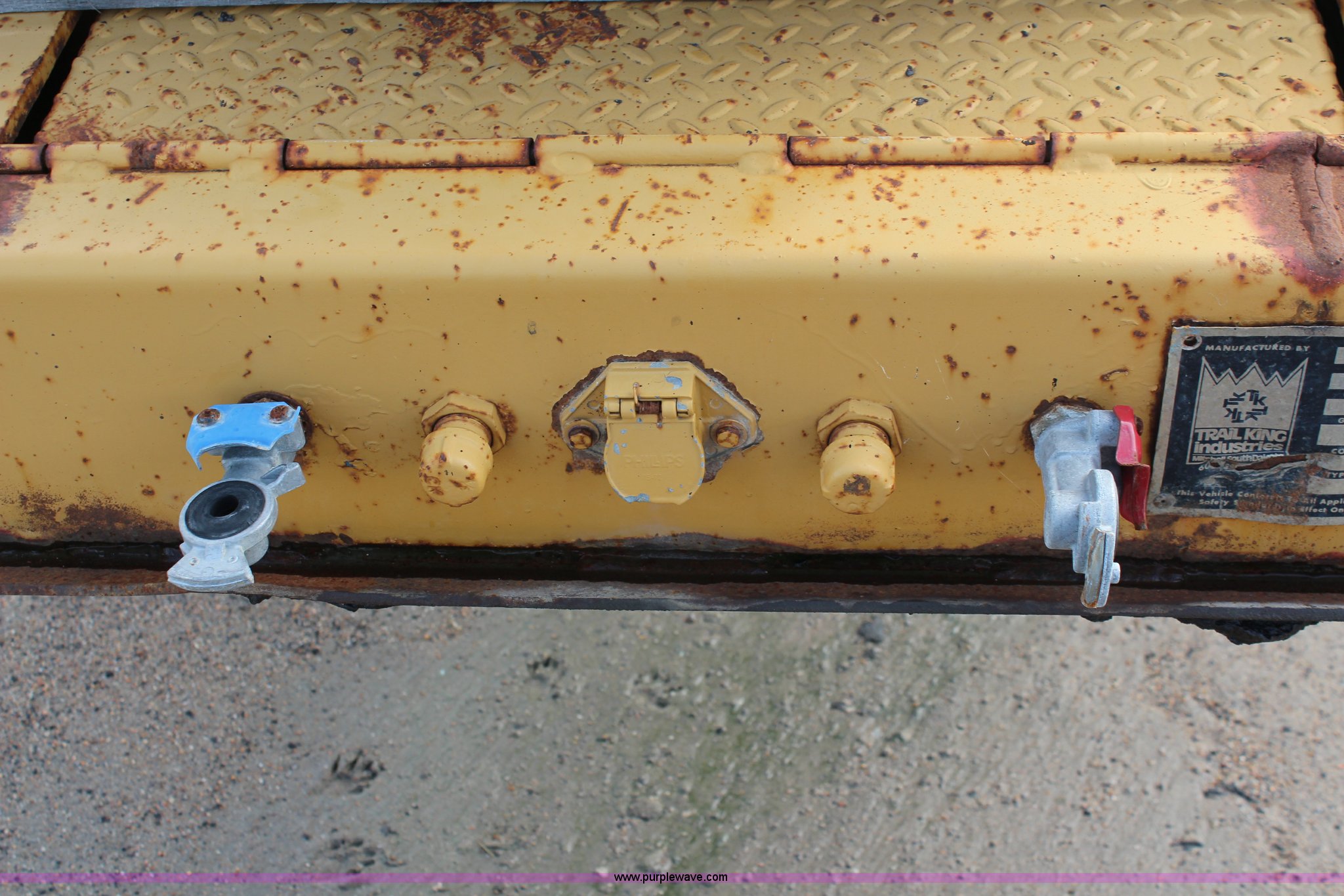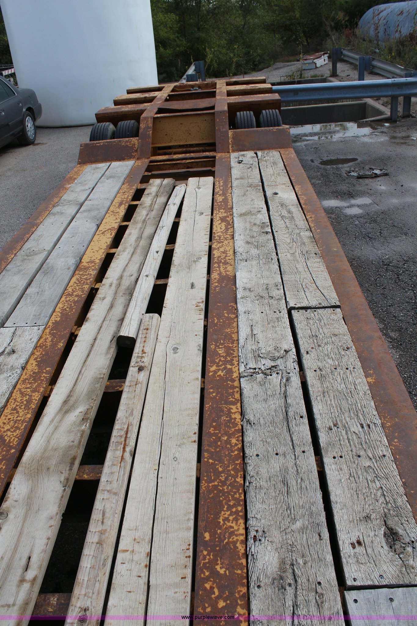 Purple Wave is selling a used Equip. Trailer in Kansas. This item is a 1986 Trail King 50 ton detachable lowboy trailer with the following: Model 1552-4600, 22'L x 8'W deck, 12" deck extensions, 13'L over axles, D-ring tie downs, Kohler 8 HP gas engine, Electric start, 255/70R22.5 tires, GVWR 117,500 lbs, GAWR 18,160 lbs, Axle bearings need replaced