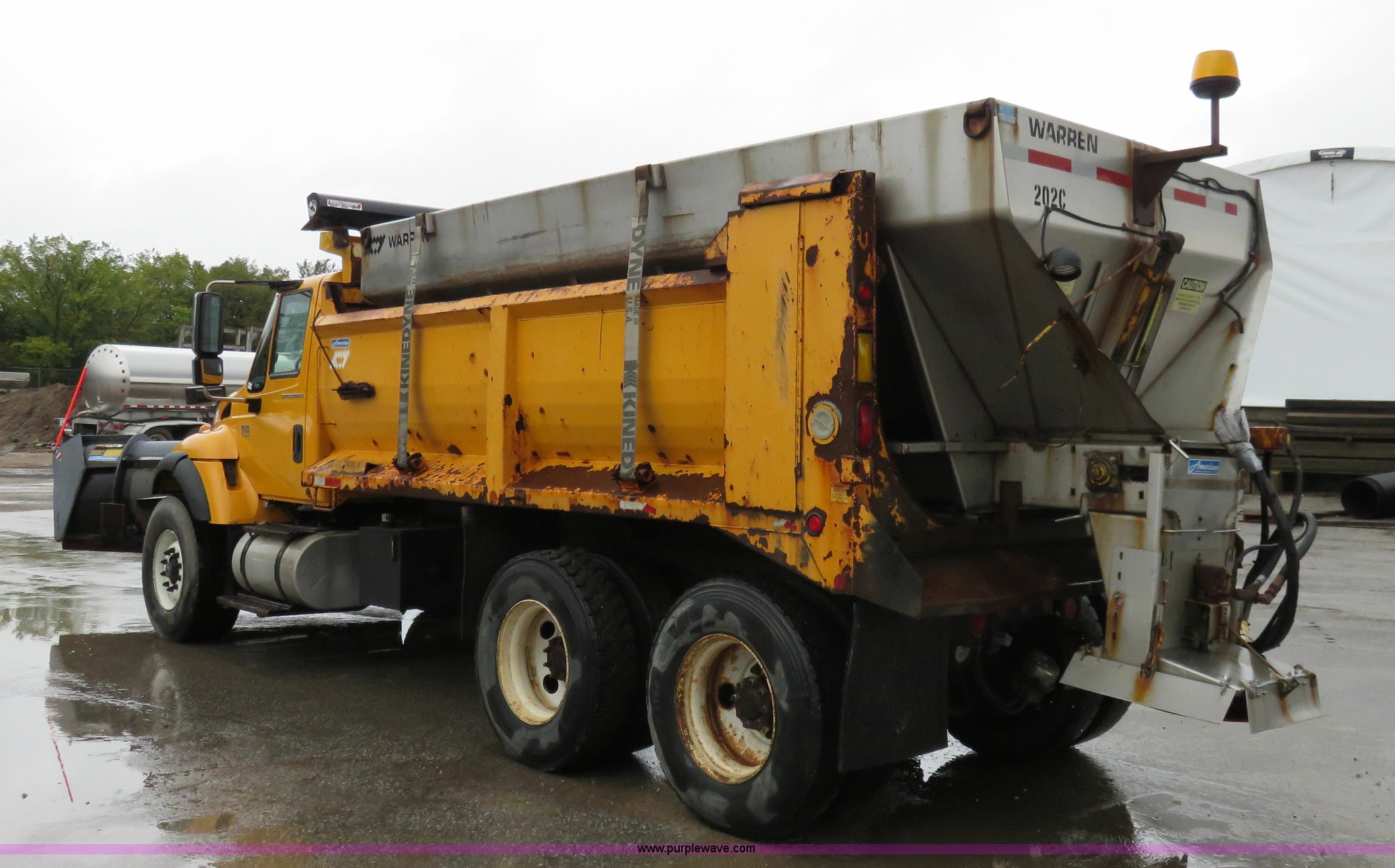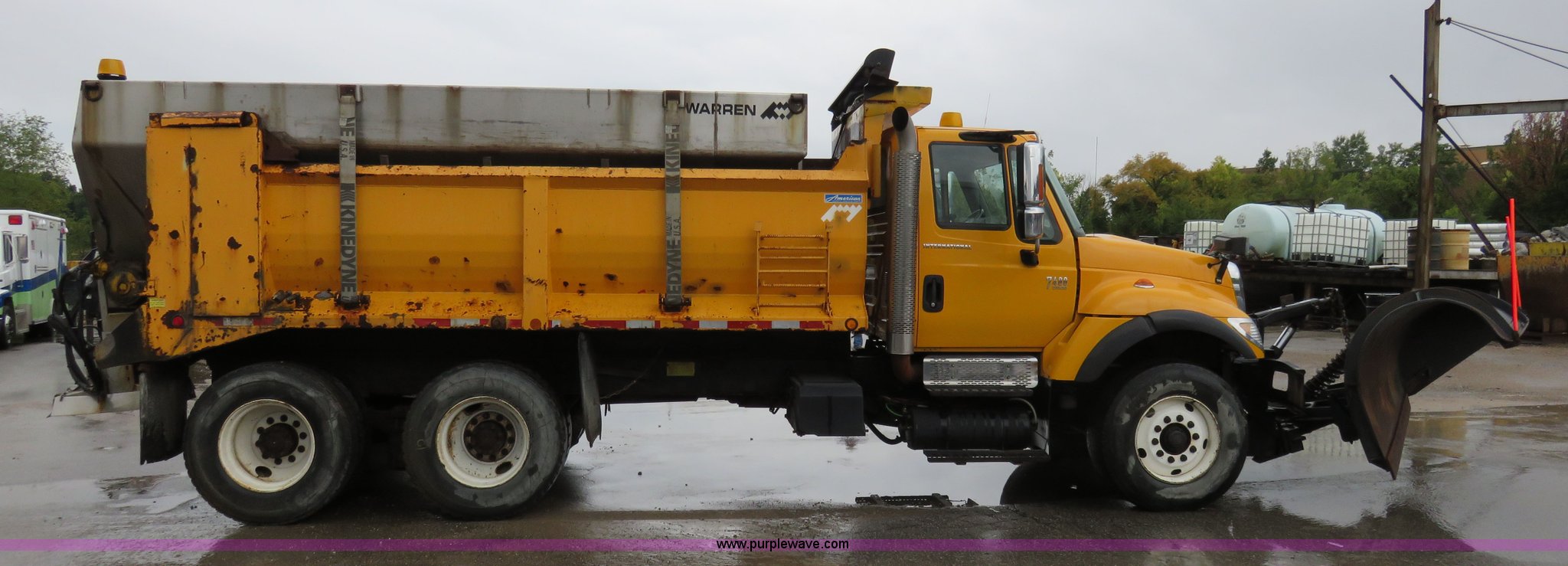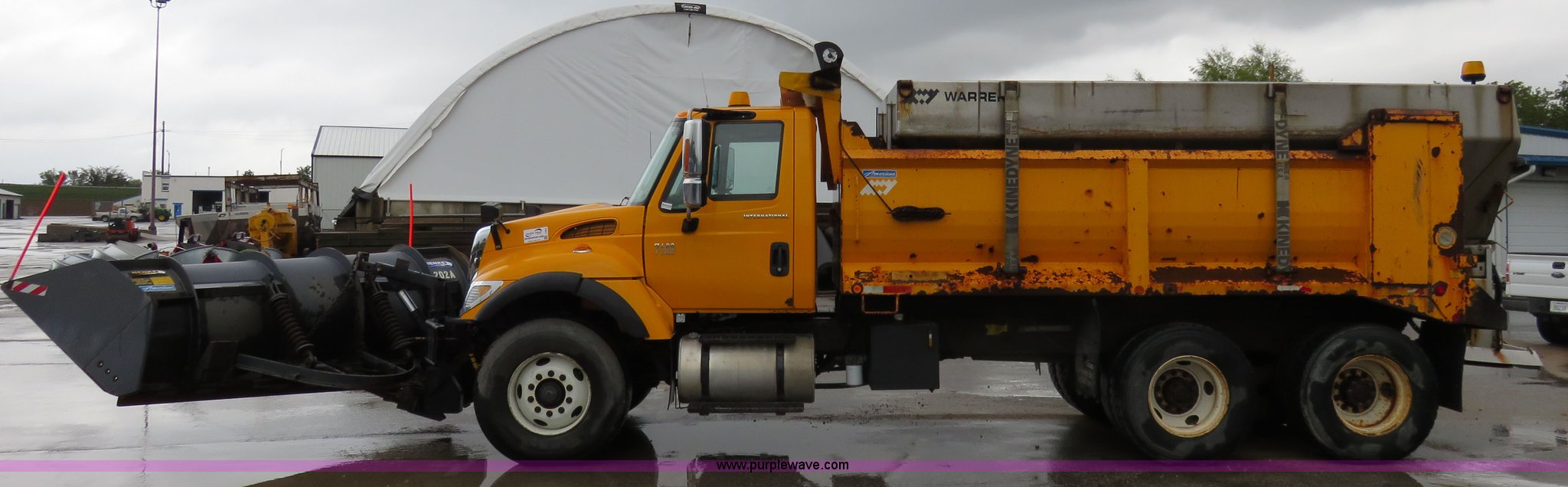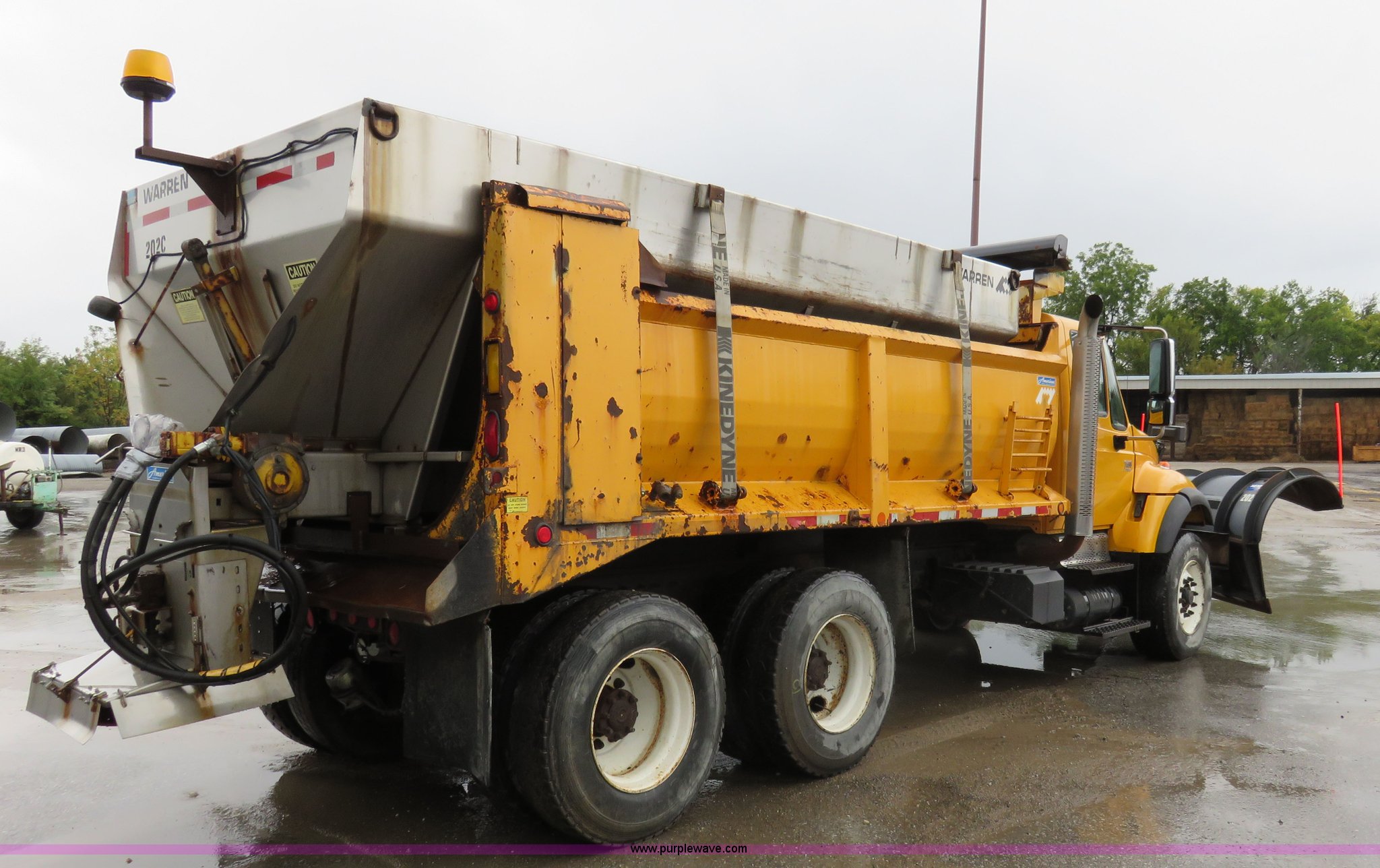 Purple Wave is selling a used Construction Dump Truck in Kansas. This item is a 2004 International 7400 dump truck with the following: 191,805 miles on odometer, International DT530 8.7L L6 diesel engine, Allison automatic transmission, Twin screw, AC and heat, Cruise, AM/FM/cassette, Air suspension seat, Heated mirrors, 15' dump bed, Rollover tarp, End gate, 50 gallon fuel tank, PTO, Henke 10' plow, Warren 15' spreader, Air brakes, 11R22.5 tires, GVWR 58,000 lbs, FAWR 18,000 lbs, IAWR 20,000 lbs, RAWR 20,000 lbs, Cracked windshield, Conveyor chain in spreader is broken