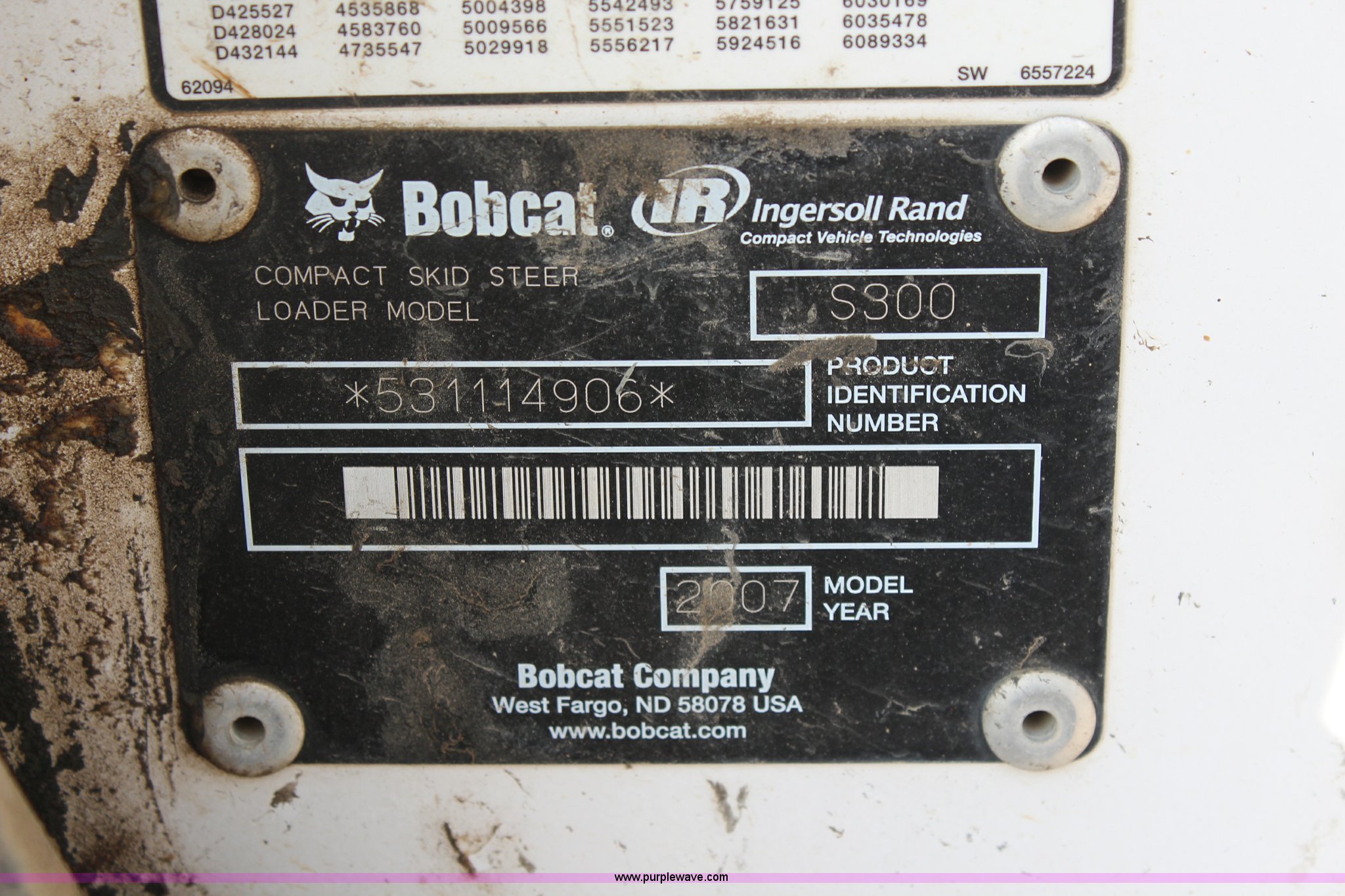 Purple Wave is selling a used Skid Steer Loader in Kansas. This item is a 2007 Bobcat S300 skid steer with the following: 2,359 hours on meter, Kubota four cylinder diesel engine, 81 HP, Hydrostatic transmission, Spring suspension seat, Bucket foot controls, Side glass, Back glass, Front work lights, Auxiliary hydraulics, Hydraulic quick coupler, 80"W bucket, Bolt-on teeth, 12x16.5 tires, 8,448 lbs. base operating weight, Serial 531114906