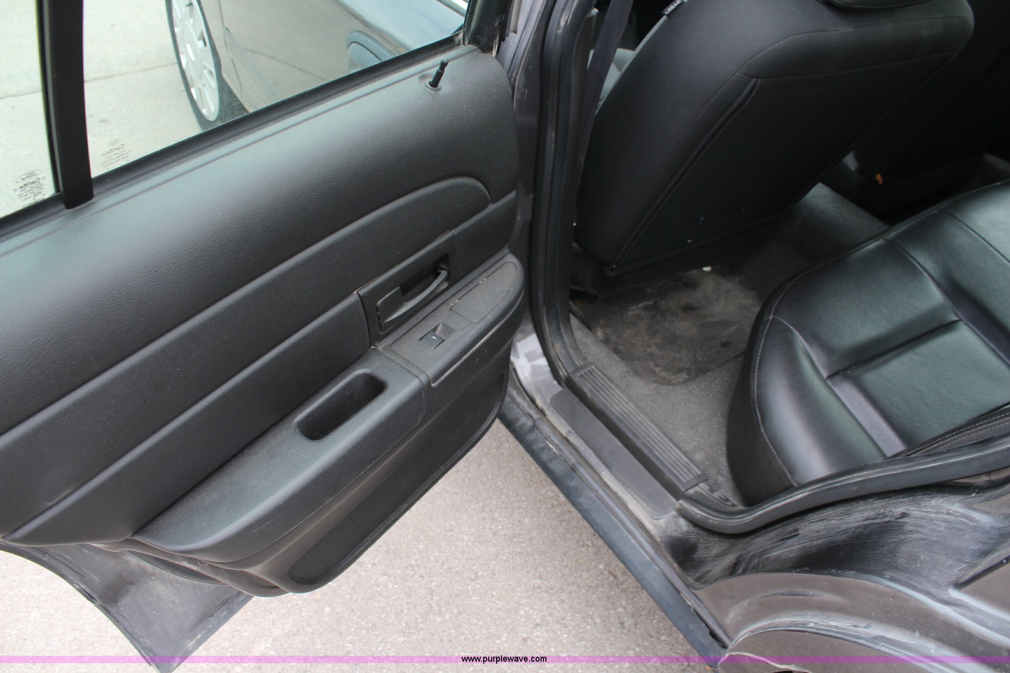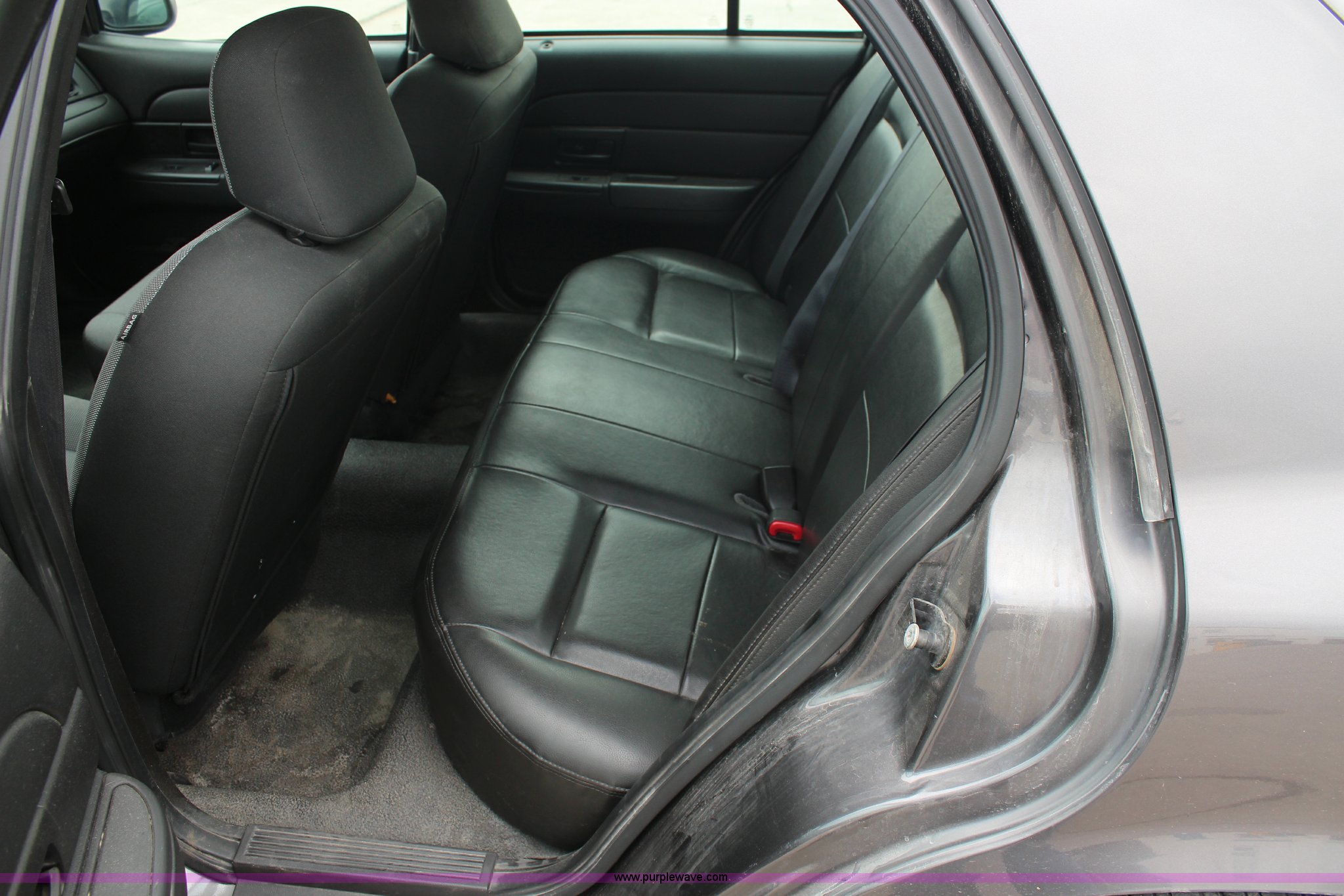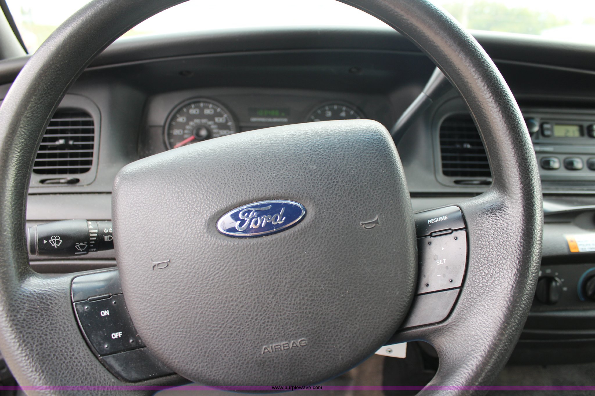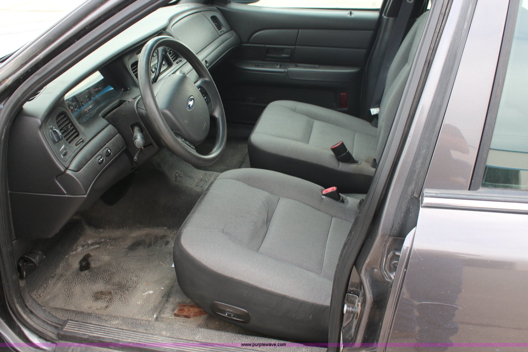 Purple Wave is selling a used Passenger Vehicle in Kansas. This item is a 2009 Ford Crown Victoria Police Interceptor with the following: 103,486 miles on odometer, 4.6L V8 SOHC 16V FFV gas engine, Automatic transmission, AC and heat, Tilt, Cruise, AM/FM, Power windows, locks, mirrors, and seats, Cloth interior, Vinyl rear seat, 235/55R17 tires, Holes from equipment have been plugged