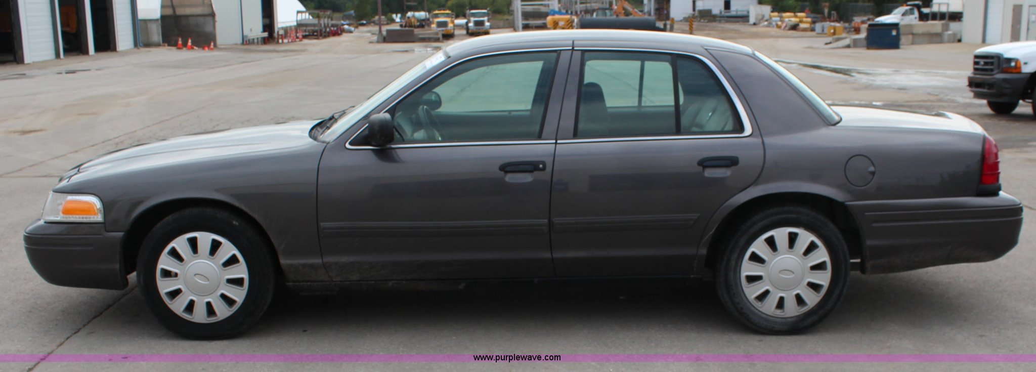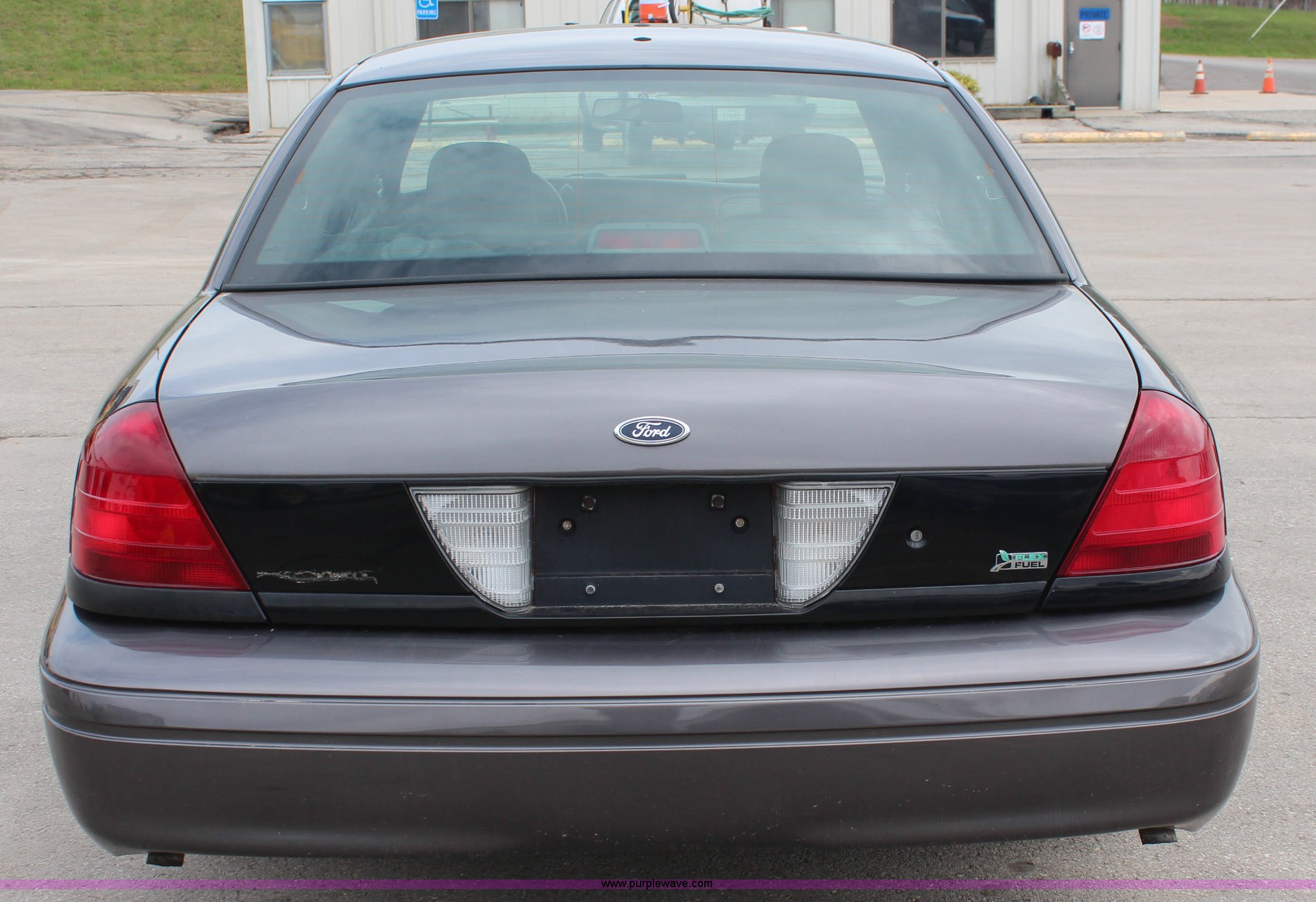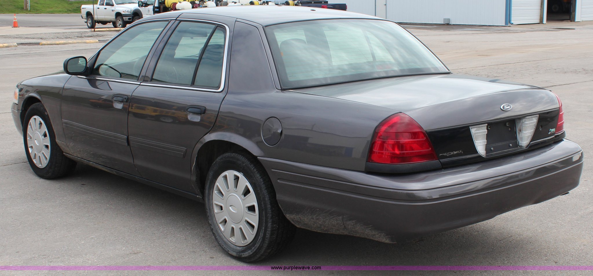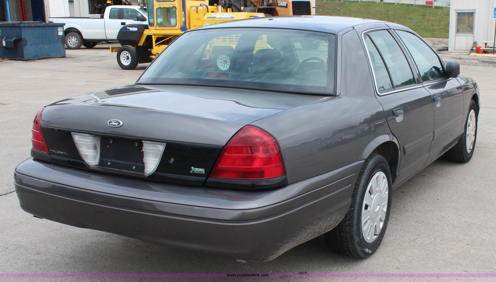 Purple Wave is selling a used Passenger Vehicle in Kansas. This item is a 2009 Ford Crown Victoria Police Interceptor with the following: 103,486 miles on odometer, 4.6L V8 SOHC 16V FFV gas engine, Automatic transmission, AC and heat, Tilt, Cruise, AM/FM, Power windows, locks, mirrors, and seats, Cloth interior, Vinyl rear seat, 235/55R17 tires, Holes from equipment have been plugged