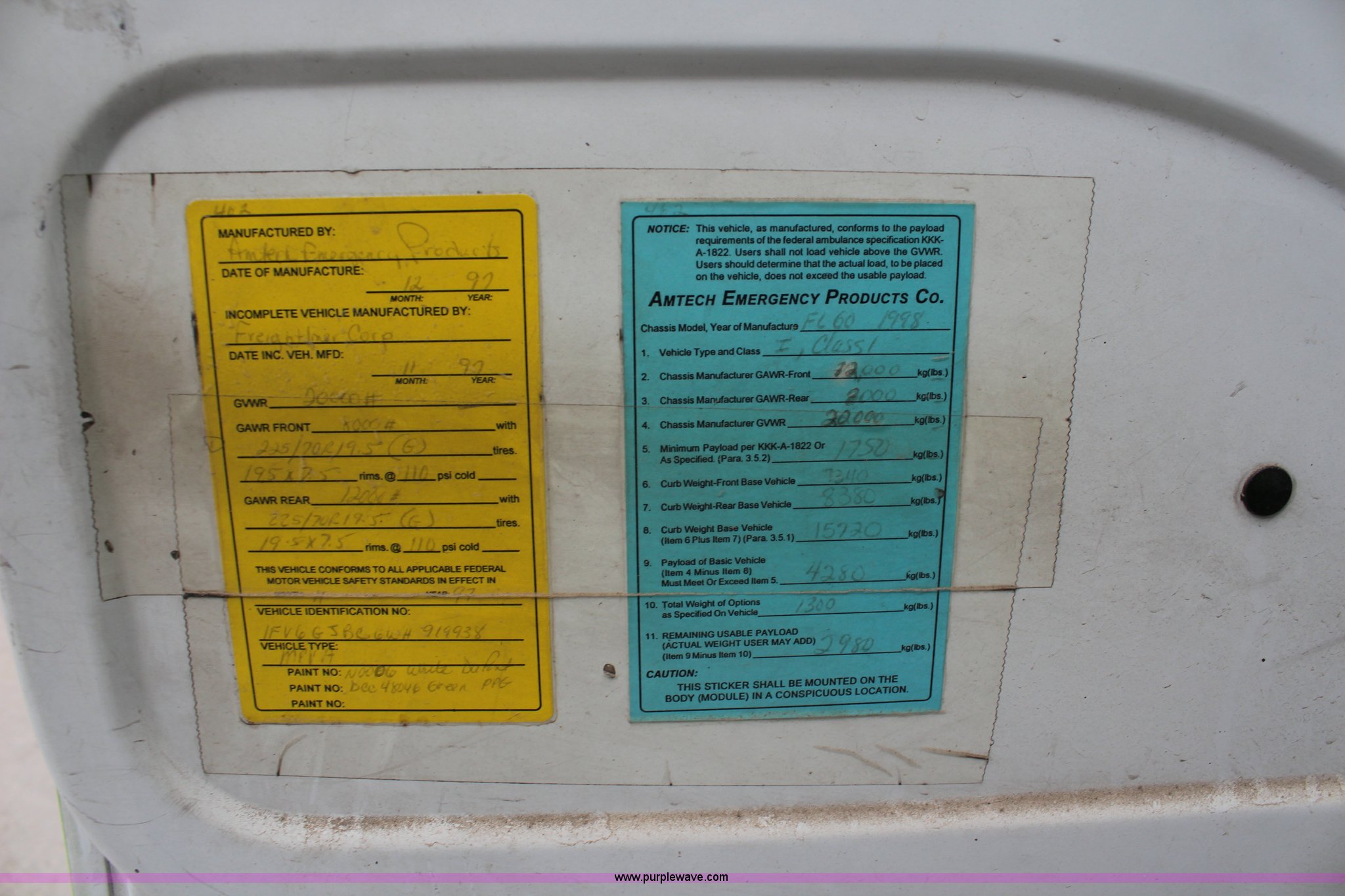 1998 Freightliner FL60 ambulance. 190,863 miles on odometer, 14,565 hours on meter, Caterpillar 3126 7.2L L6 diesel engine 250 HP, Allison automatic transmission, AC and heat, Tilt, Cruise, AM/FM, Manual windows and locks, Air suspension seat, Vinyl interior, Backup camera, 14'L ambulance body, Dump valve, Air brakes, Aluminum wheels, 265/70R19.5 tires. Title distribution may be delayed up to 14 days from verification of funds. 1FV6GJBC6WH919938. Douglas County Public Works. 711 E 23rd St. Lawrence, KS 66046