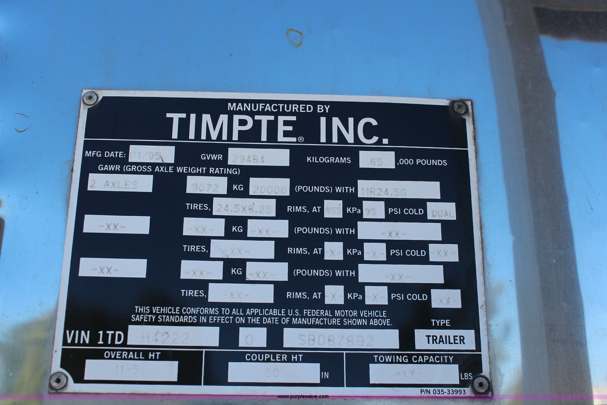 Purple Wave is selling a used Grain or Commodity Trailer in Missouri. This item is a 1995 Timpte double hopper grain trailer with the following: 42'L x 96"W, 72"H sides, Tarp, Air suspension, Air brakes, Aluminum wheels, 11R24.5 tires, GVWR 65,000 lbs, GAWR 20,000 lbs, Cracked welds on nose of trailer