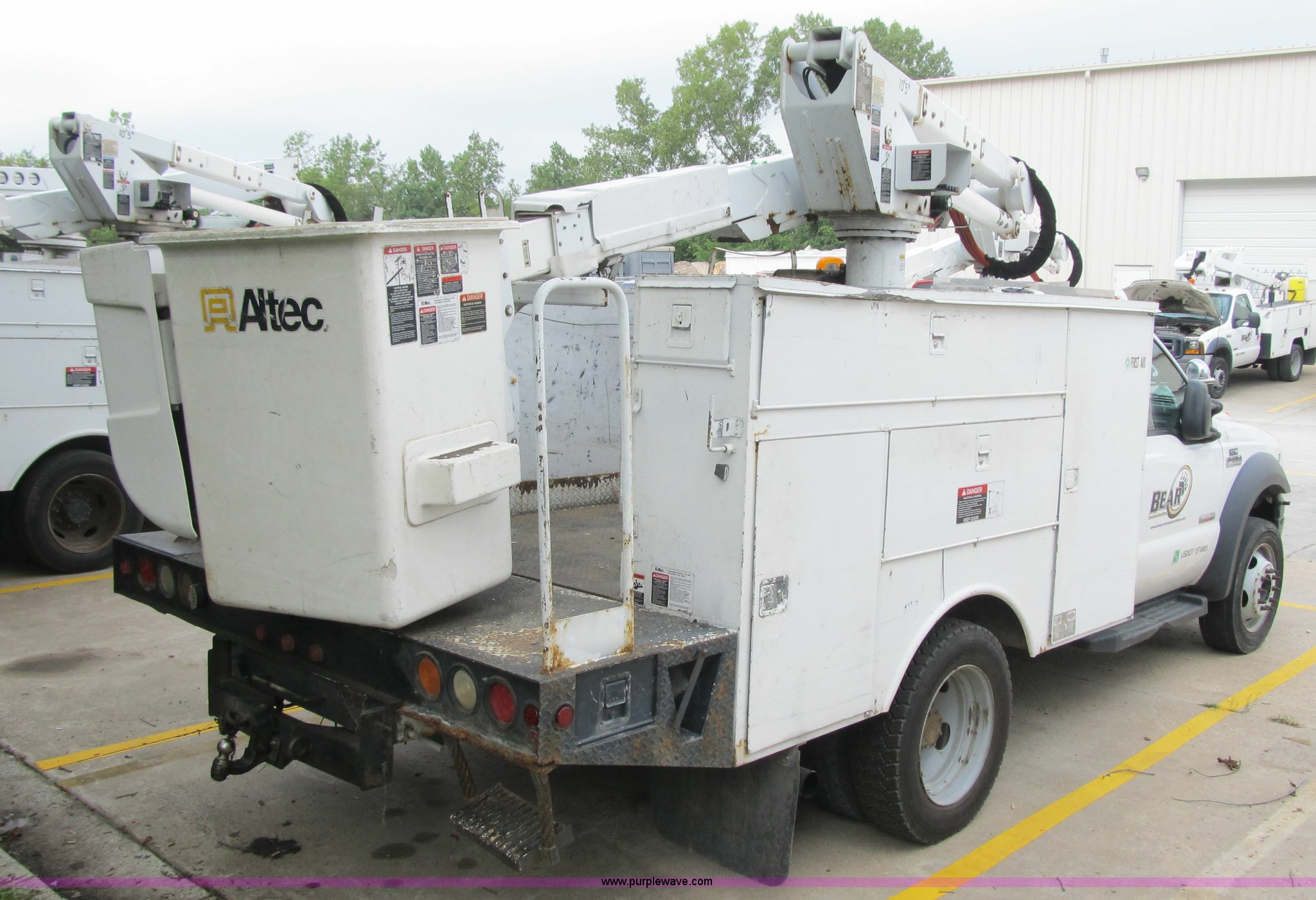Purple Wave is selling a used Bucket Truck in Missouri. This item is a 2006 Ford F550 Super Duty XL bucket truck with the following: 139,473 actual miles, 6.0L V8 diesel engine, Automatic transmission, AC and heat, Manual windows and locks, Leather interior, Running boards, Altec utility bed, (8) compartments, 10'5" stowed height, Altec boom lift, Model AT37G, 350 lbs lift capacity, 37.5' lift height, Insulated, Non-operational, (2) interior spotlights, Pintle hitch, Trailer wiring, 225/70R19.5 tires, Transmission slips, Unit# 105