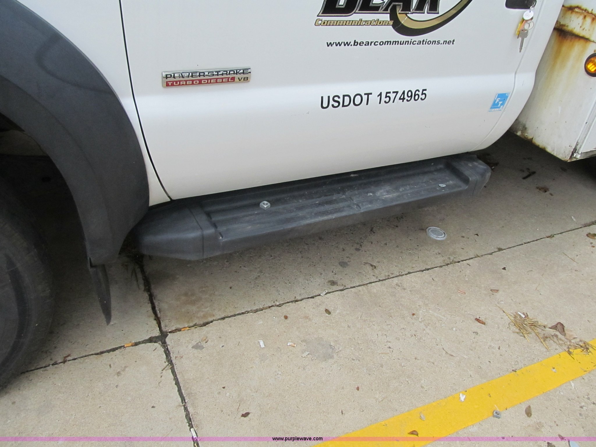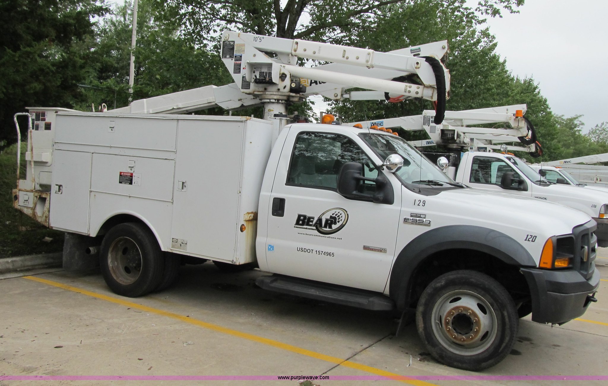 2006 Ford F550 Super Duty XL bucket truck. 111,775 actual miles, 6.0L V8 diesel engine, Automatic transmission, AC and heat, AM/FM, Manual windows and locks, Leather interior, Electric brake controller, Running boards, (2) interior spotlights, Altec service bed (8) compartments, Serial 5576555, Altec boom lift Model AT37G, 350 lbs lift capacity, 37.5' lift height, Upper and lower controls, Insulated, Serial 0406DE6959, Pintle hitch, 225/70R19.5 tires, Hydraulic leak under boom, Unit# 120. 1FDAF56P76ED35641. Bear Communications. 12712 2nd St. Grandview, MO 64030