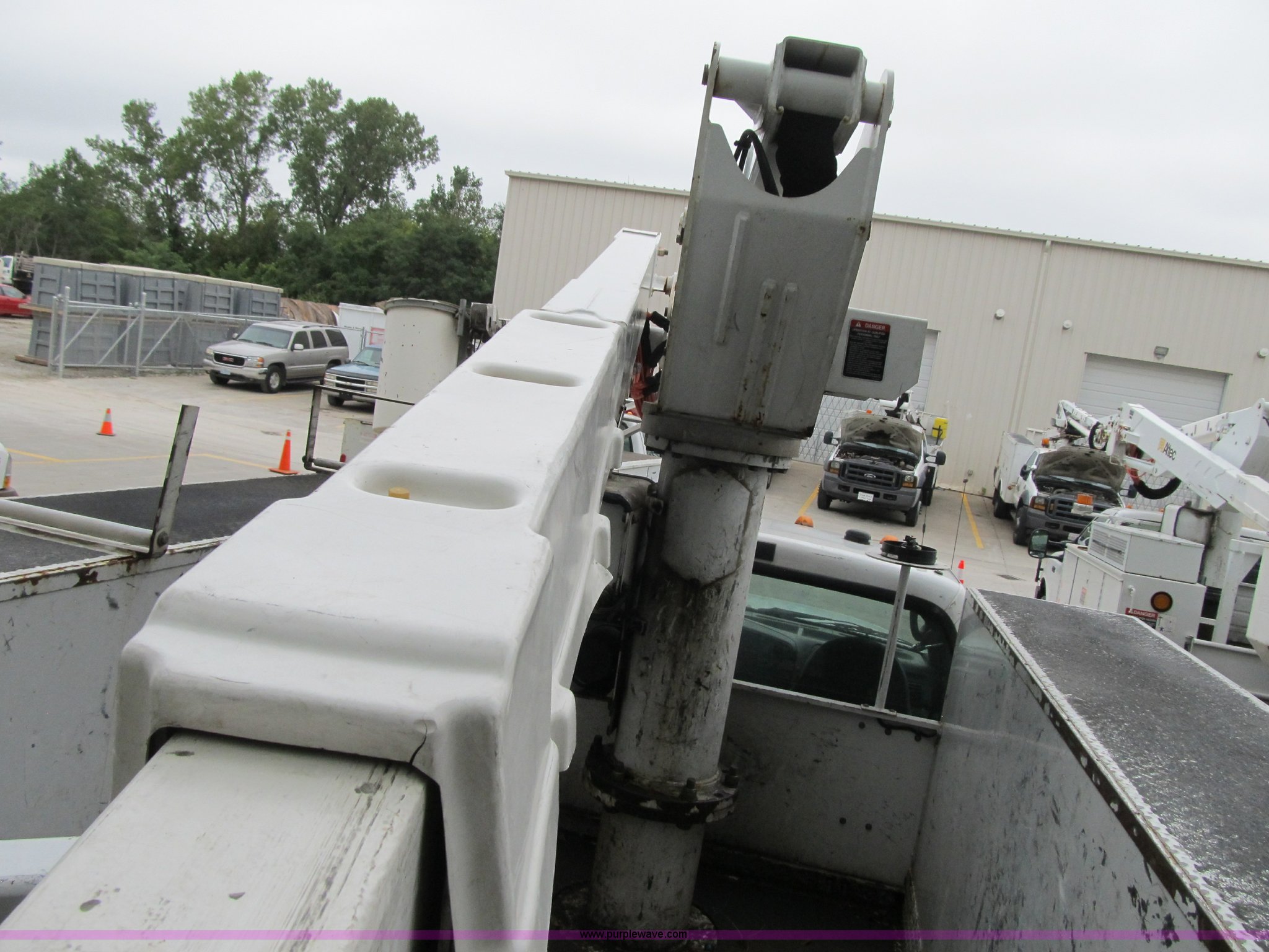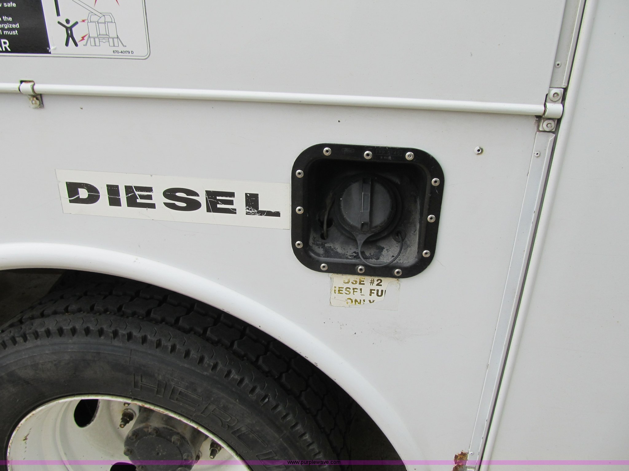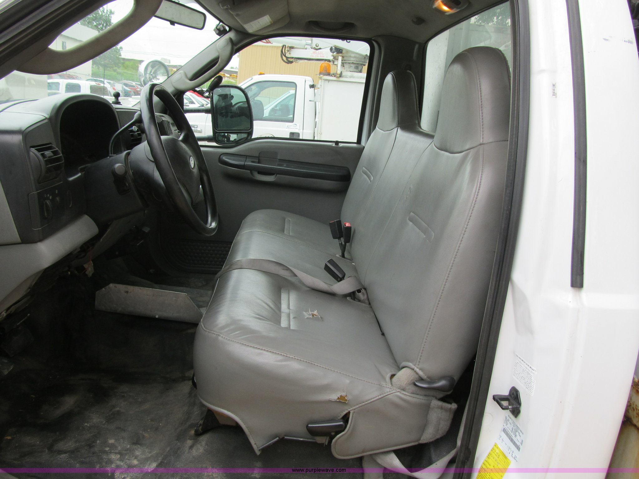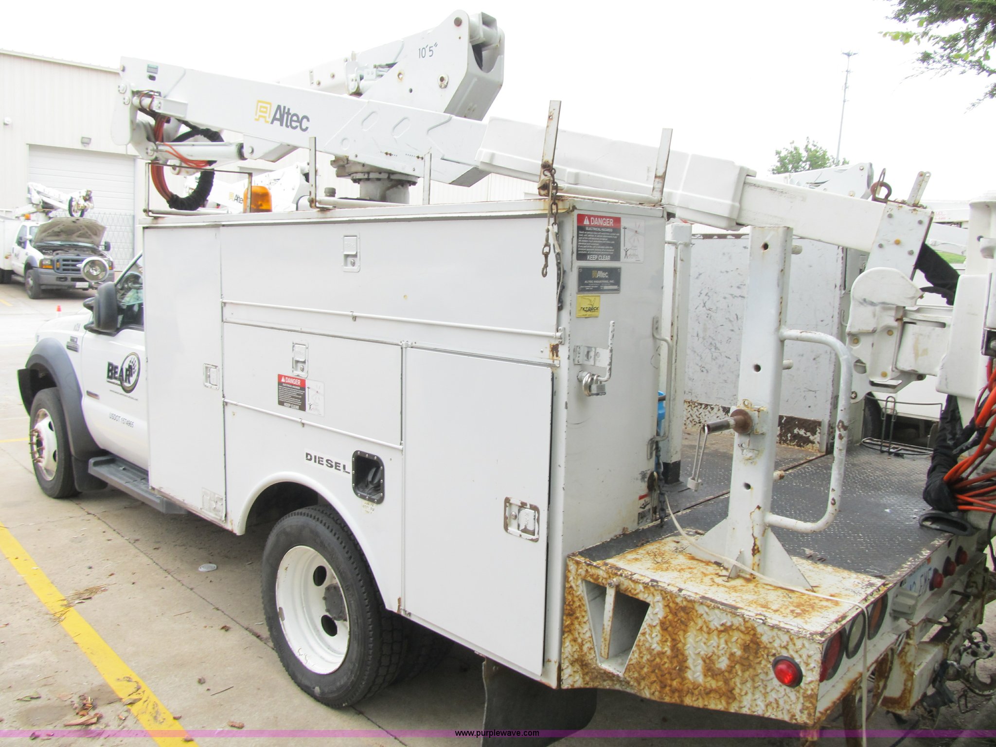 Purple Wave is selling a used Bucket Truck in Missouri. This item is a 2006 Ford F550 Super Duty XL bucket truck with the following: 111,775 actual miles, 6.0L V8 diesel engine, Automatic transmission, AC and heat, AM/FM, Manual windows and locks, Leather interior, Electric brake controller, Running boards, (2) interior spotlights, Altec service bed, (8) compartments, Serial 5576555, Altec boom lift, Model AT37G, 350 lbs lift capacity, 37.5' lift height, Upper and lower controls, Insulated, Serial 0406DE6959, Pintle hitch, 225/70R19.5 tires, Hydraulic leak under boom, Unit# 120