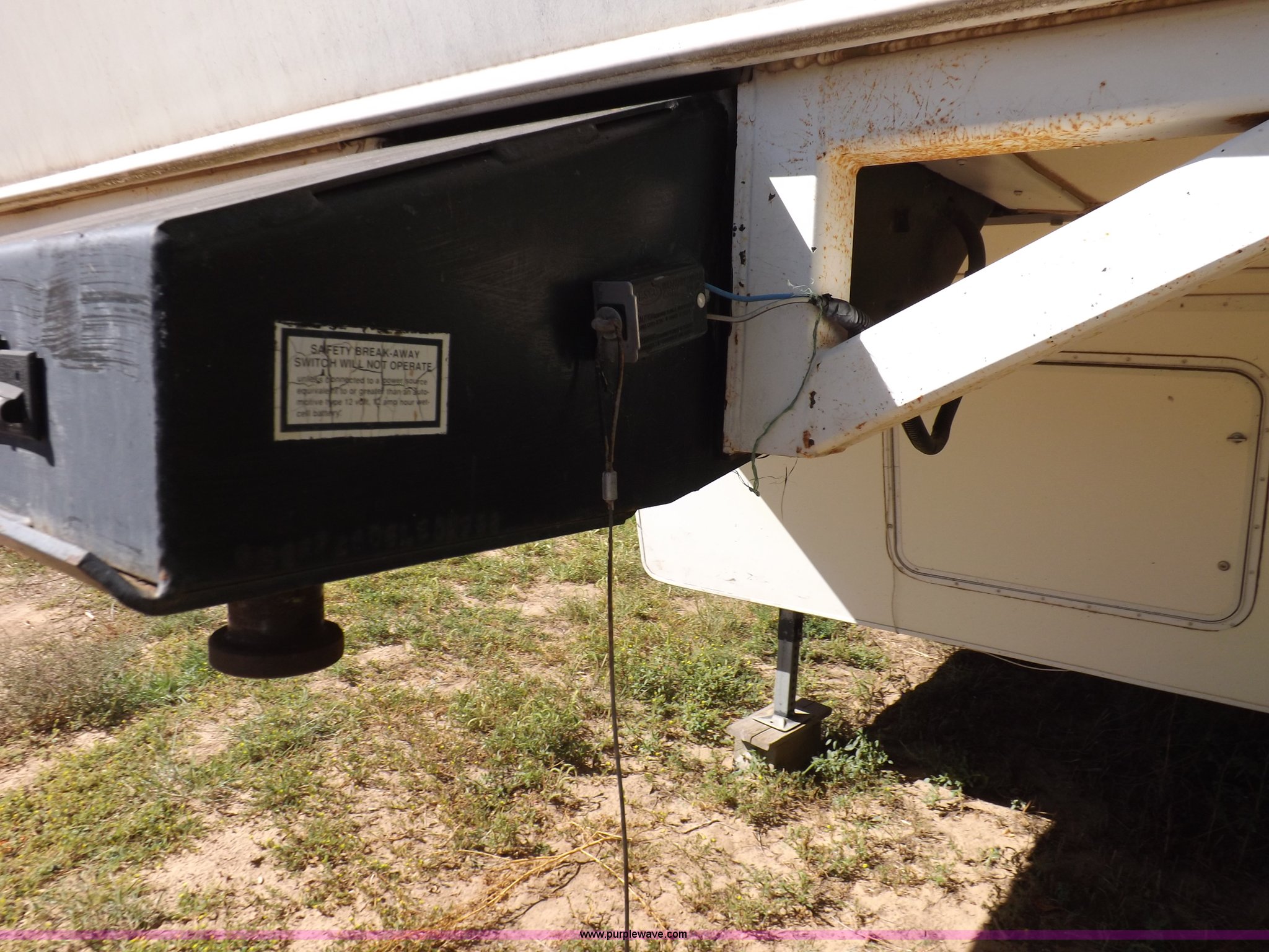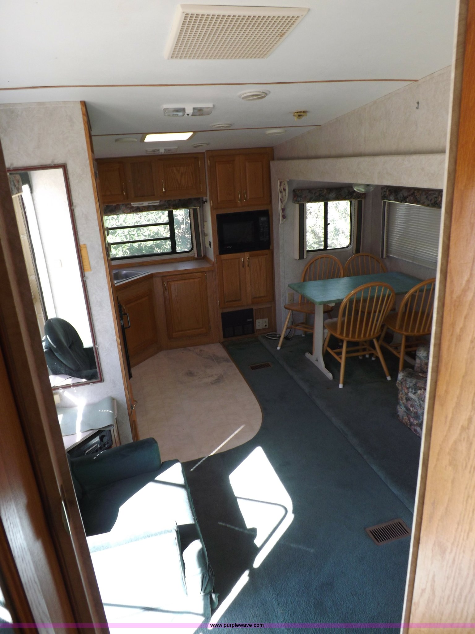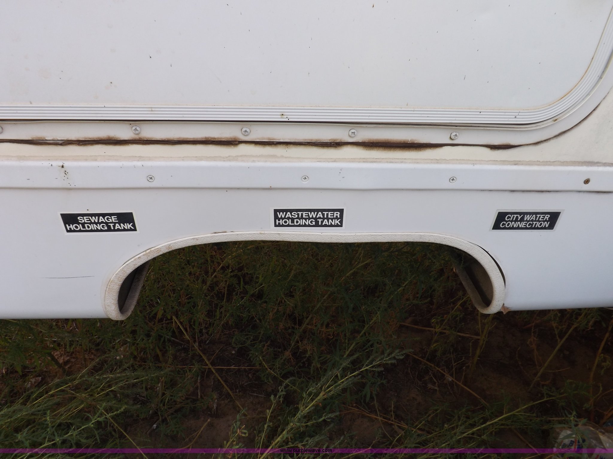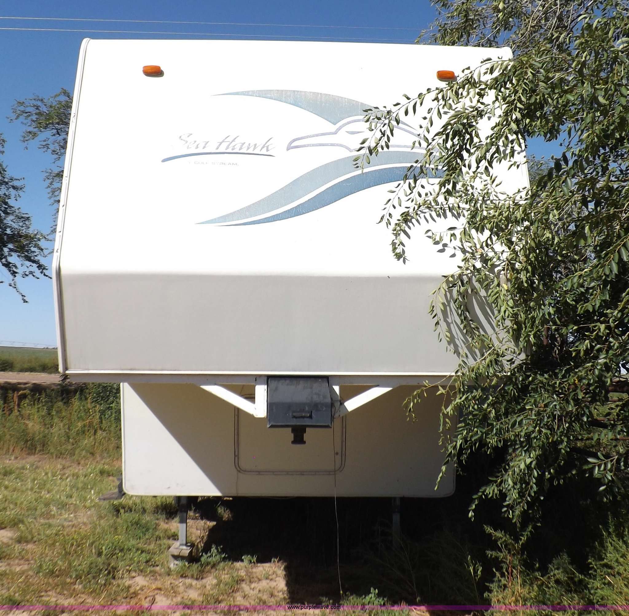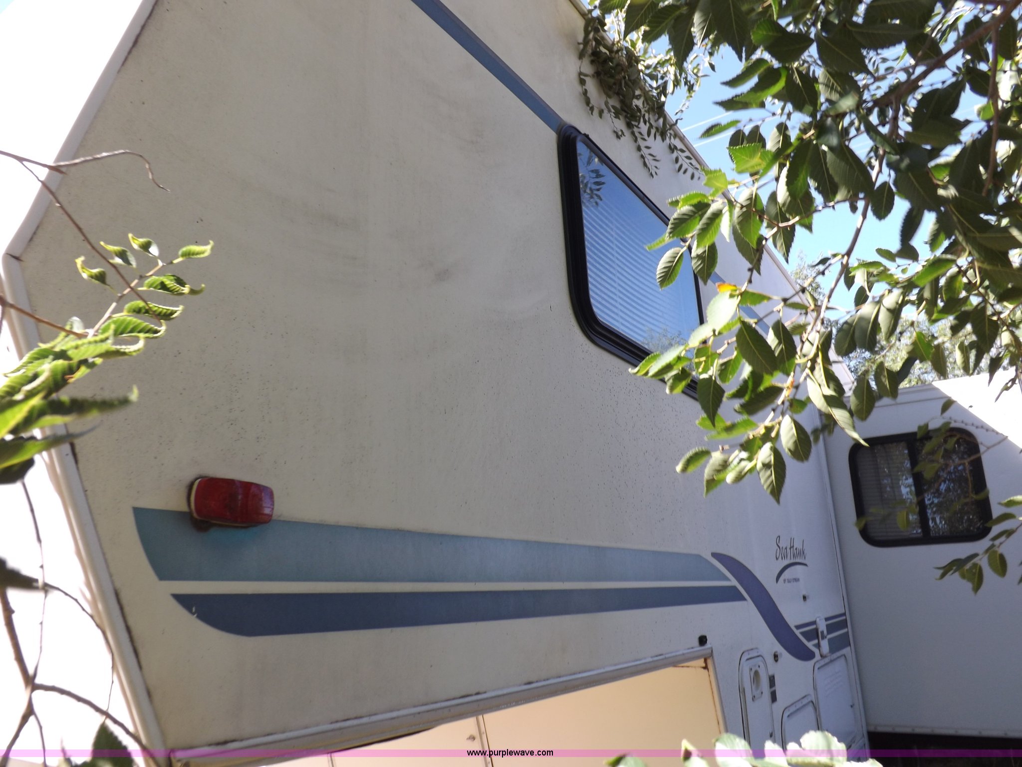 Purple Wave is selling a used RV in Kansas. This item is a 1996 Seahawk Gulfstream travel trailer with the following: 28'L x 8'W x 10.5'H, AC and heat, 12' battery operated slide-out, Refrigerator/freezer, Oven/cook top, Vented, Microwave, Two bowl kitchen sink, Double bed bedroom, Lavatory, Shower, Commode, AC/DC lighting, Audiovox AM/FM/cassette, 15' awning, (2) rooftop vents, Rooftop access ladder, Front and rear stabilizer jacks, Electric front, Wineguard crank up television antenna, (2) 30 lb LP bottles, 30 amp 110V service, Break-away brake system, Recently replaced 225/75R15 tires, 5,900 lbs empty weight, Roof leaks in kitchen and bathroom ceilings, Cabinet and floor damage, Carpet stained