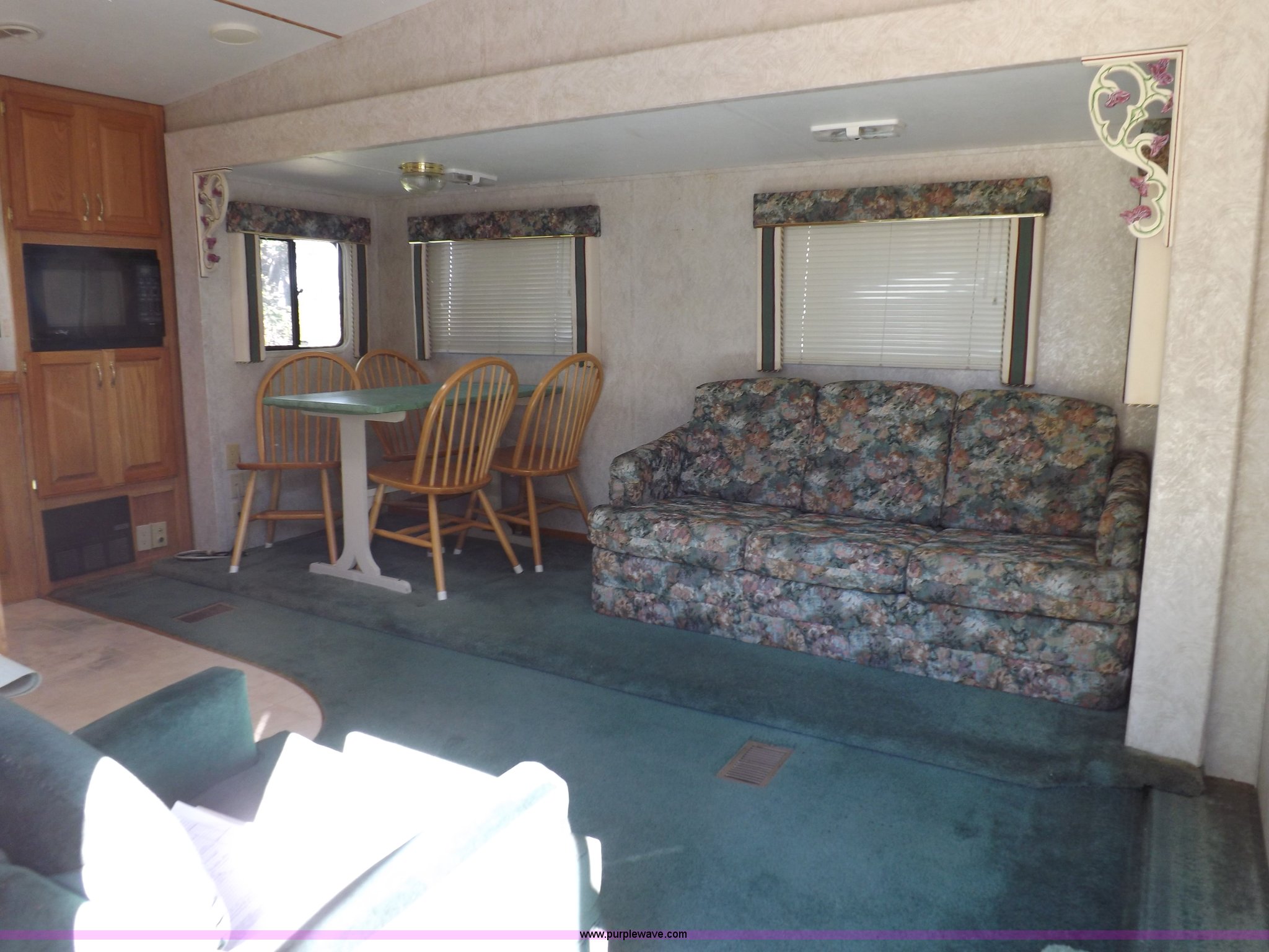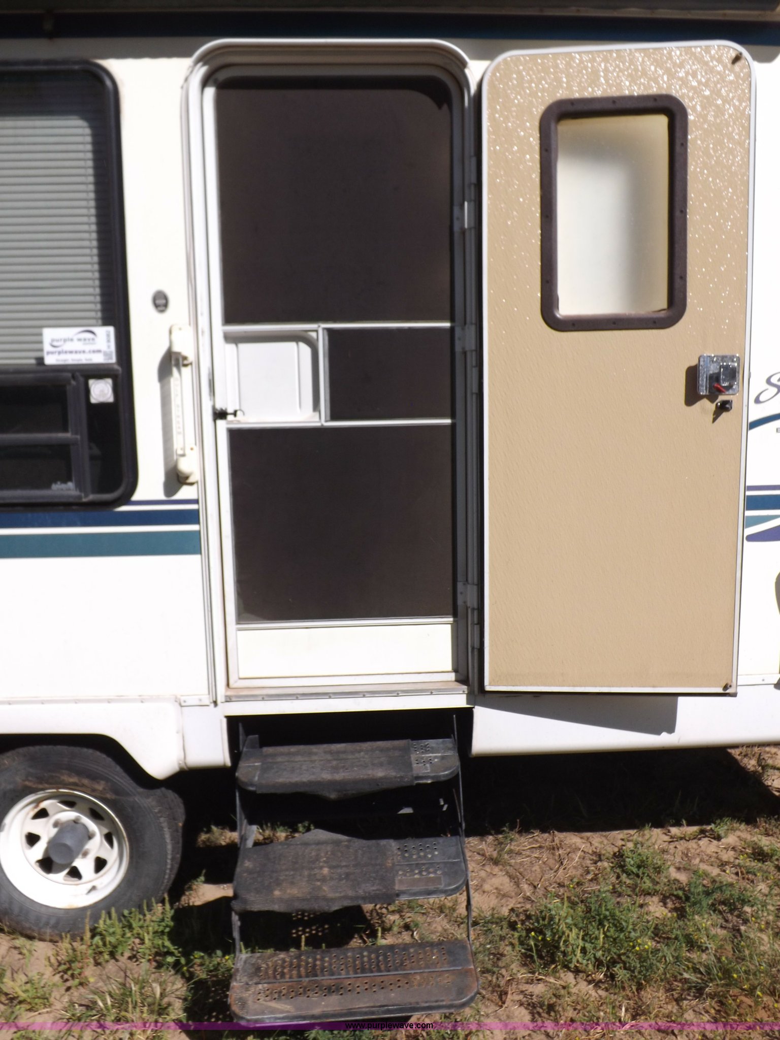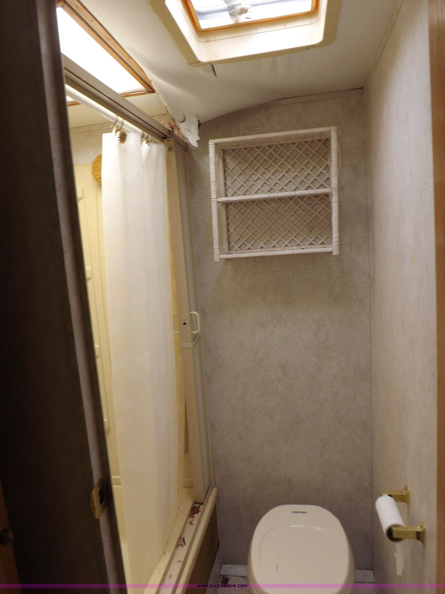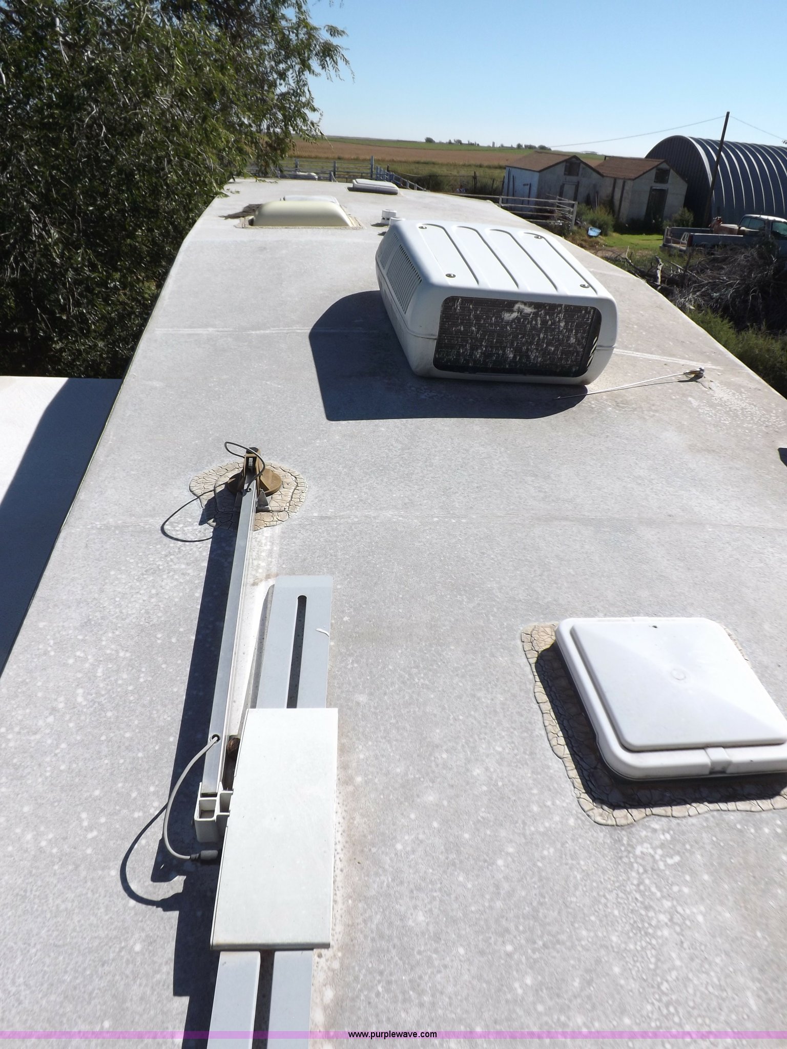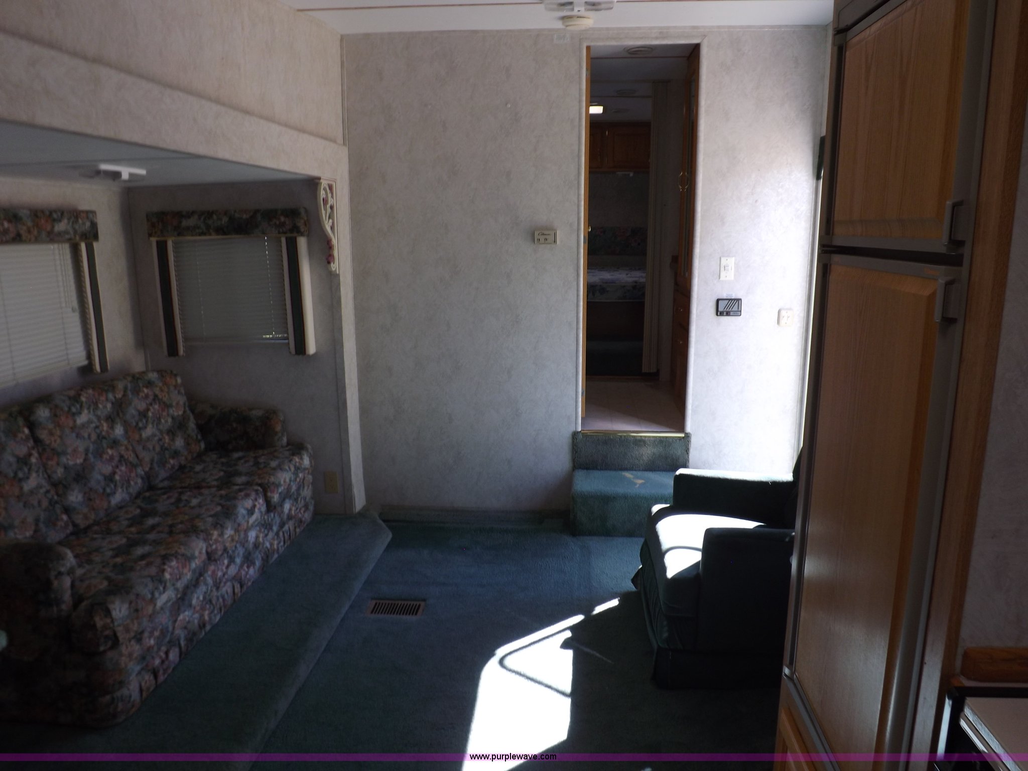 Purple Wave is selling a used RV in Kansas. This item is a 1996 Seahawk Gulfstream travel trailer with the following: 28'L x 8'W x 10.5'H, AC and heat, 12' battery operated slide-out, Refrigerator/freezer, Oven/cook top, Vented, Microwave, Two bowl kitchen sink, Double bed bedroom, Lavatory, Shower, Commode, AC/DC lighting, Audiovox AM/FM/cassette, 15' awning, (2) rooftop vents, Rooftop access ladder, Front and rear stabilizer jacks, Electric front, Wineguard crank up television antenna, (2) 30 lb LP bottles, 30 amp 110V service, Break-away brake system, Recently replaced 225/75R15 tires, 5,900 lbs empty weight, Roof leaks in kitchen and bathroom ceilings, Cabinet and floor damage, Carpet stained