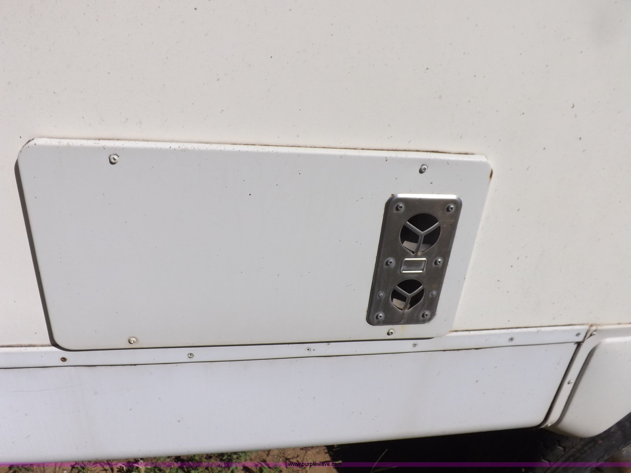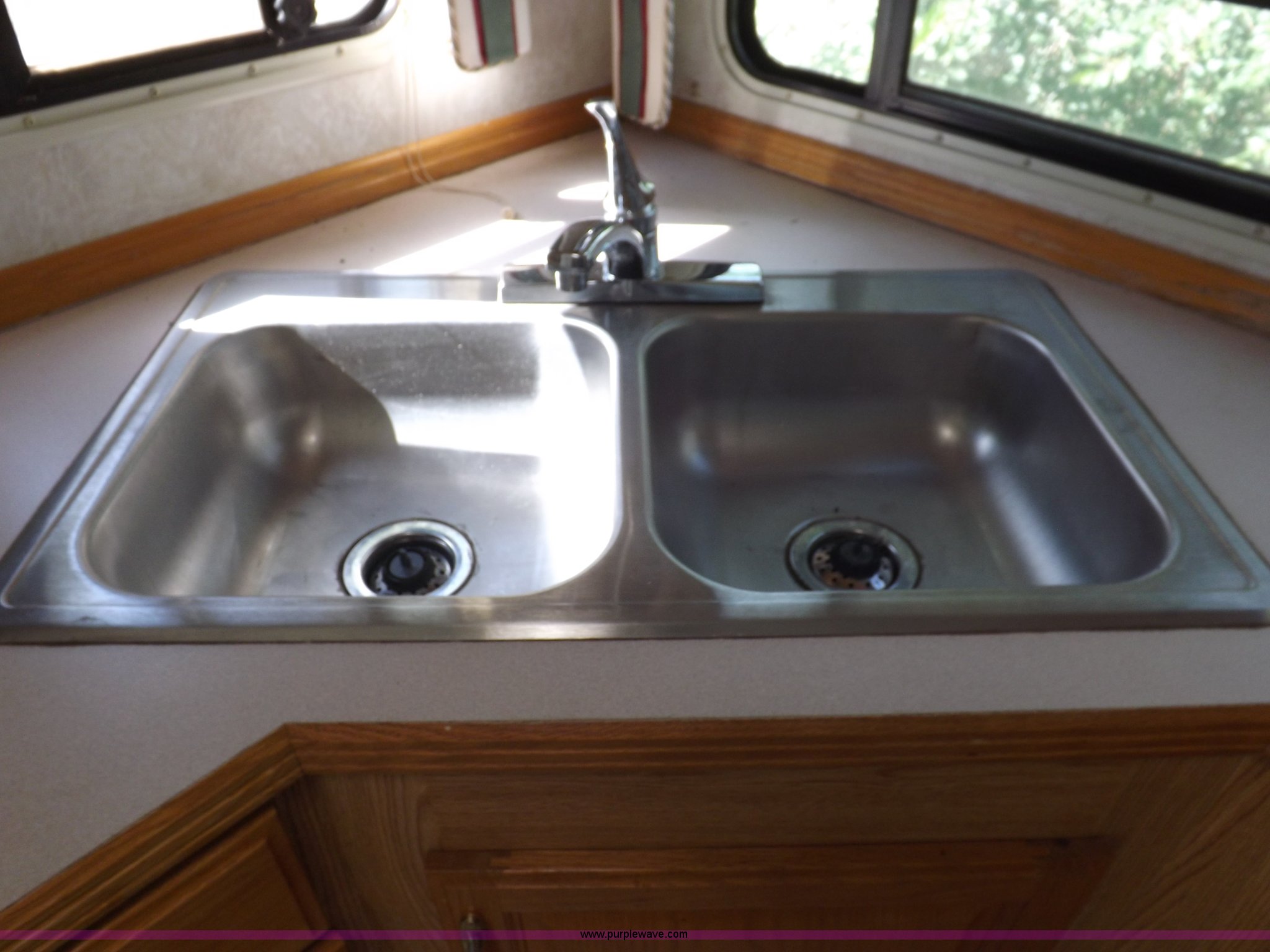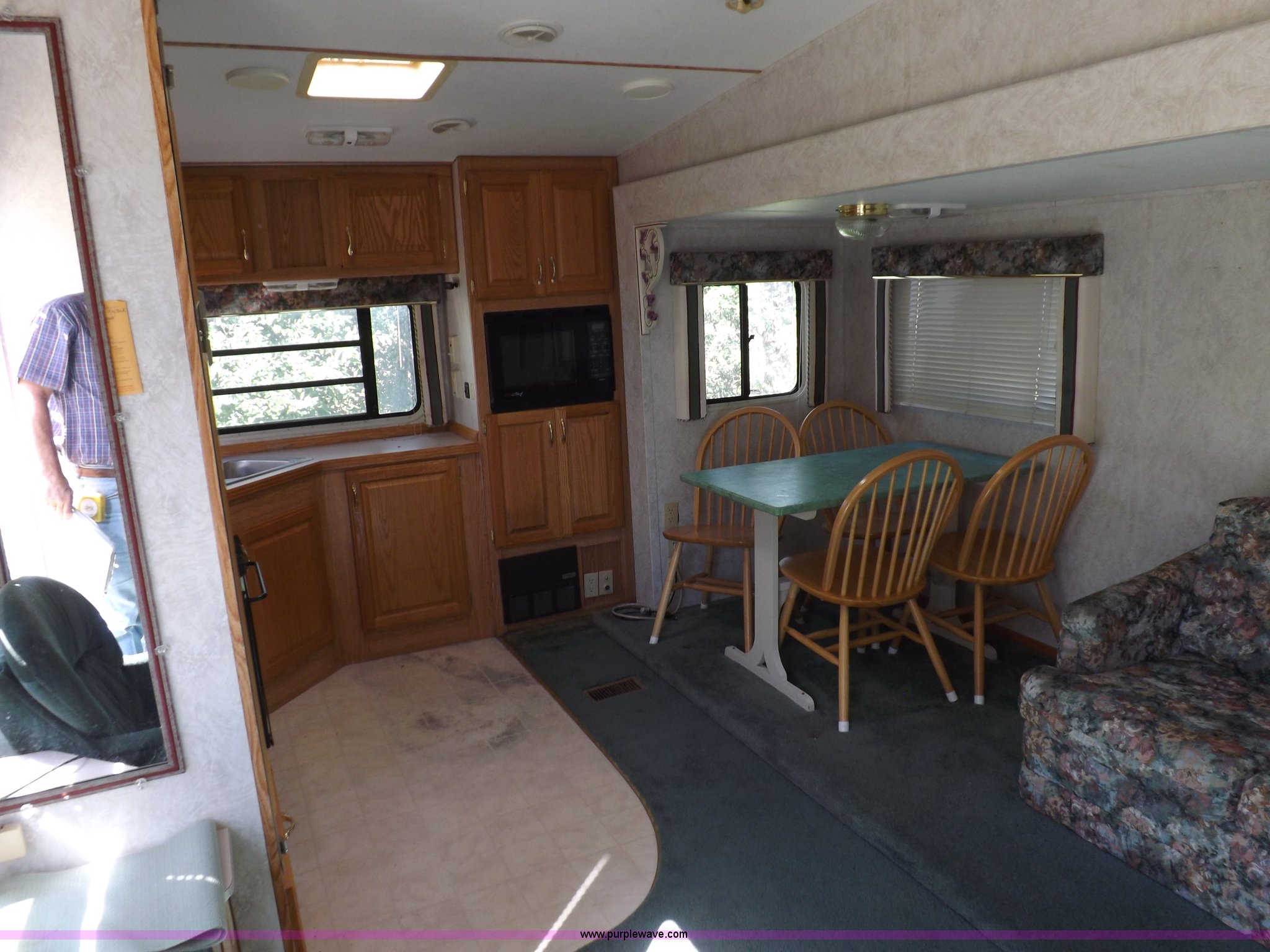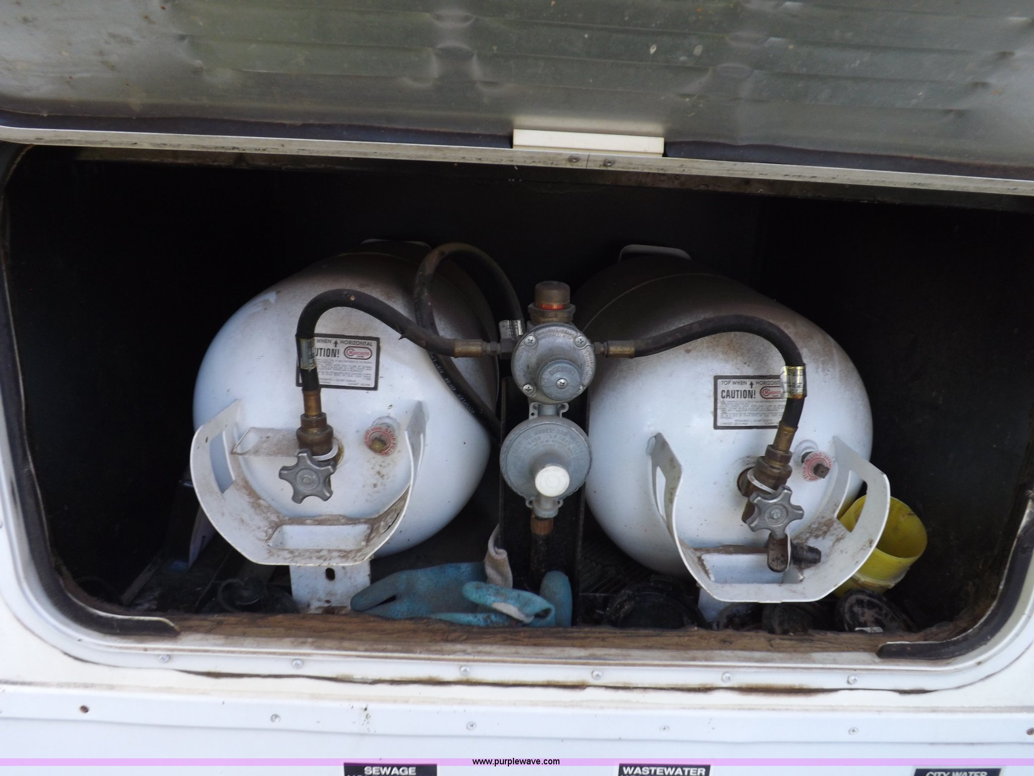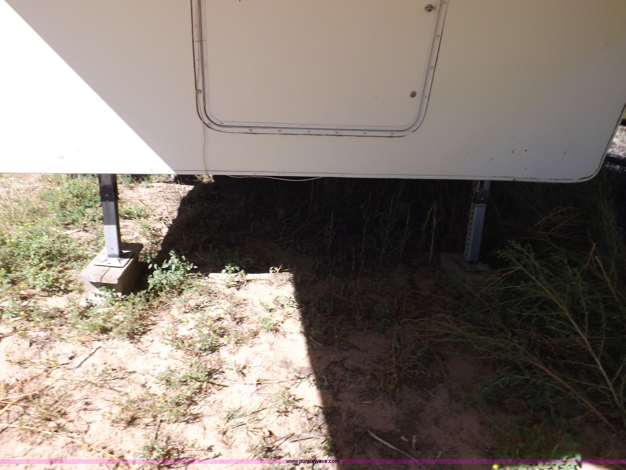 Purple Wave is selling a used RV in Kansas. This item is a 1996 Seahawk Gulfstream travel trailer with the following: 28'L x 8'W x 10.5'H, AC and heat, 12' battery operated slide-out, Refrigerator/freezer, Oven/cook top, Vented, Microwave, Two bowl kitchen sink, Double bed bedroom, Lavatory, Shower, Commode, AC/DC lighting, Audiovox AM/FM/cassette, 15' awning, (2) rooftop vents, Rooftop access ladder, Front and rear stabilizer jacks, Electric front, Wineguard crank up television antenna, (2) 30 lb LP bottles, 30 amp 110V service, Break-away brake system, Recently replaced 225/75R15 tires, 5,900 lbs empty weight, Roof leaks in kitchen and bathroom ceilings, Cabinet and floor damage, Carpet stained