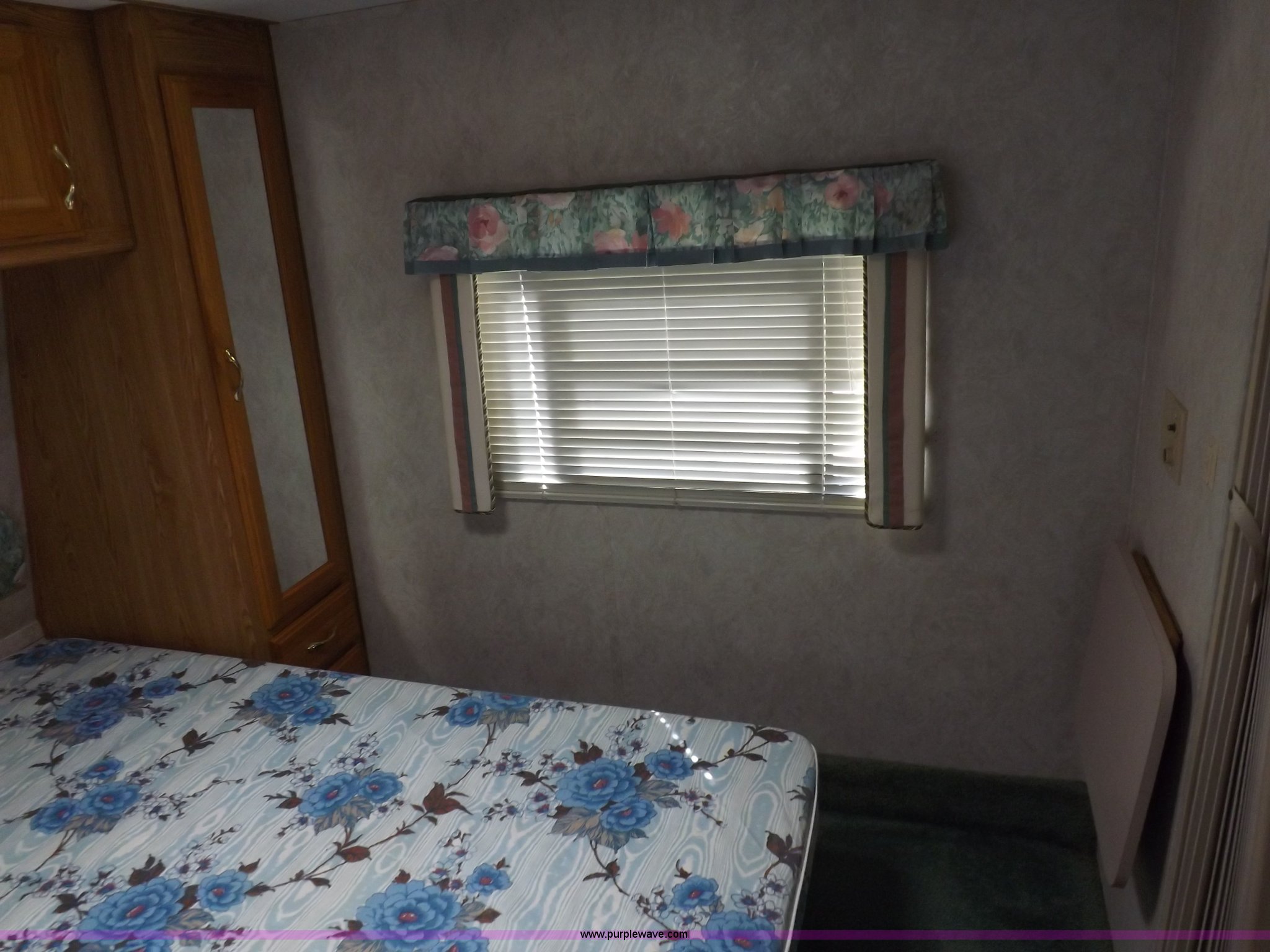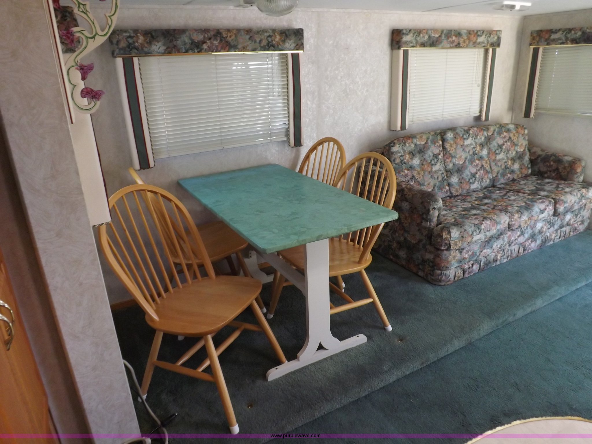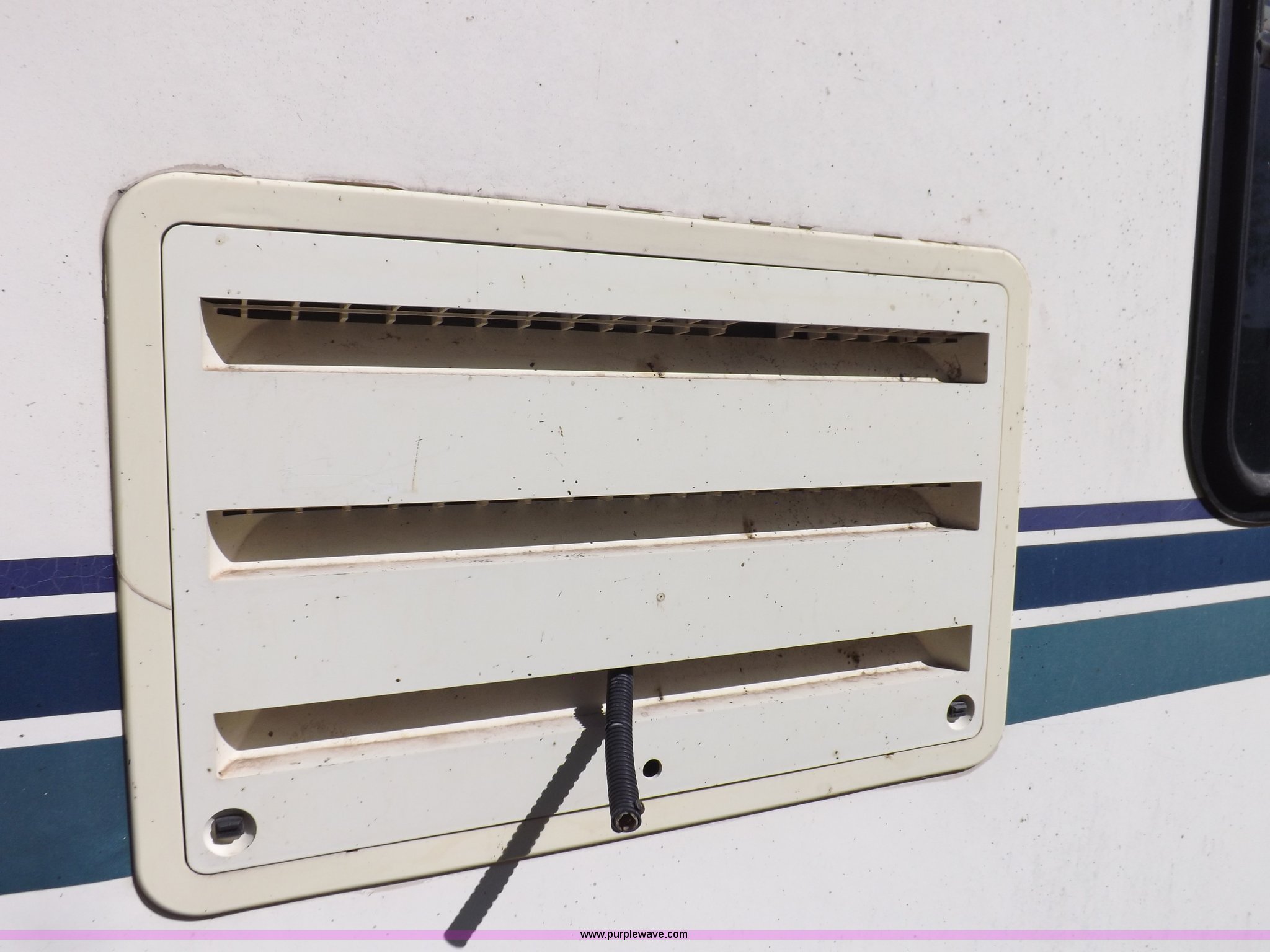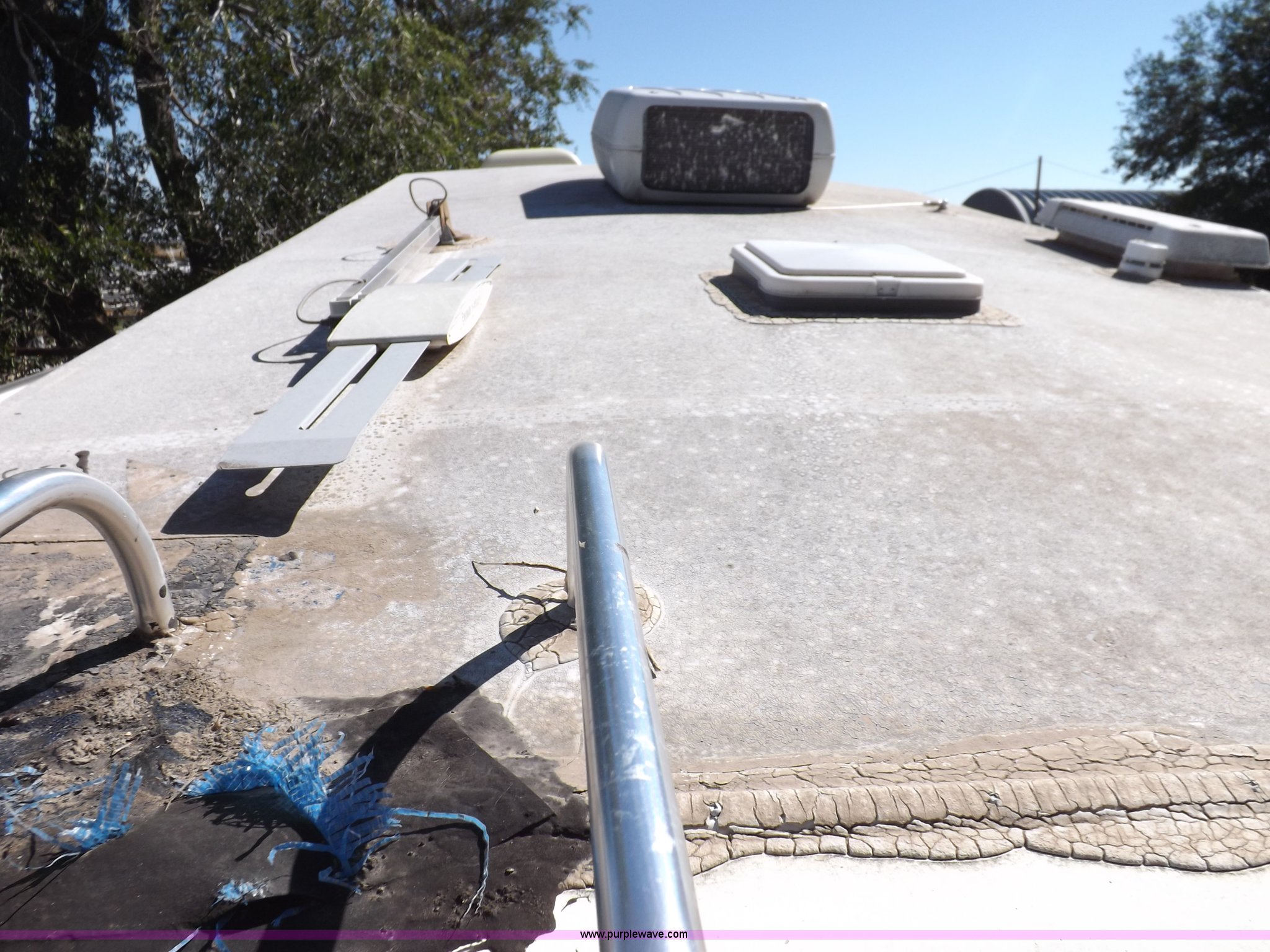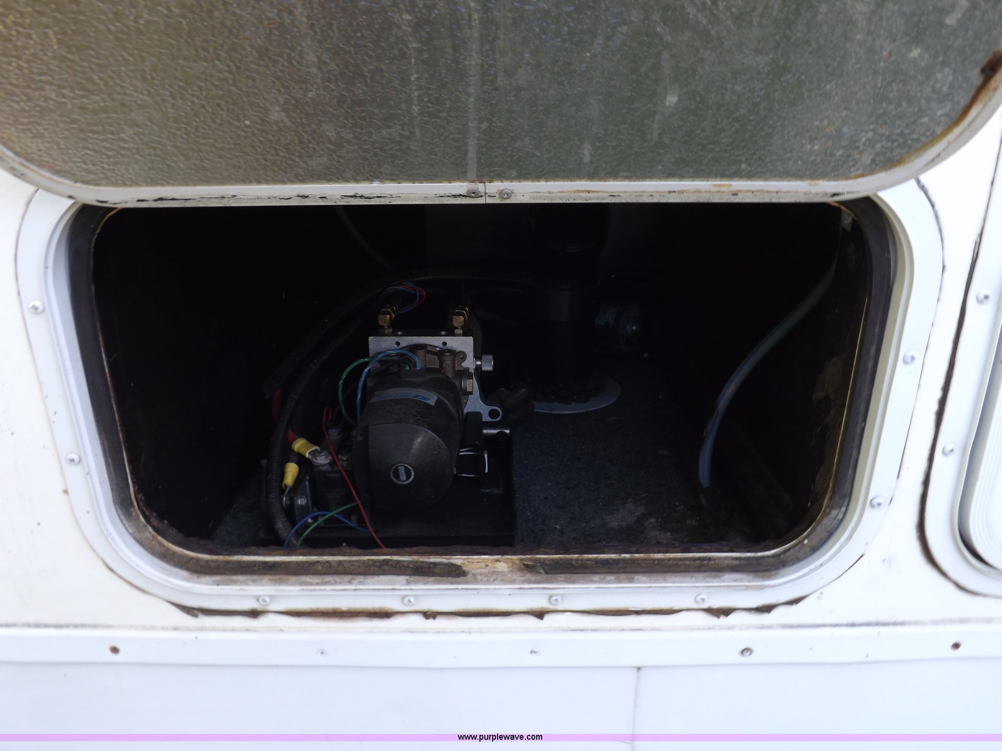 Purple Wave is selling a used RV in Kansas. This item is a 1996 Seahawk Gulfstream travel trailer with the following: 28'L x 8'W x 10.5'H, AC and heat, 12' battery operated slide-out, Refrigerator/freezer, Oven/cook top, Vented, Microwave, Two bowl kitchen sink, Double bed bedroom, Lavatory, Shower, Commode, AC/DC lighting, Audiovox AM/FM/cassette, 15' awning, (2) rooftop vents, Rooftop access ladder, Front and rear stabilizer jacks, Electric front, Wineguard crank up television antenna, (2) 30 lb LP bottles, 30 amp 110V service, Break-away brake system, Recently replaced 225/75R15 tires, 5,900 lbs empty weight, Roof leaks in kitchen and bathroom ceilings, Cabinet and floor damage, Carpet stained
