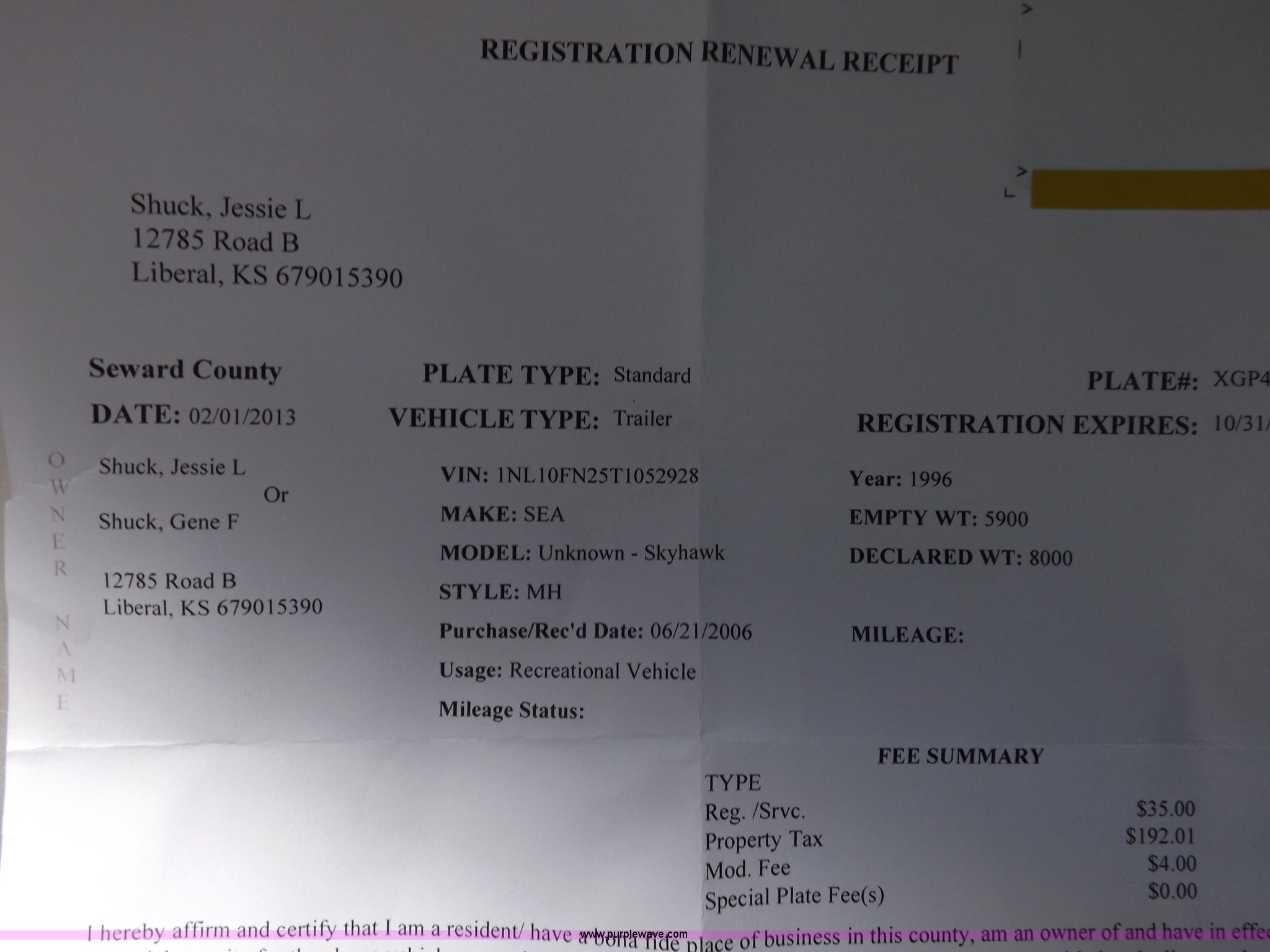 1996 Seahawk Gulfstream travel trailer. 28'L x 8'W x 10.5'H, AC and heat, 12' battery operated slide-out, Refrigerator/freezer, Oven/cook top Vented, Microwave, Two bowl kitchen sink, Double bed bedroom, Lavatory, Shower, Commode, AC/DC lighting, Audiovox AM/FM/cassette, 15' awning, (2) rooftop vents, Rooftop access ladder, Front and rear stabilizer jacks Electric front, Wineguard crank up television antenna, (2) 30 lb LP bottles, 30 amp 110V service, Break-away brake system, Recently replaced 225/75R15 tires, 5,900 lbs empty weight, Roof leaks in kitchen and bathroom ceilings, Cabinet and floor damage, Carpet stained. Title distribution may be delayed up to 14 days from verification of funds. 1NL10FN25T1052928. 12785 B Rd. Liberal, KS 67901