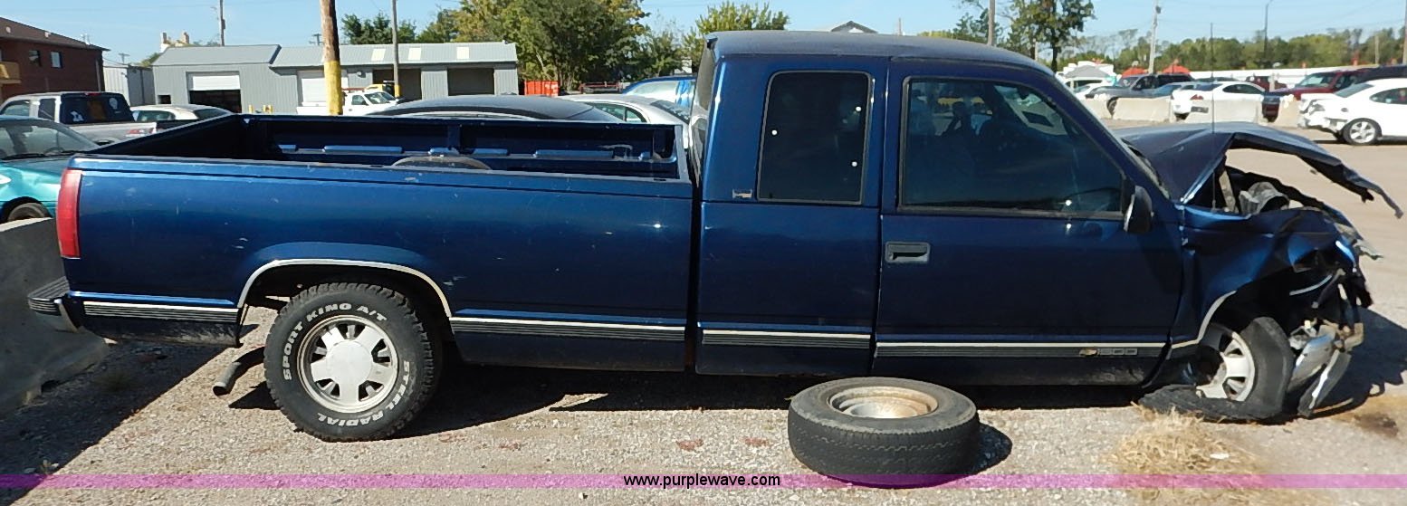 1996 Chevrolet Silverado 1500 Ext. Cab pickup truck. Unknown miles on odometer, 5.7L V8 OHV 16V gas engine, Long bed, Ball hitch, Receiver hitch, Trailer wiring, 235/75R15 tires, Interior/exterior cosmetic damage, Cracked windshield, Contents included, Major front end damage, Dents, Scratches, Doors locked, Unknown operating condition, Case# 14C56481. Vehicle is abandoned. Condition and history are unknown. No additional information is available. Vehicle does not have keys unless notated otherwise in the item listing.. View City Of Wichita Terms for title acquisition and item removal requirements.. 1GCEC19R2TE213656. Ken's Auto Tow. 3730 S Broadway St. Wichita, KS 67216