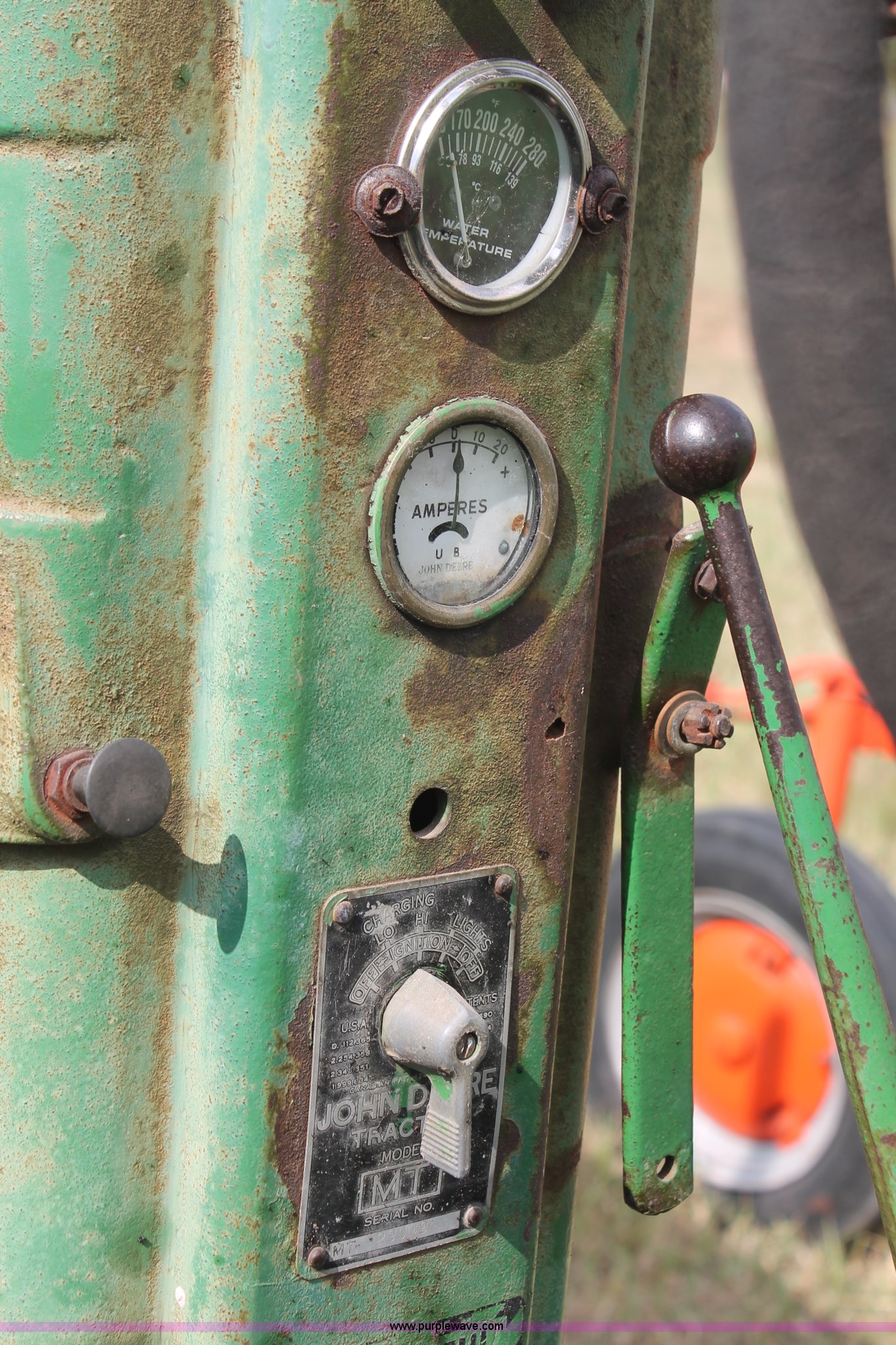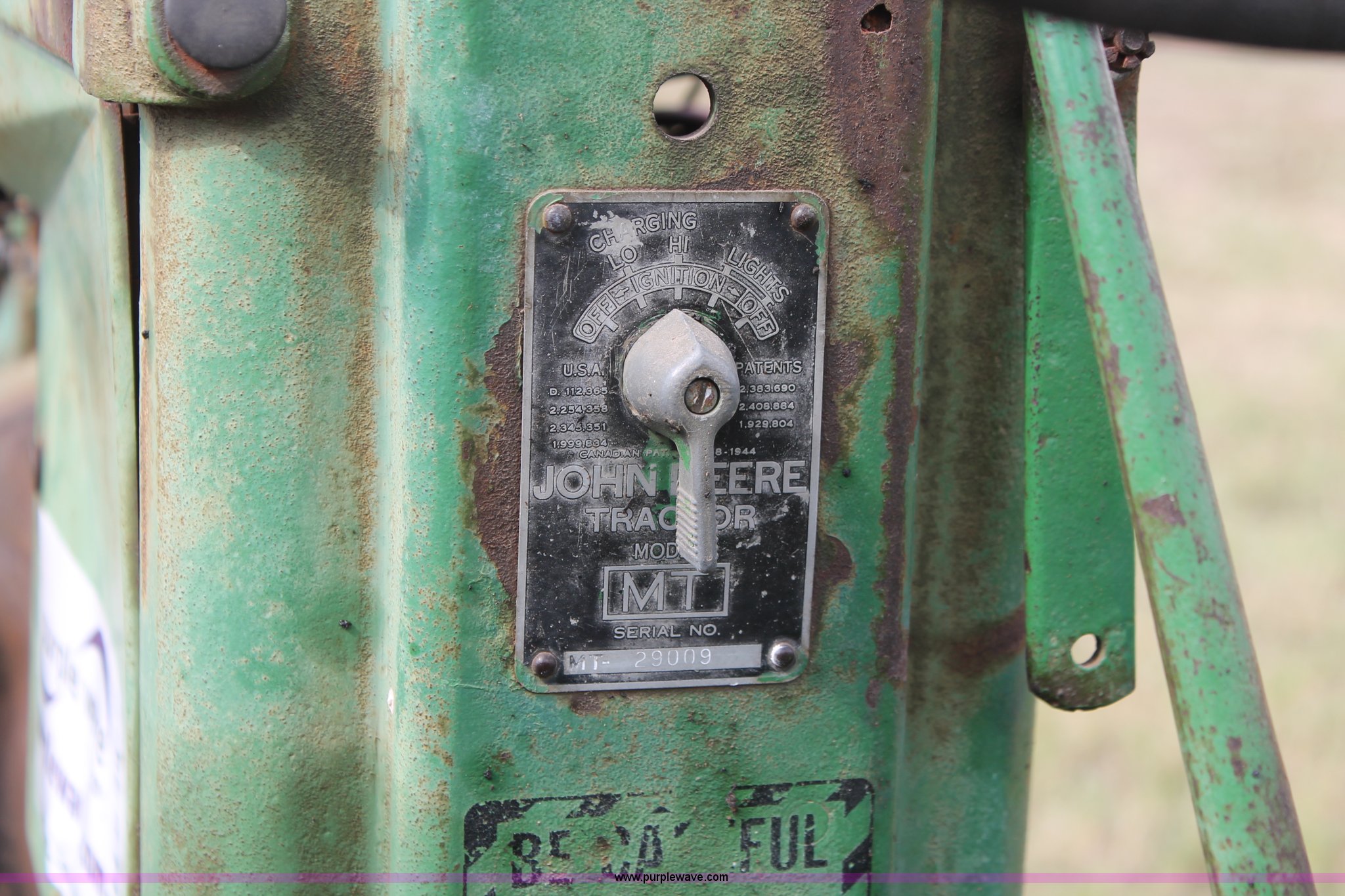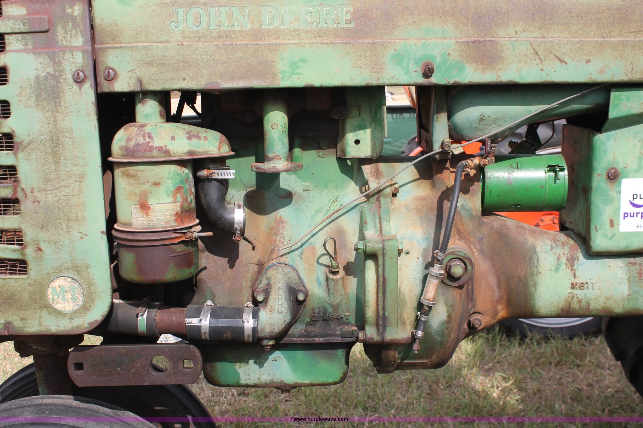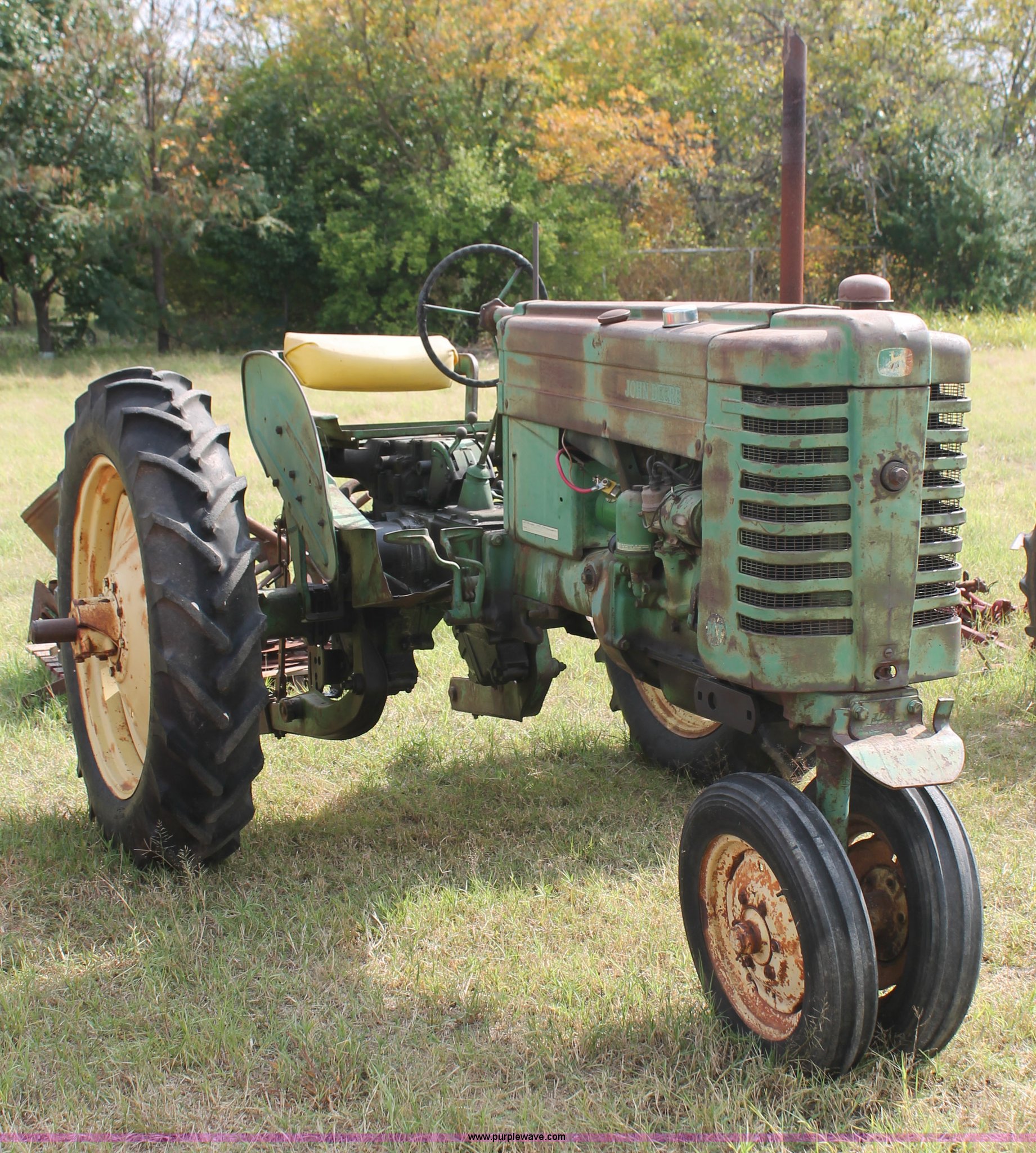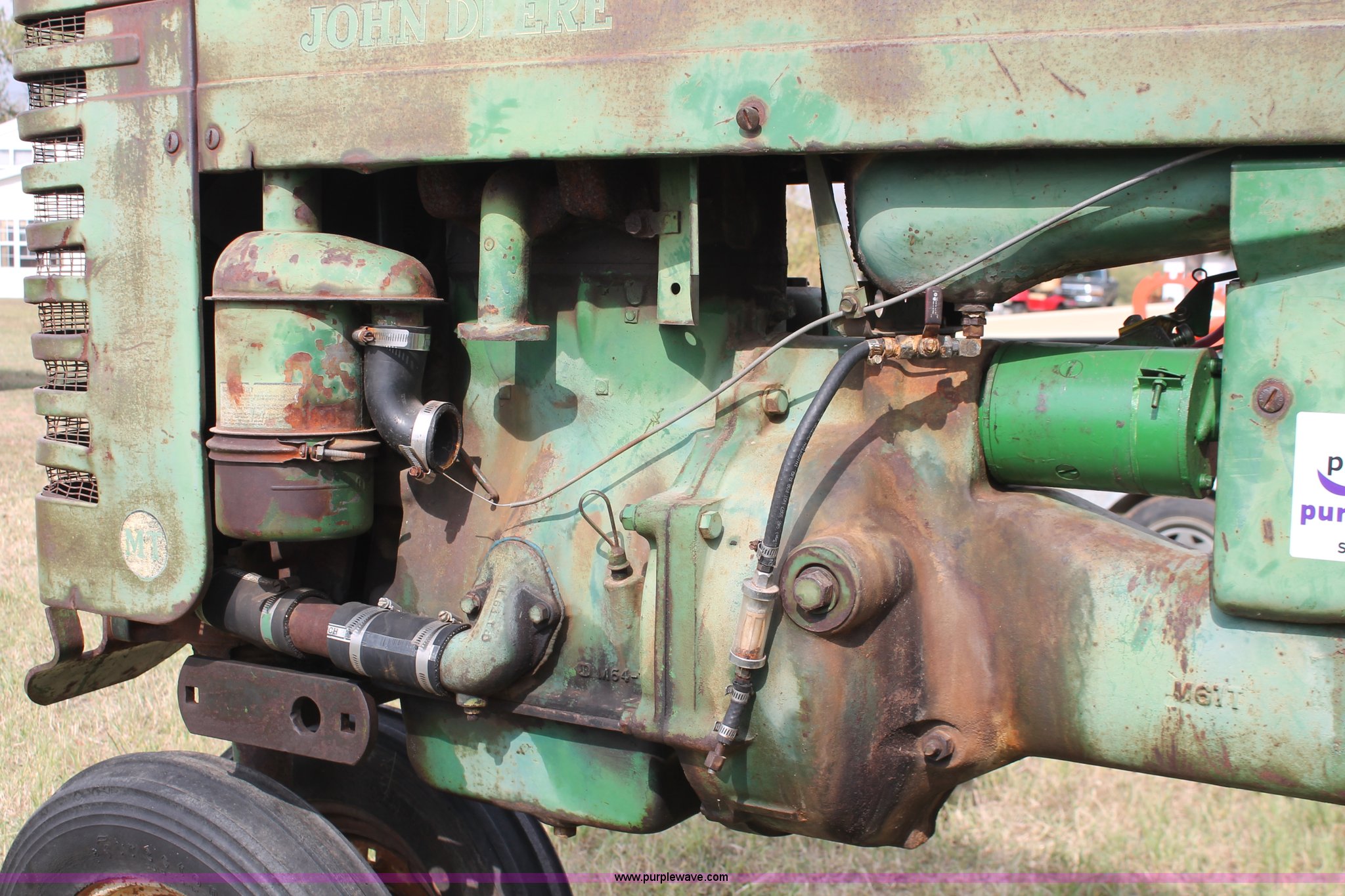 Purple Wave is selling a used Tractor in Oklahoma. This item is a 1951 John Deere MT tractor with the following: John Deere 1.6L two cylinder gas engine, Manual transmission, 8F-2R gears, Electric start, Two point, 540 PTO, Rear hydraulic remotes, Nine gallon fuel tank, 5.00-15 front tires, 11.2/10-34 rear tires, 3,183 lbs. base operating weight, Carburetor included, No battery, Serial 29009