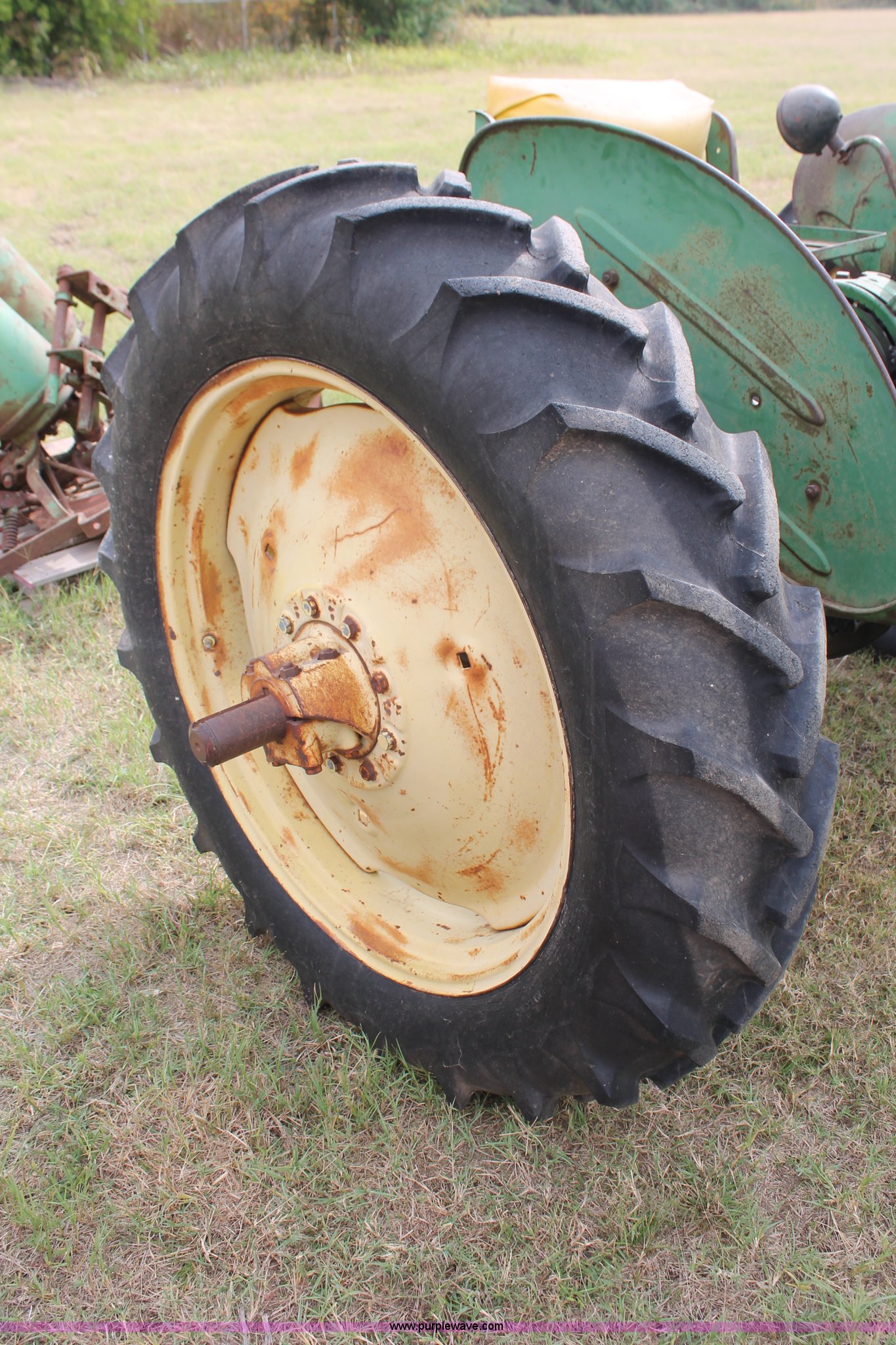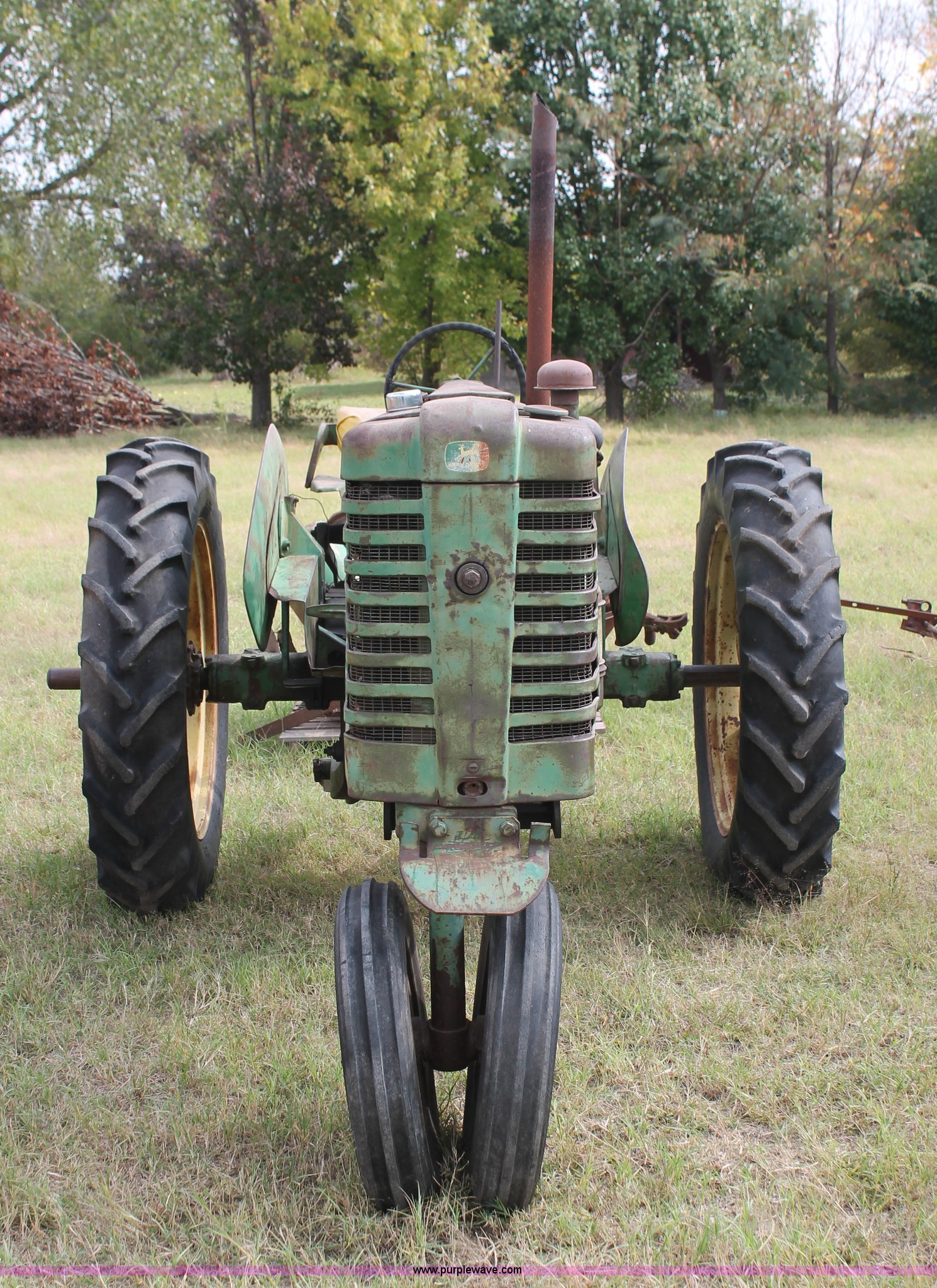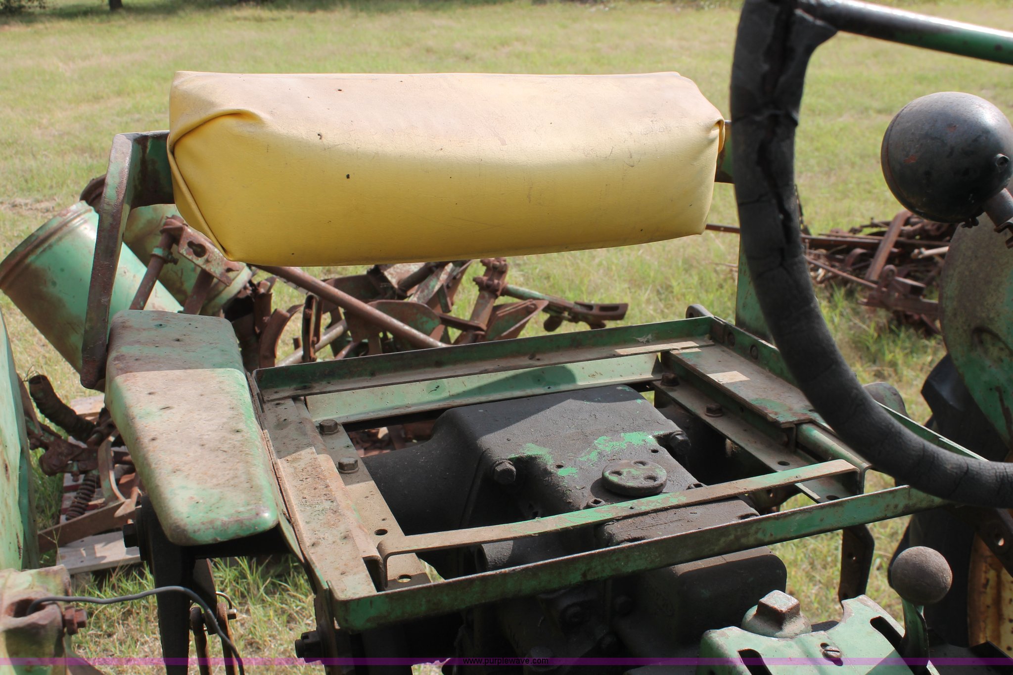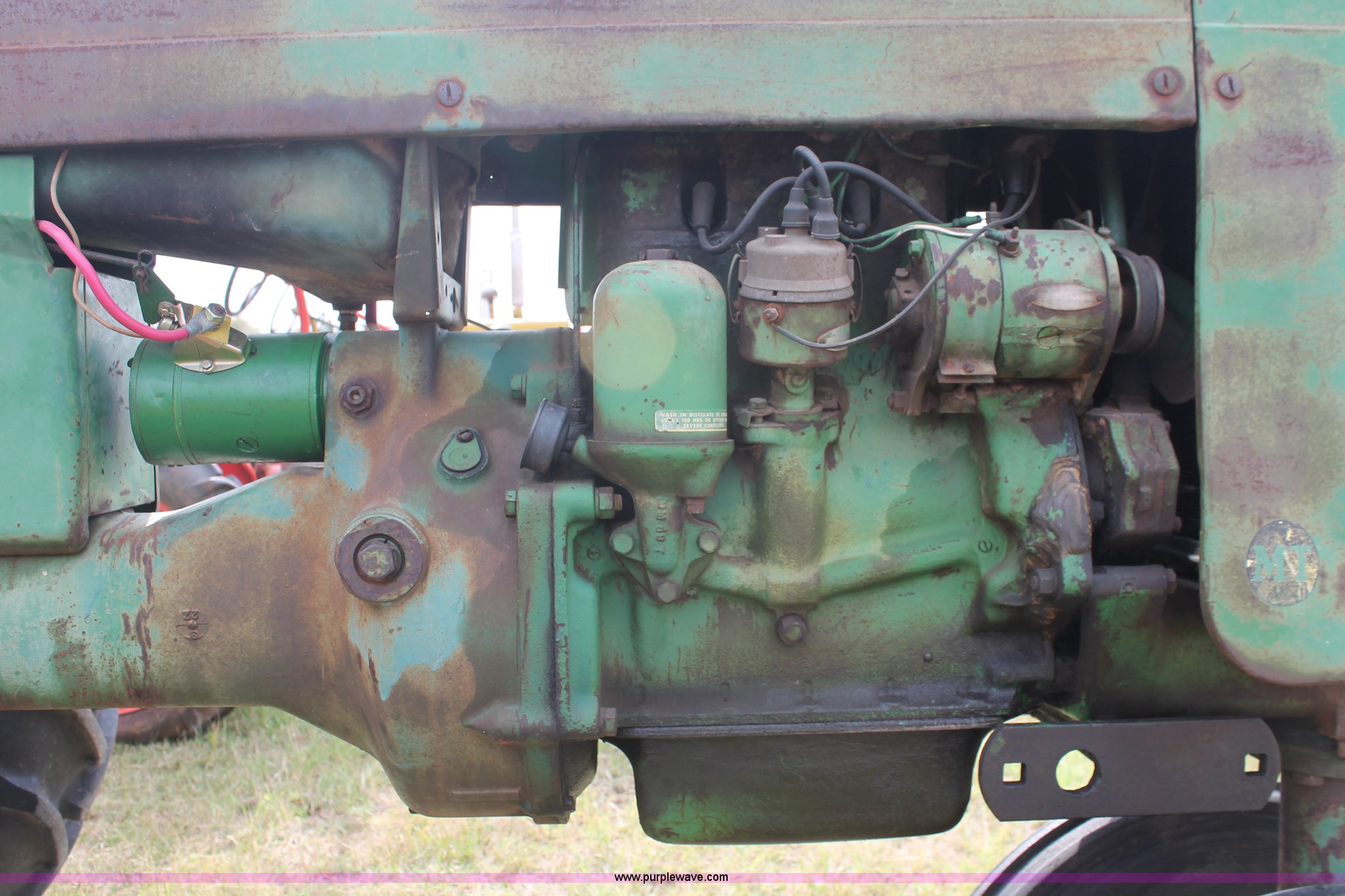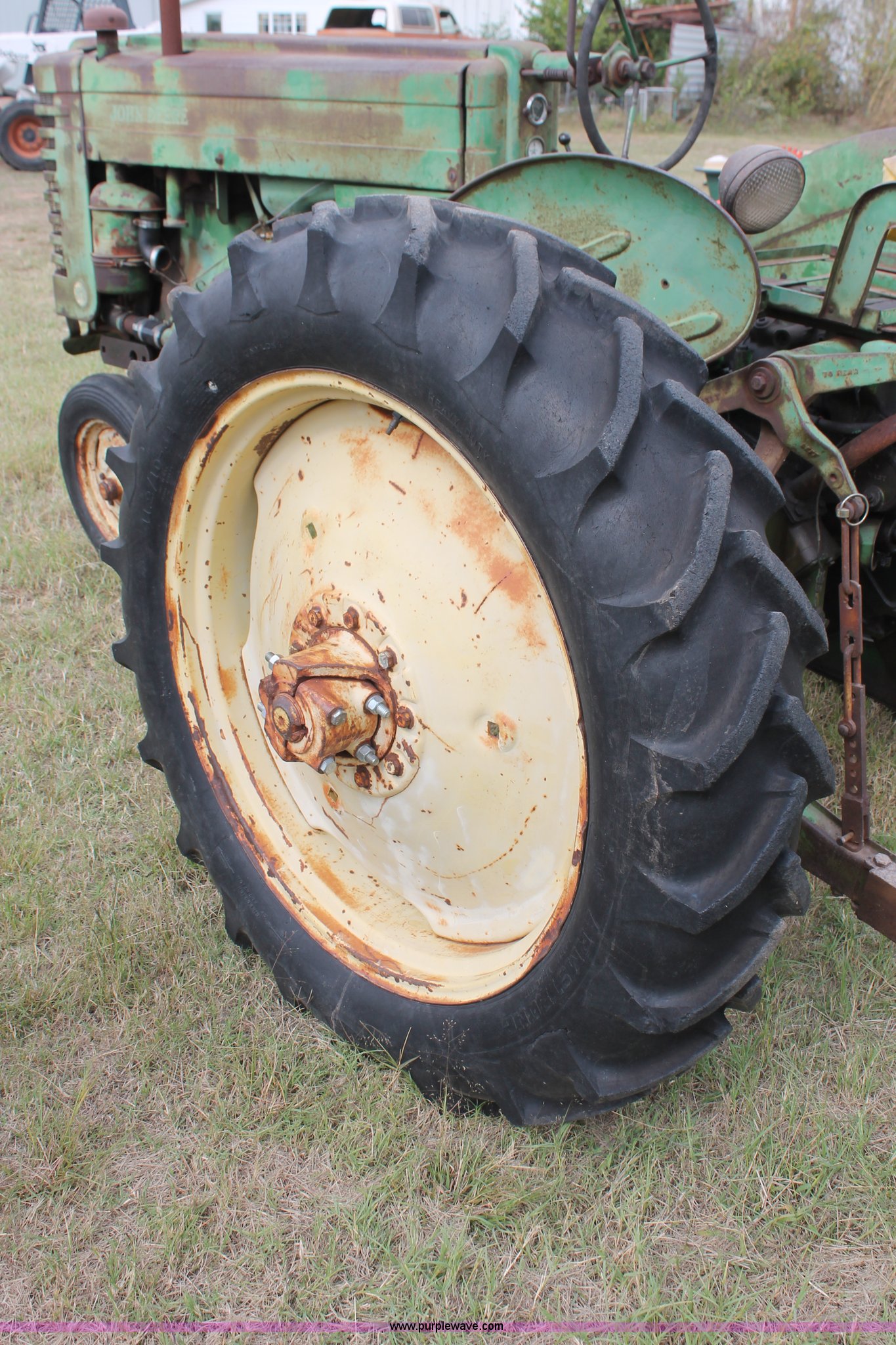 Purple Wave is selling a used Tractor in Oklahoma. This item is a 1951 John Deere MT tractor with the following: John Deere 1.6L two cylinder gas engine, Manual transmission, 8F-2R gears, Electric start, Two point, 540 PTO, Rear hydraulic remotes, Nine gallon fuel tank, 5.00-15 front tires, 11.2/10-34 rear tires, 3,183 lbs. base operating weight, Carburetor included, No battery, Serial 29009