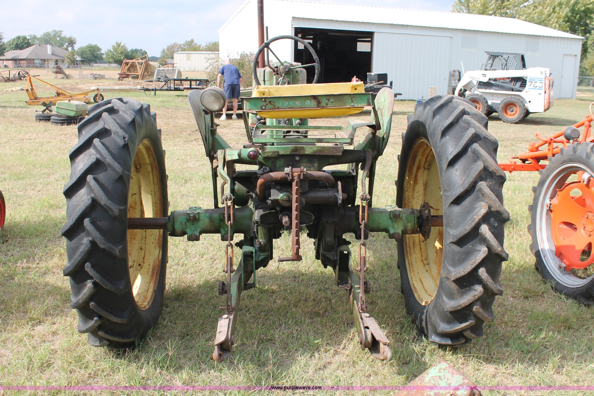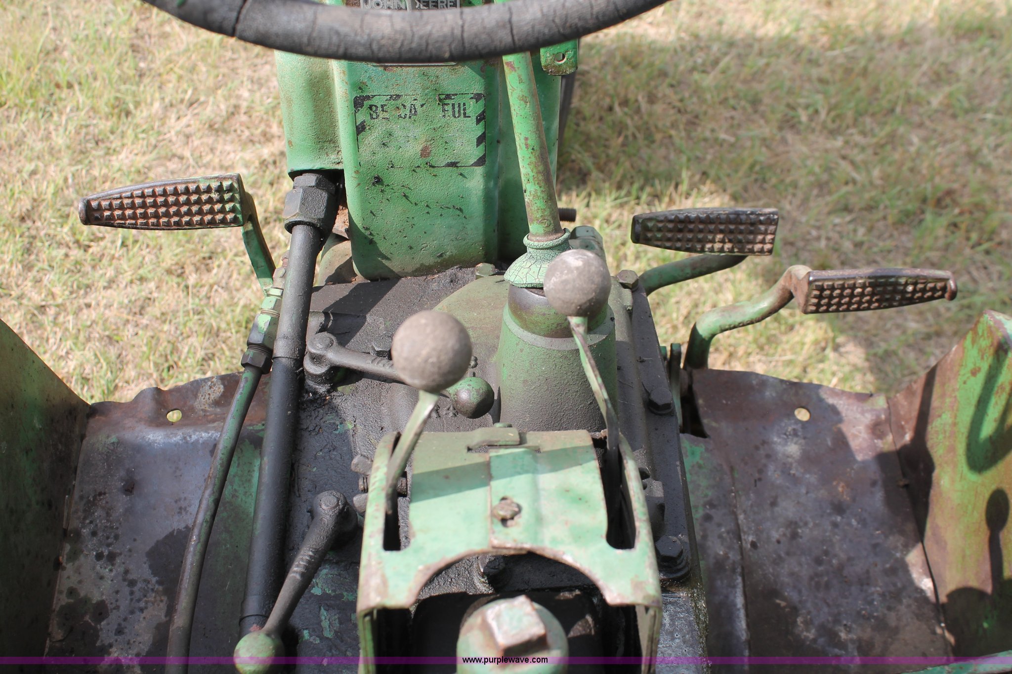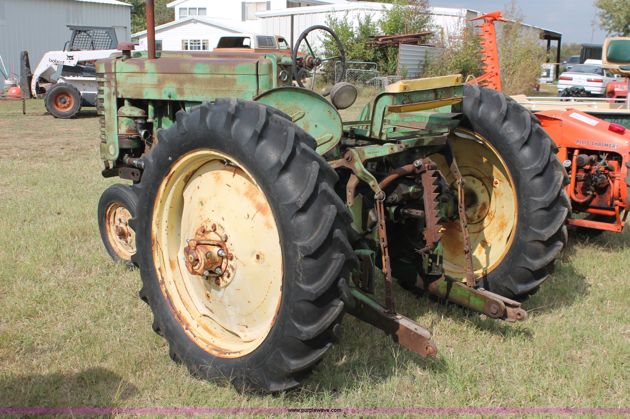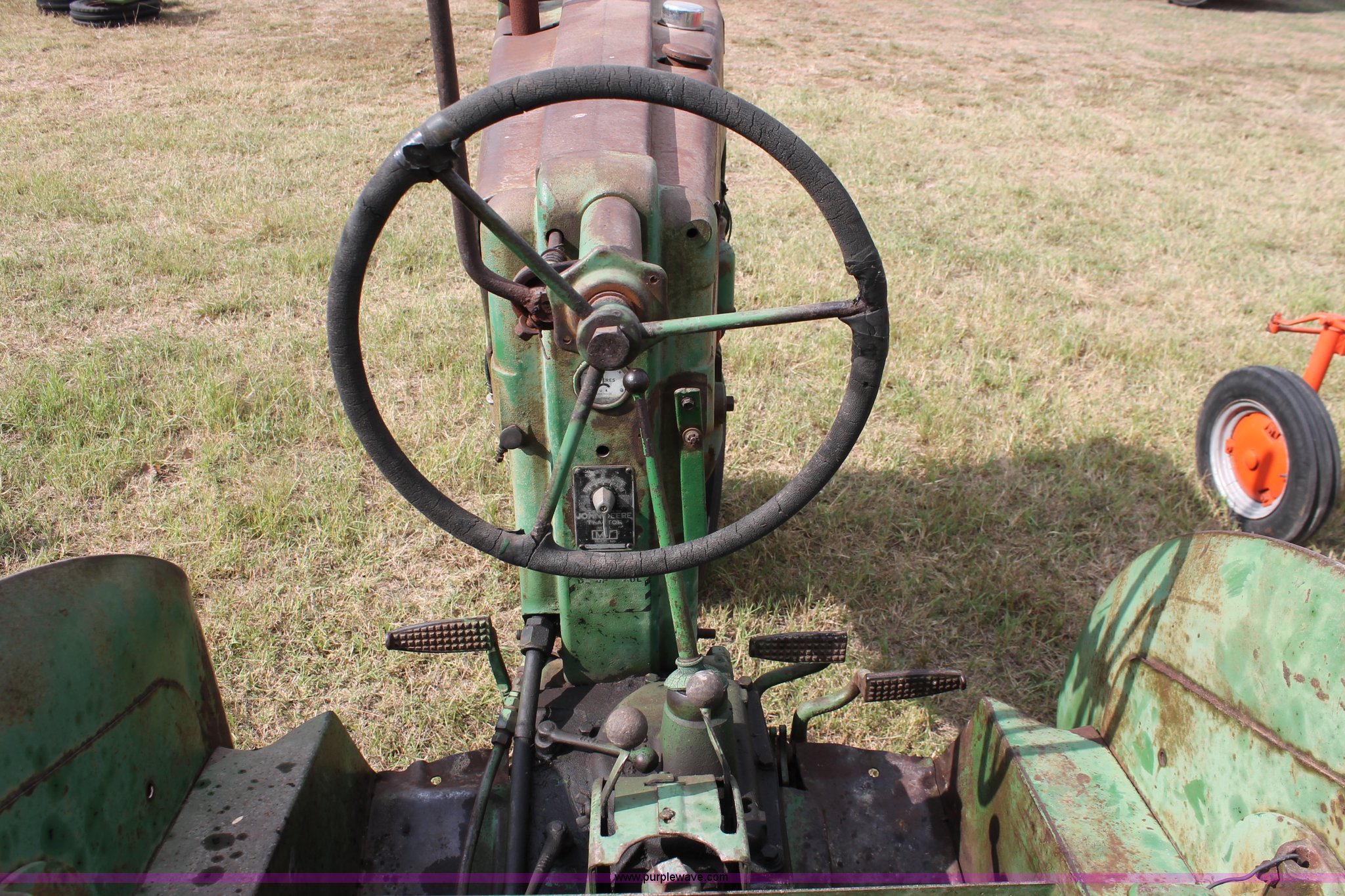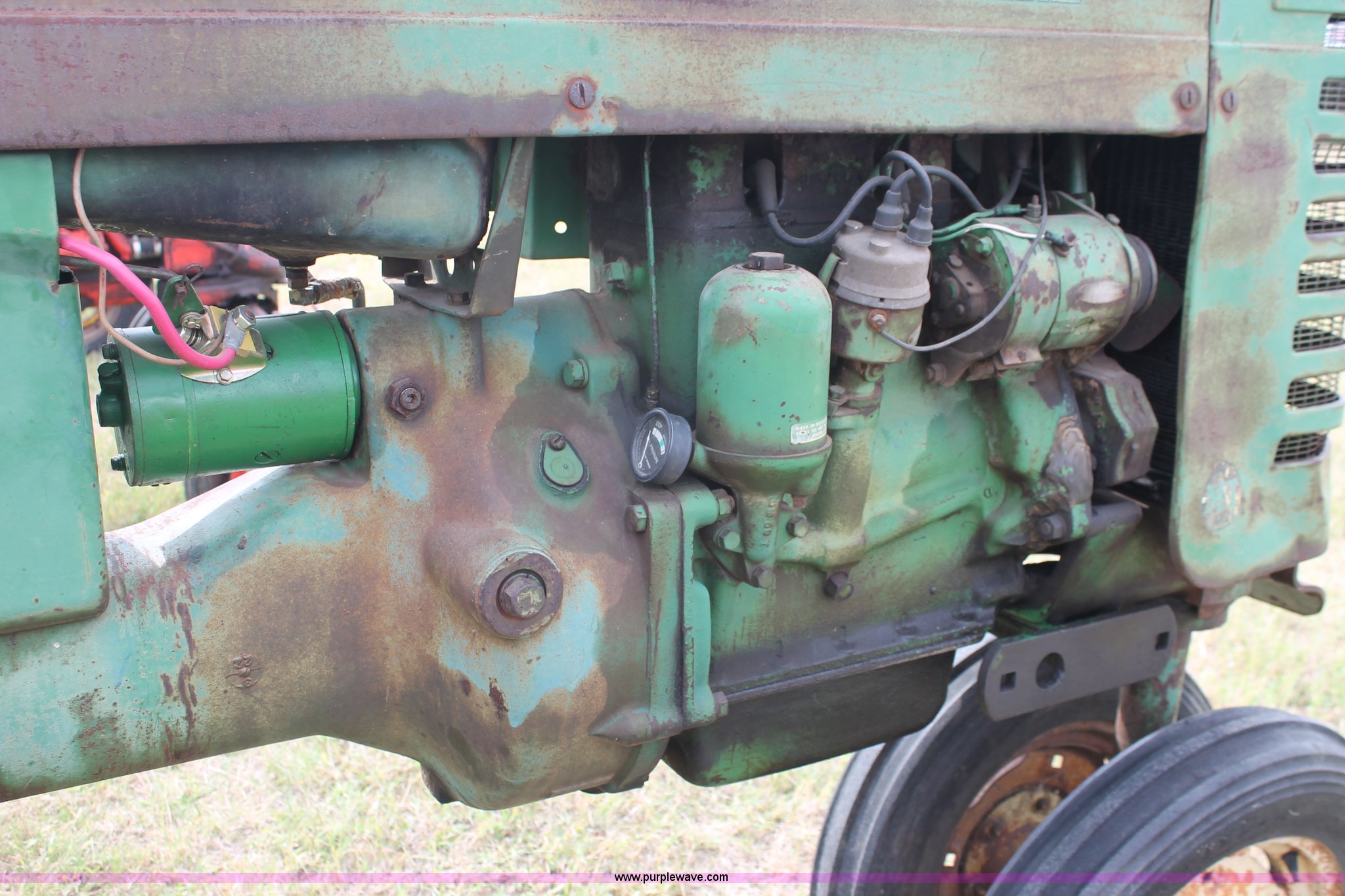 Purple Wave is selling a used Tractor in Oklahoma. This item is a 1951 John Deere MT tractor with the following: John Deere 1.6L two cylinder gas engine, Manual transmission, 8F-2R gears, Electric start, Two point, 540 PTO, Rear hydraulic remotes, Nine gallon fuel tank, 5.00-15 front tires, 11.2/10-34 rear tires, 3,183 lbs. base operating weight, Carburetor included, No battery, Serial 29009