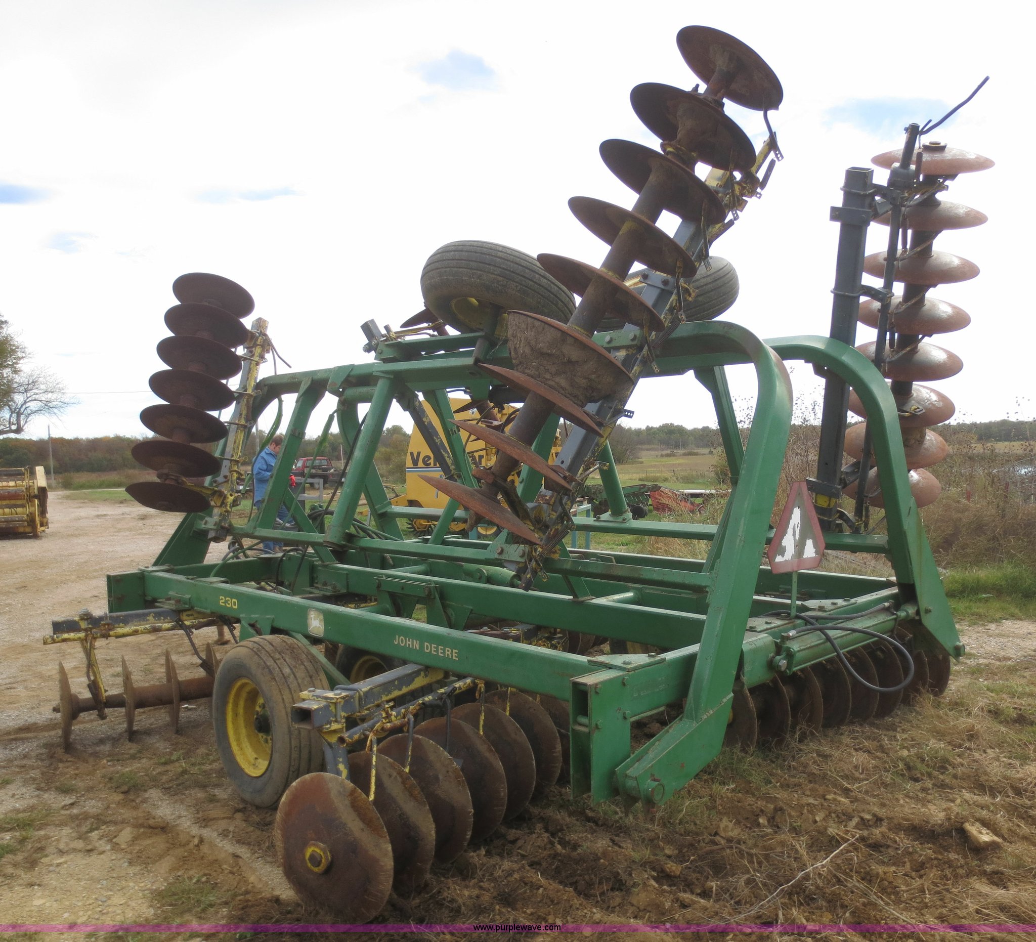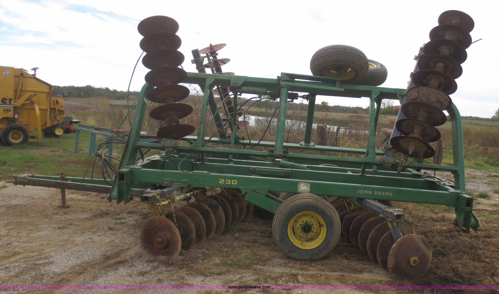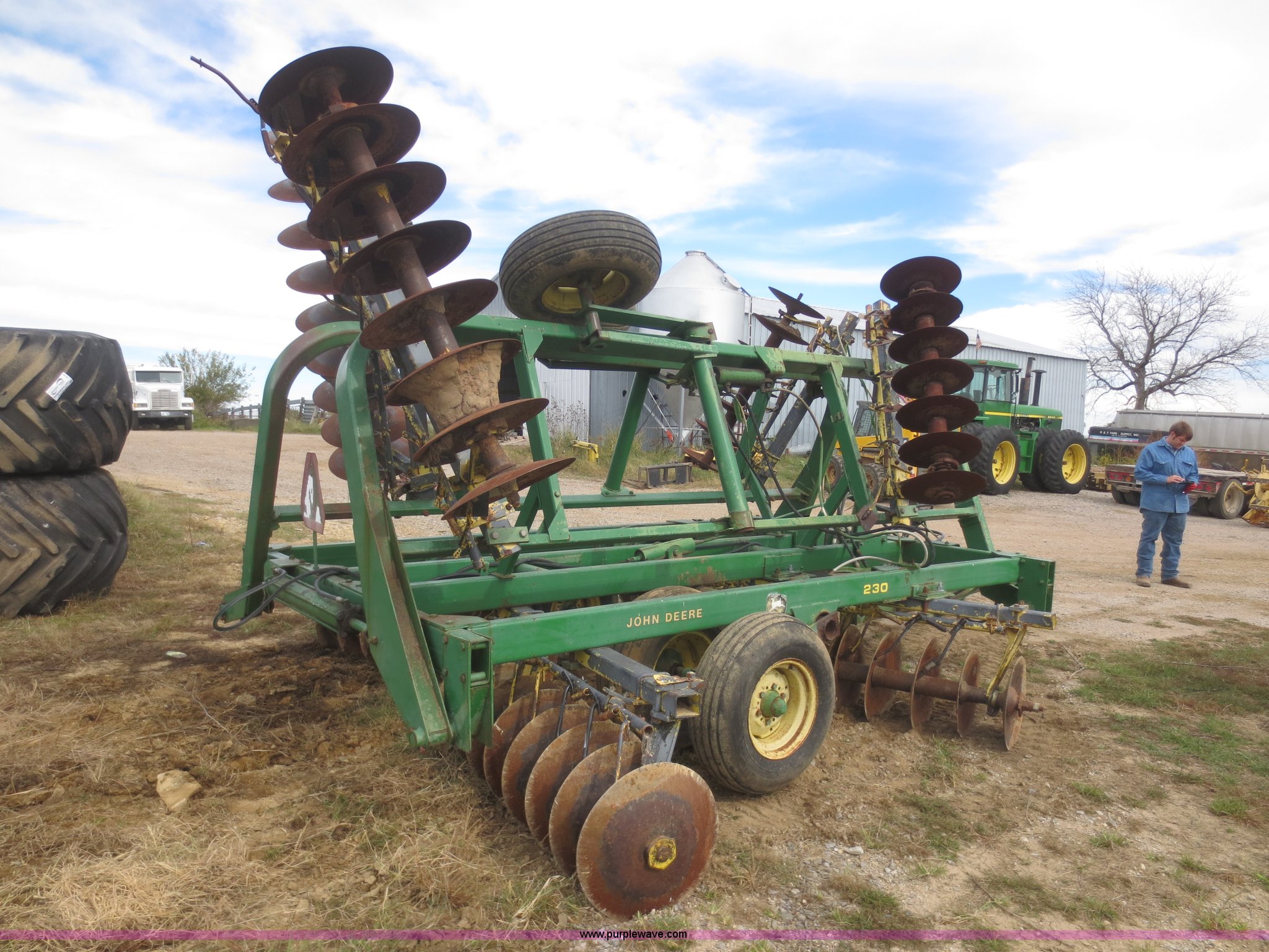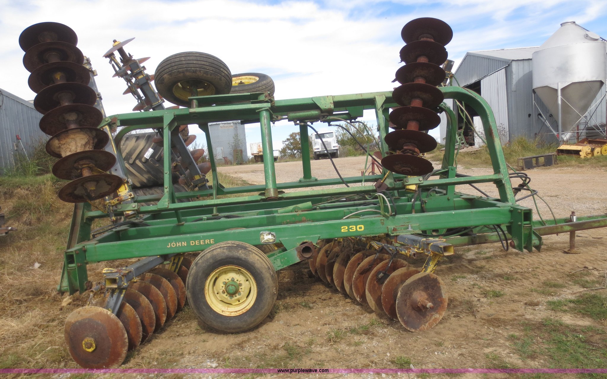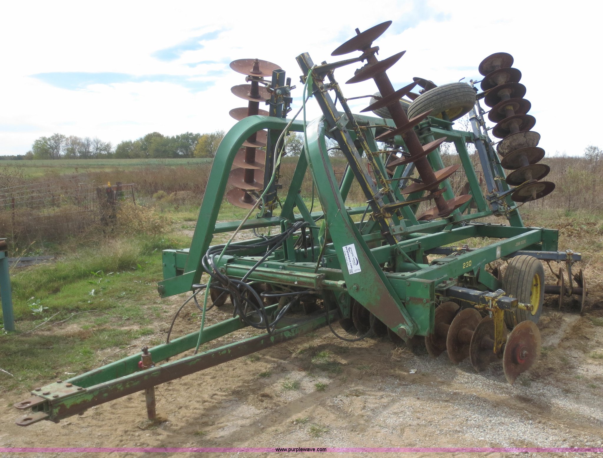 Purple Wave is selling a used Disk in Kansas. This item is a John Deere 230 disk with the following: 23'W, Hydraulic fold, Pin hitch, 14" front disks, 20" rear disks, 11L-15 tires, Main beam broken, Serial 018287