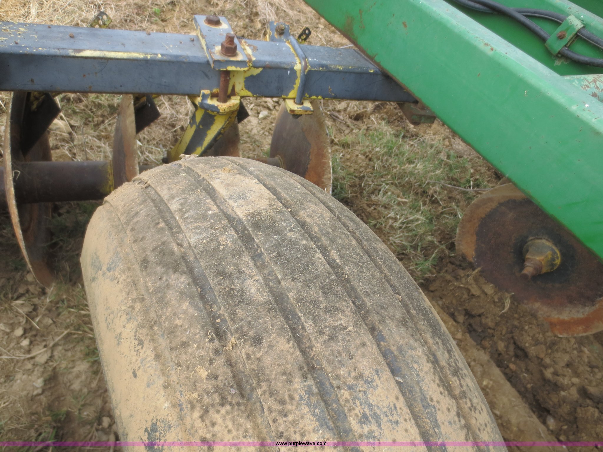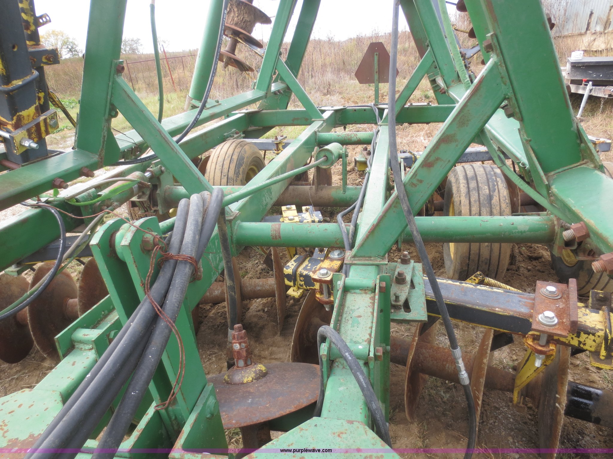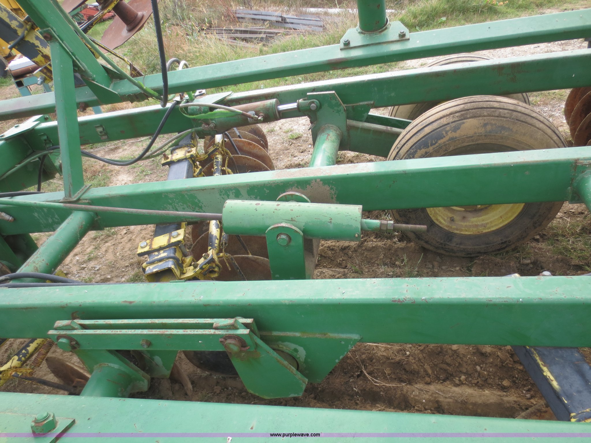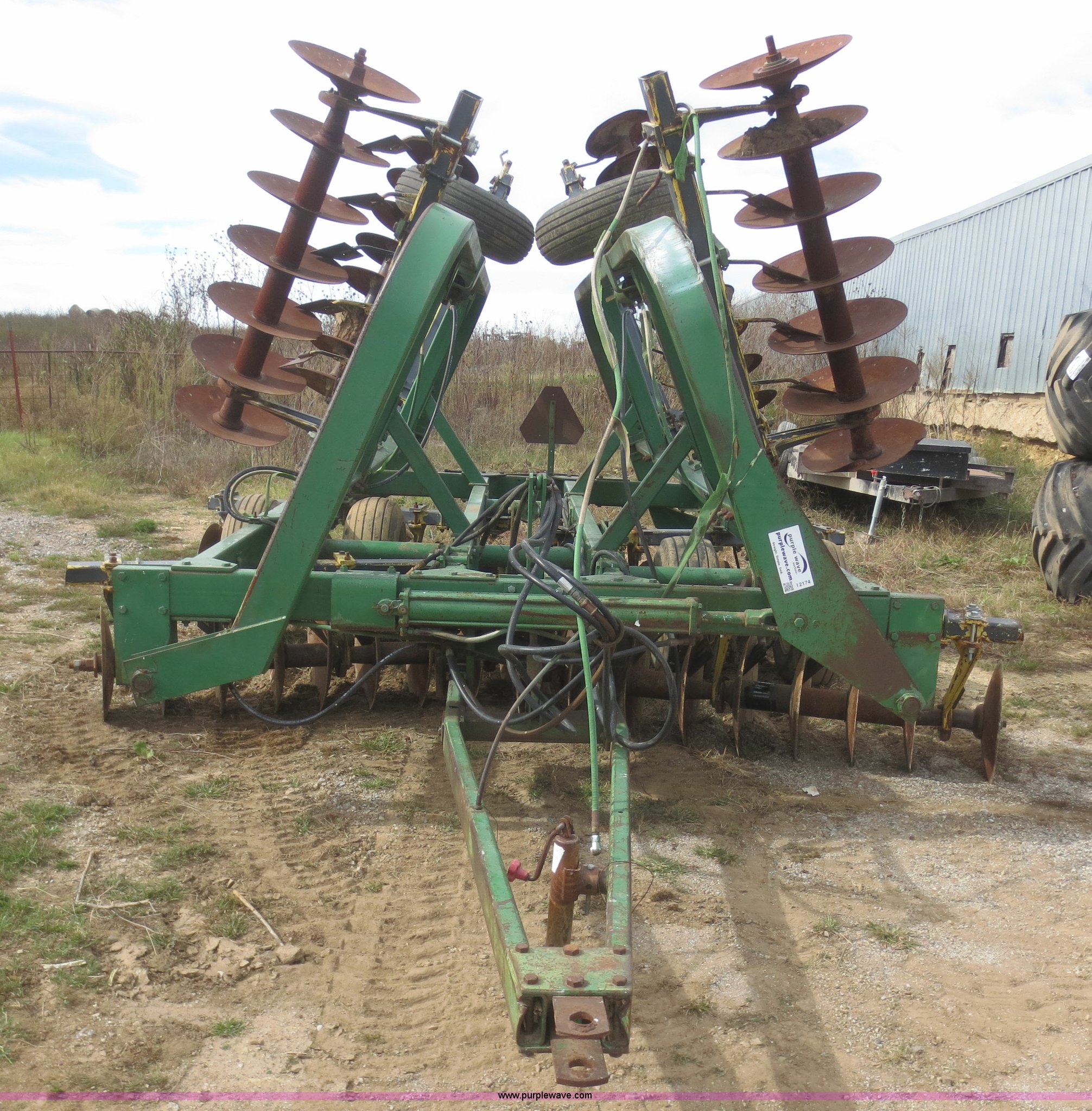 Purple Wave is selling a used Disk in Kansas. This item is a John Deere 230 disk with the following: 23'W, Hydraulic fold, Pin hitch, 14" front disks, 20" rear disks, 11L-15 tires, Main beam broken, Serial 018287