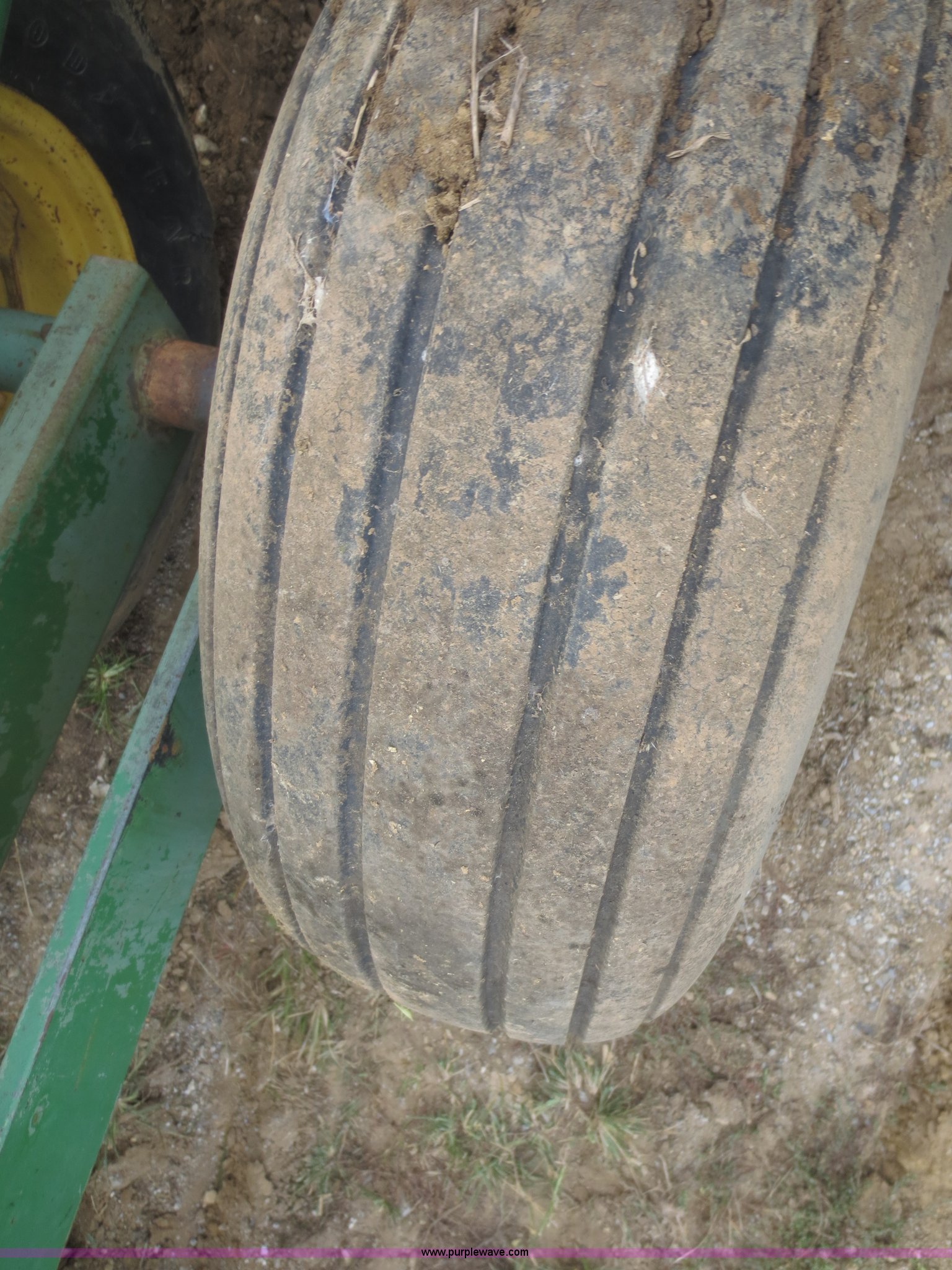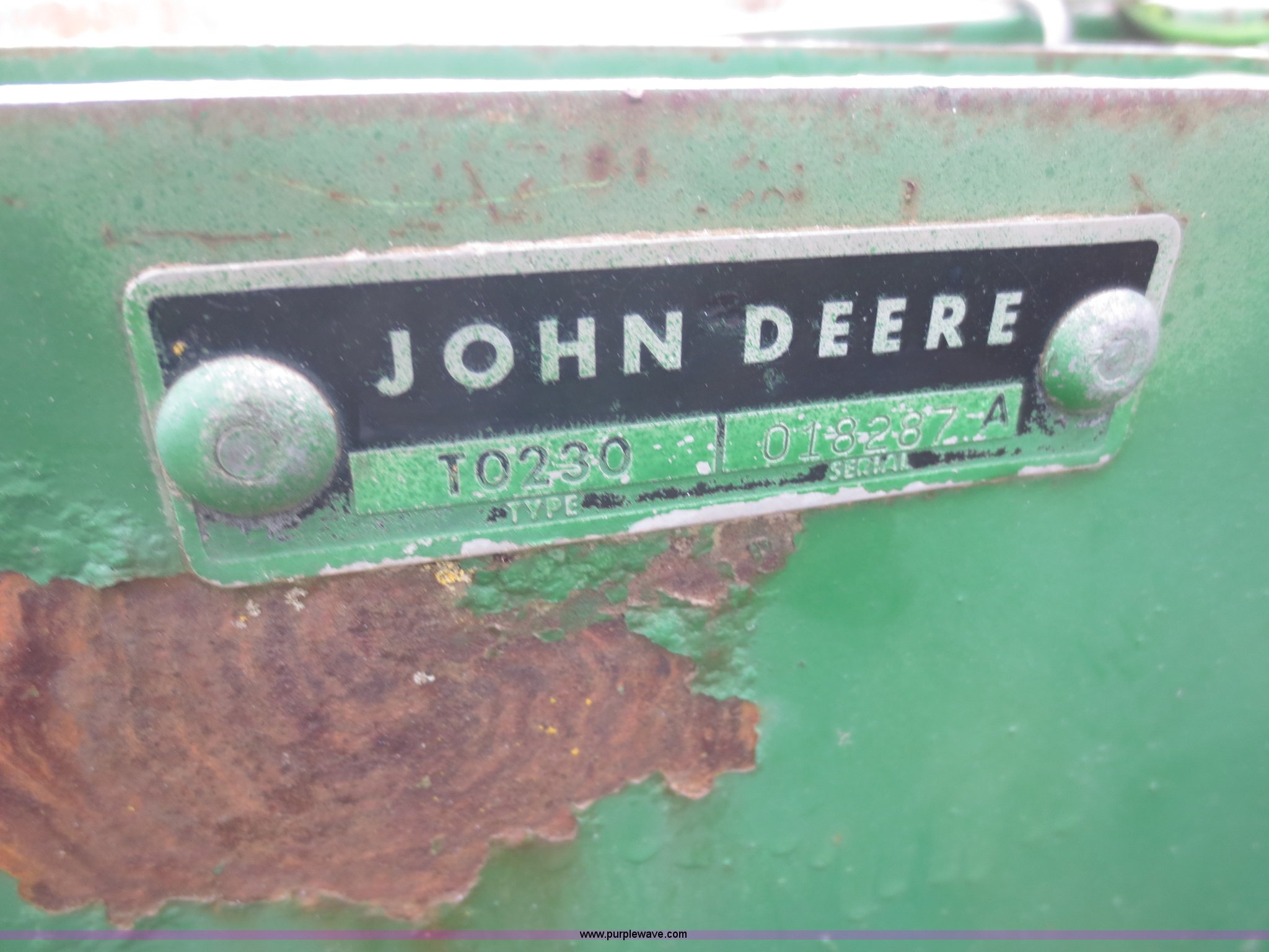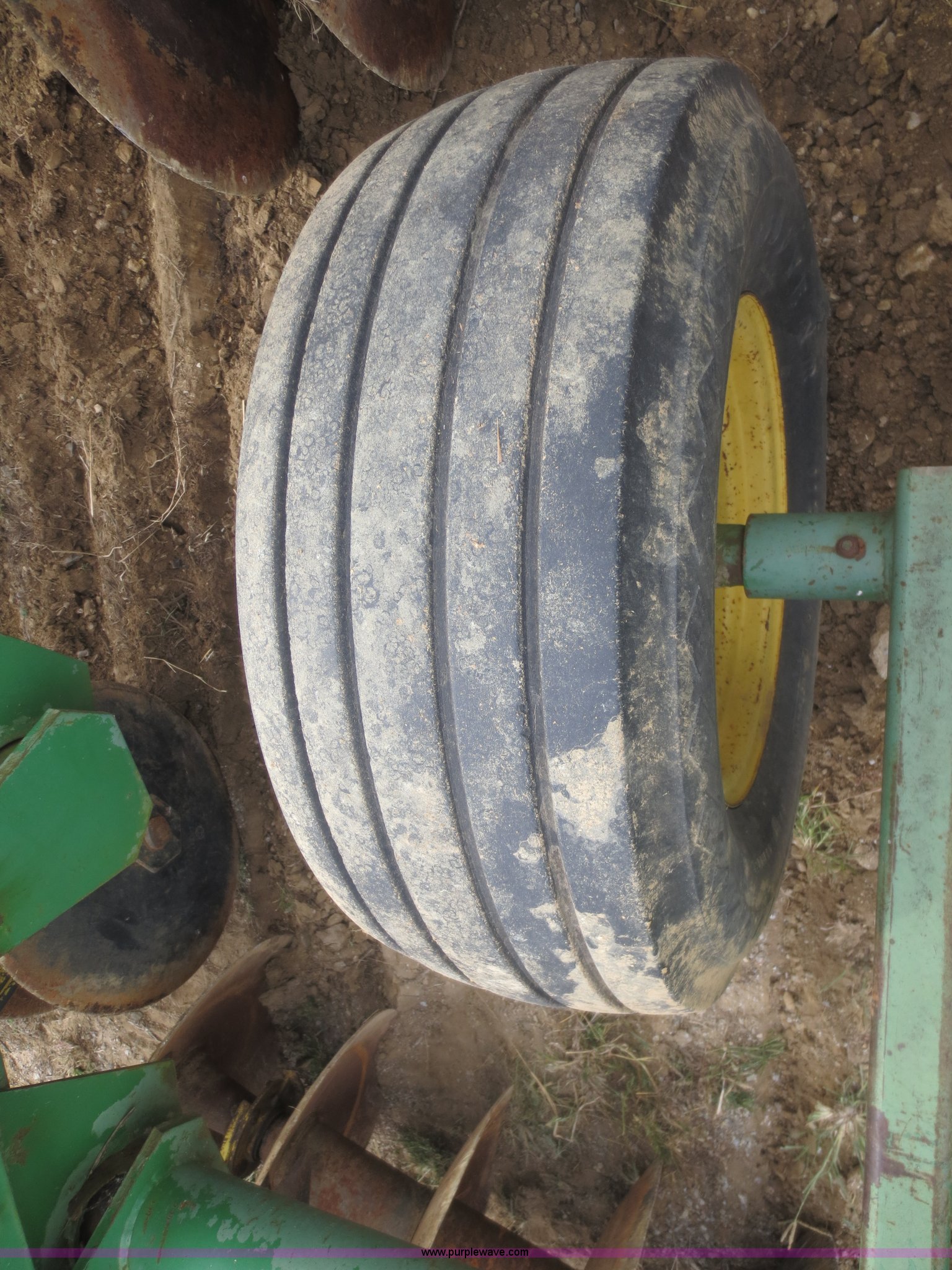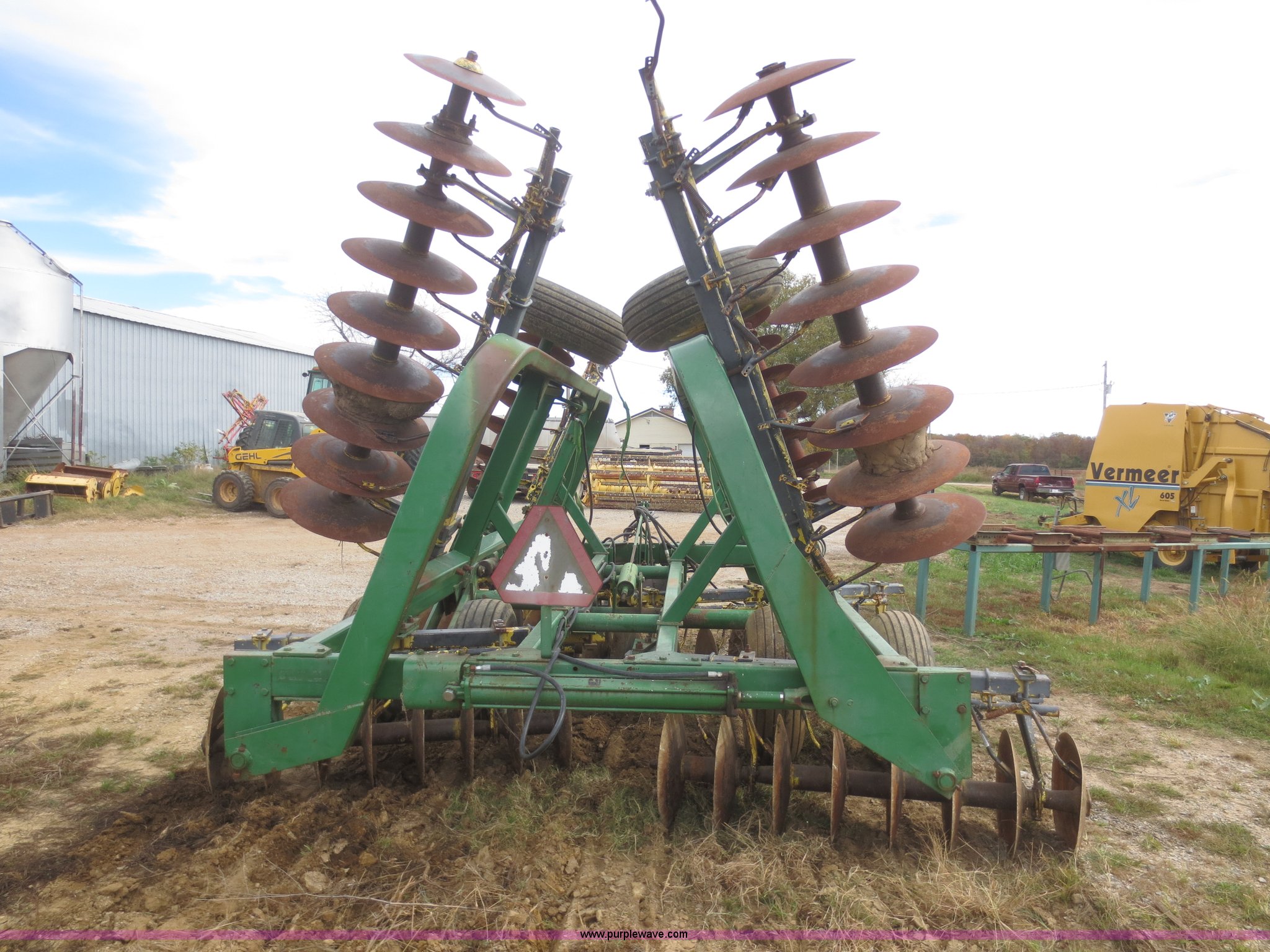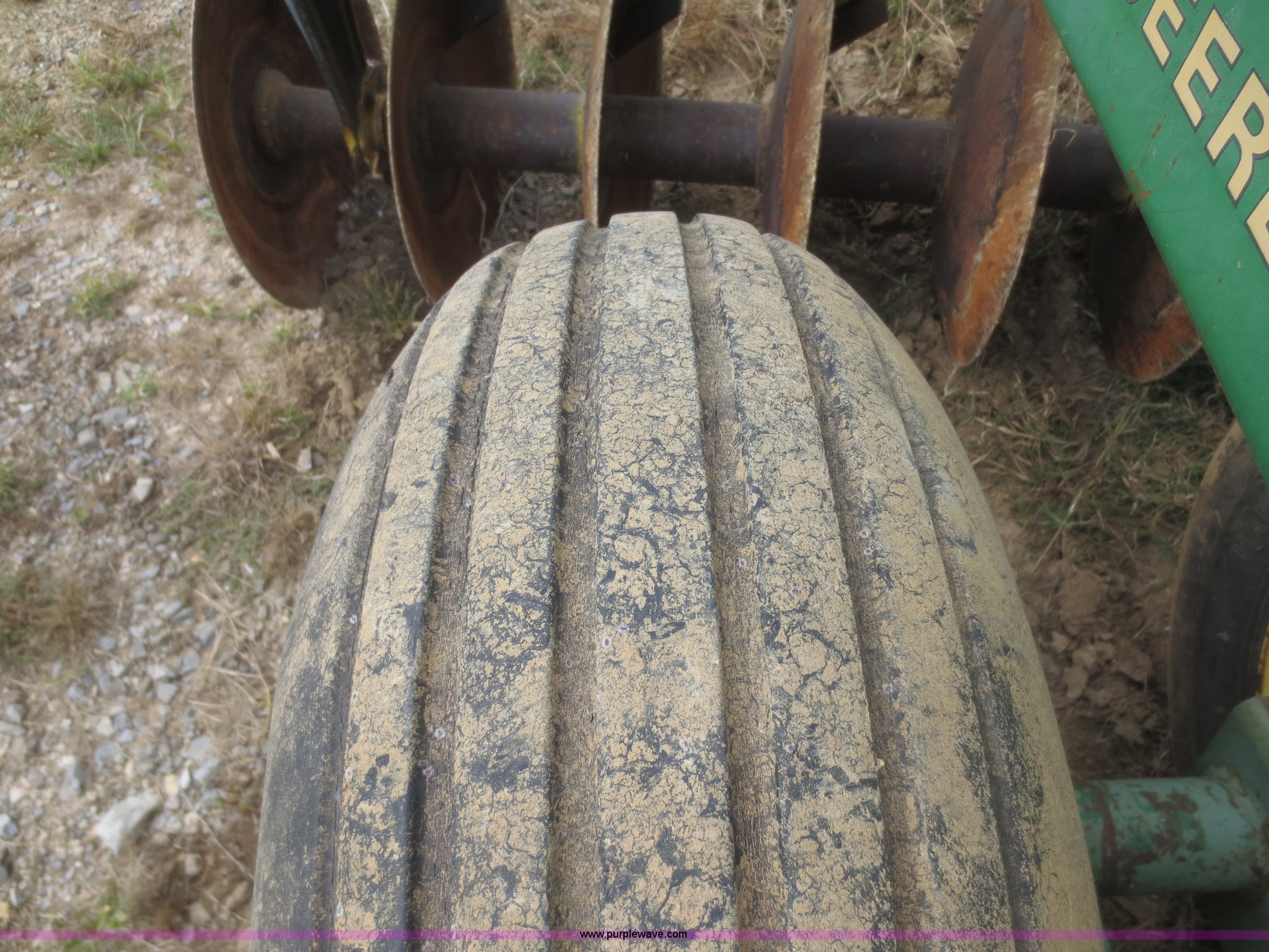 Purple Wave is selling a used Disk in Kansas. This item is a John Deere 230 disk with the following: 23'W, Hydraulic fold, Pin hitch, 14" front disks, 20" rear disks, 11L-15 tires, Main beam broken, Serial 018287