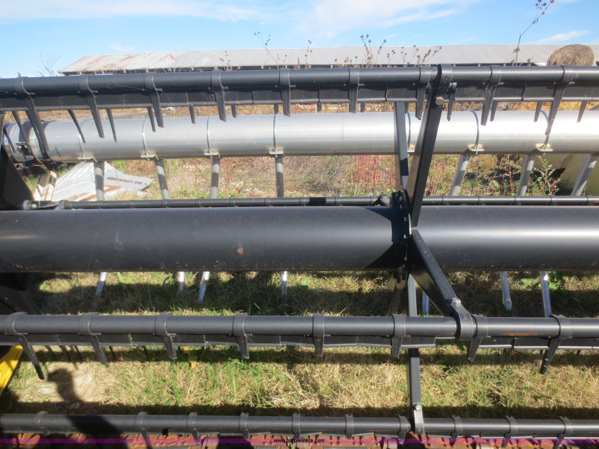 New Holland 74C flex head. 30'W, 3" sections, Plastic fingers on pipe reel, Full finger auger, Hydraulic quick connect, Set up for CR series, Crary CWS air reel not included, Serial PNL017400. Sammons Farms. 14375 York. Walnut, KS 66780