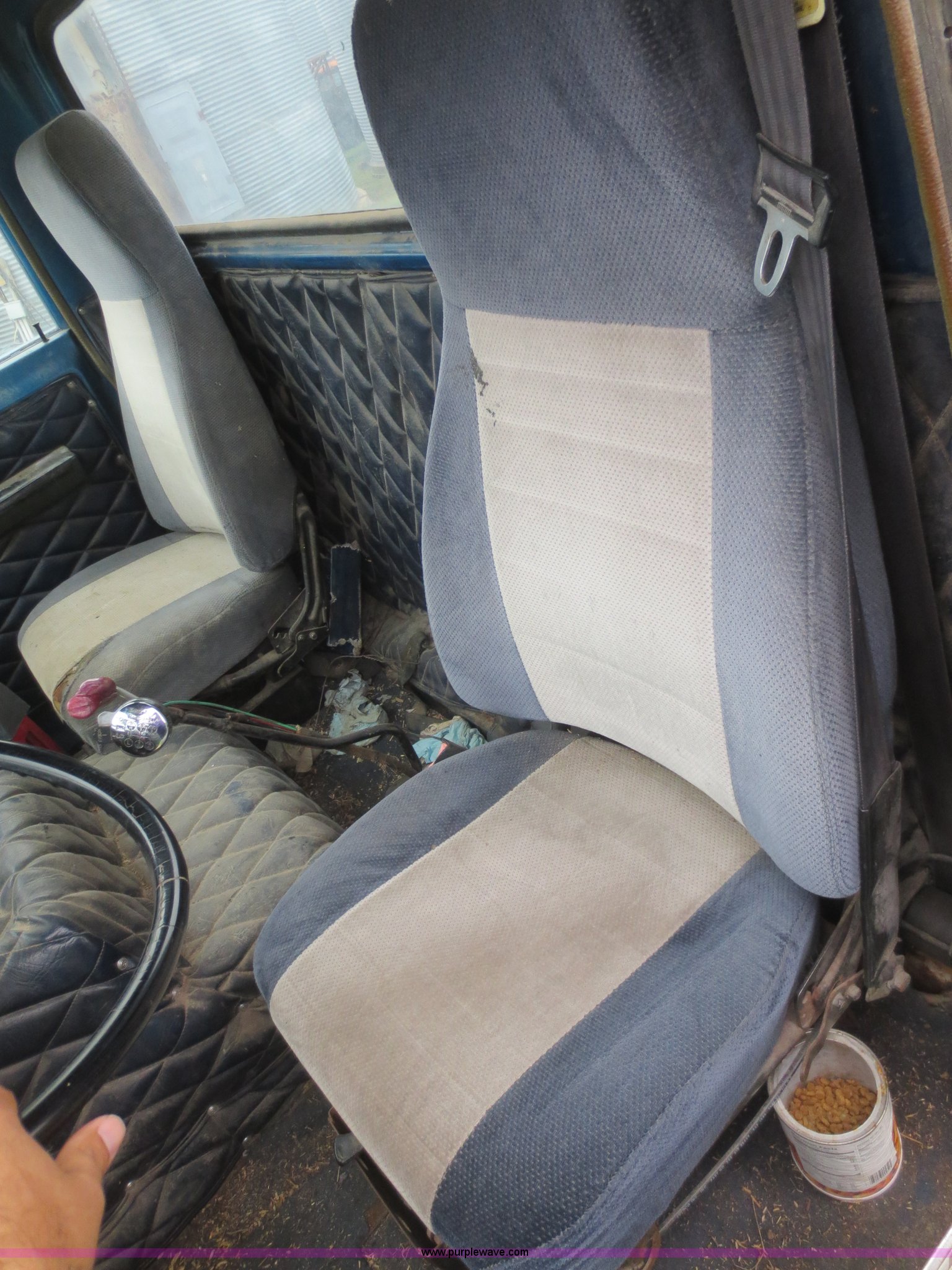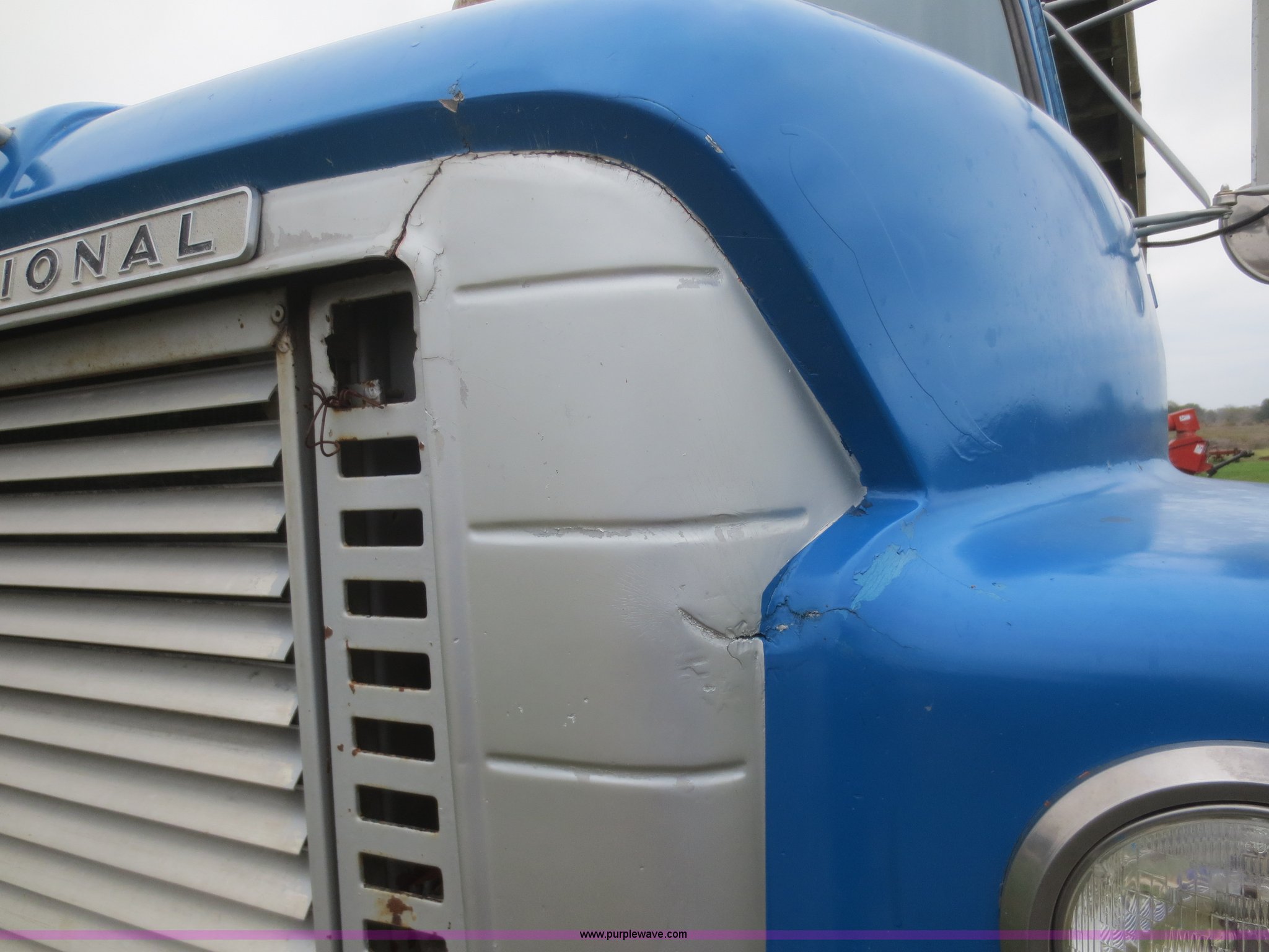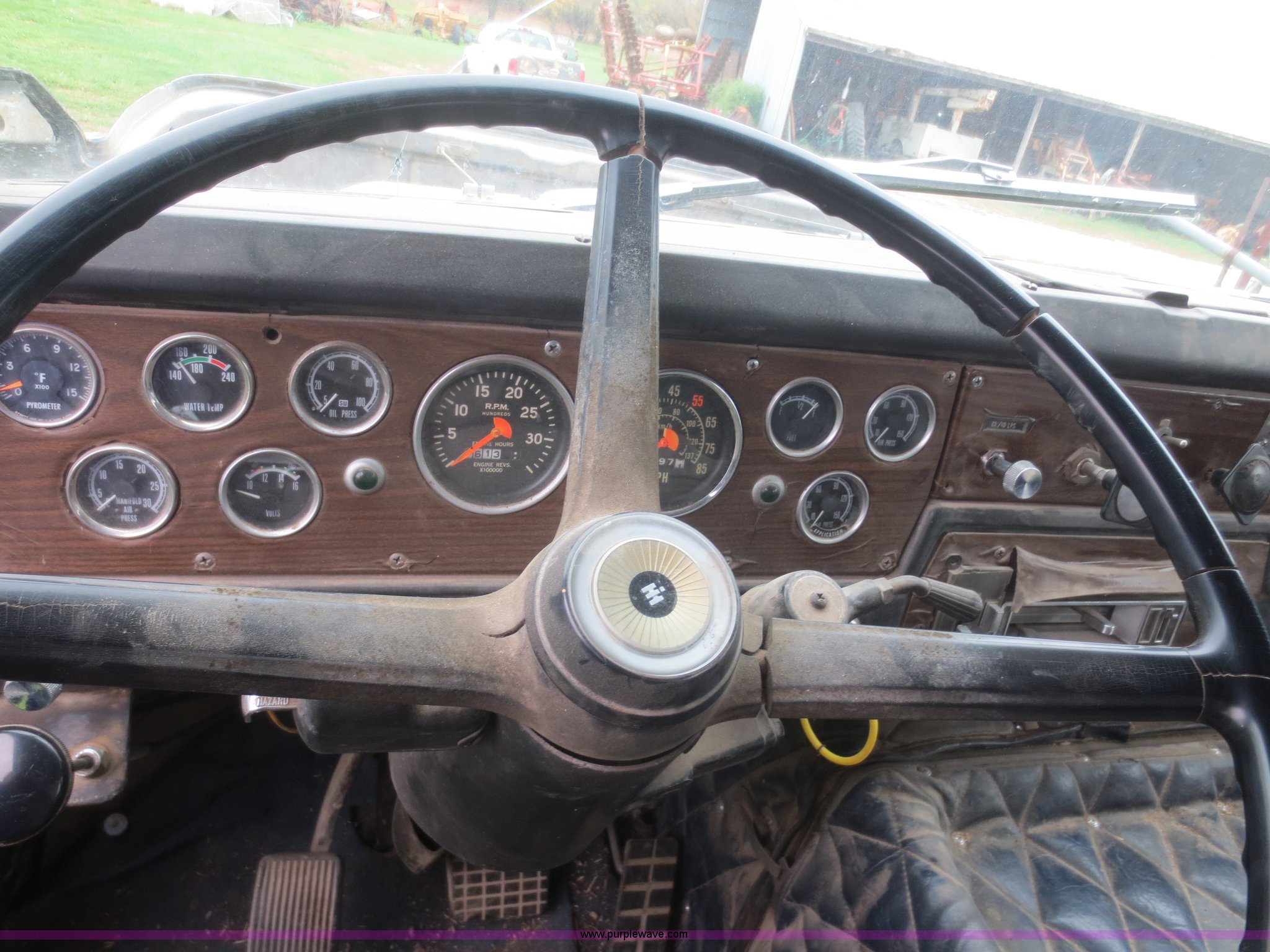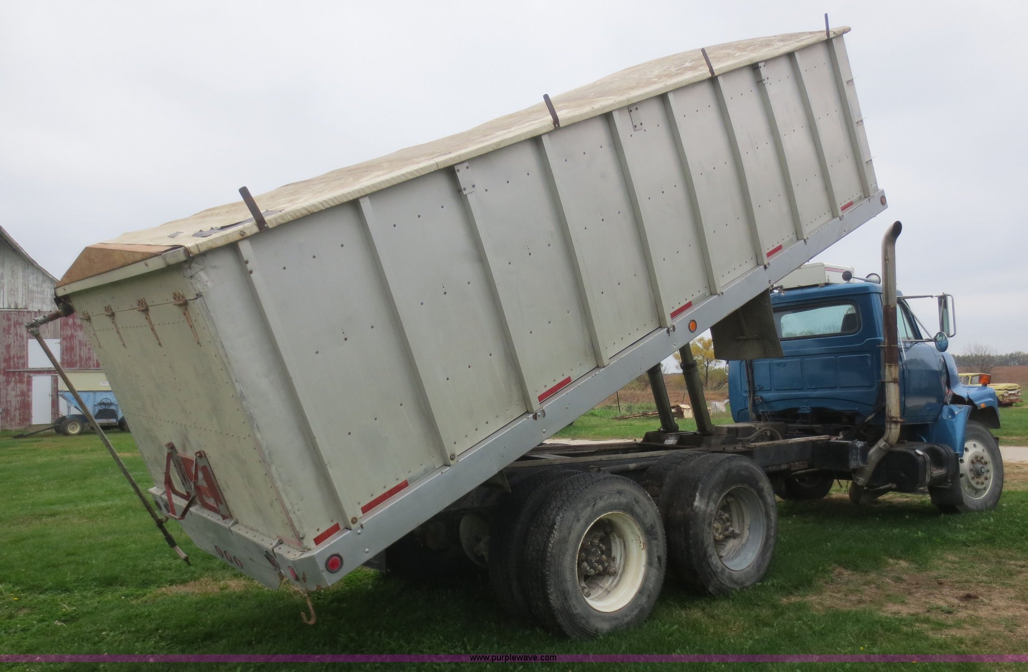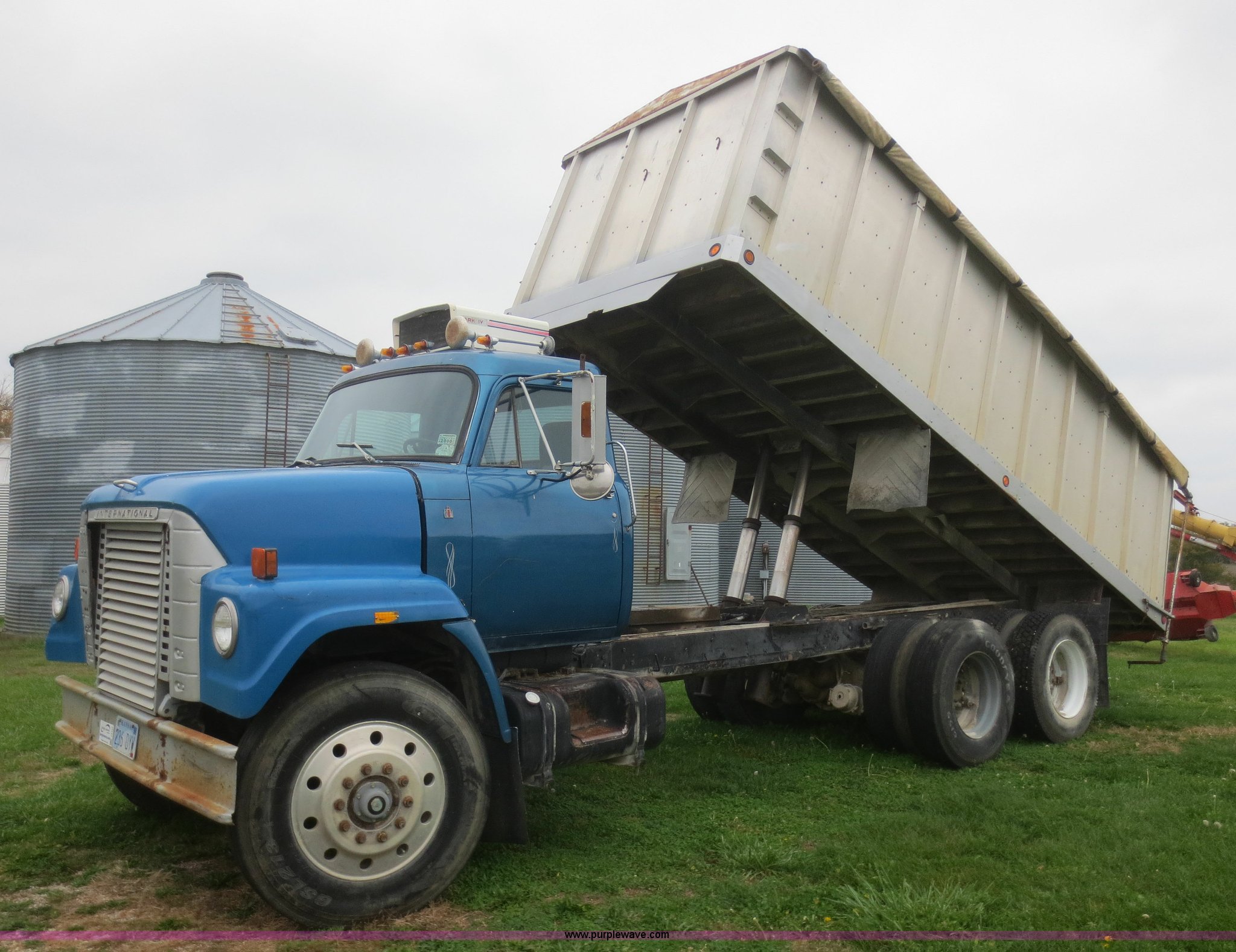 Purple Wave is selling a used Grain Truck in Kansas. This item is a 1975 International F2070A grain truck with the following: 63,297 miles on odometer, Cummins 855 C.I.D. six cylinder turbo diesel engine, 290 HP, 13 speed manual transmission, AC and heat, AC needs charged, 20' aluminum bed, Twin lift cylinders, Manual end gate, Chelsea PTO, Hendrickson spring suspension, 11R22.5 tires, 48,500 lbs, Cracked windshield, Truck was laid on its side, Frame bent/twisted